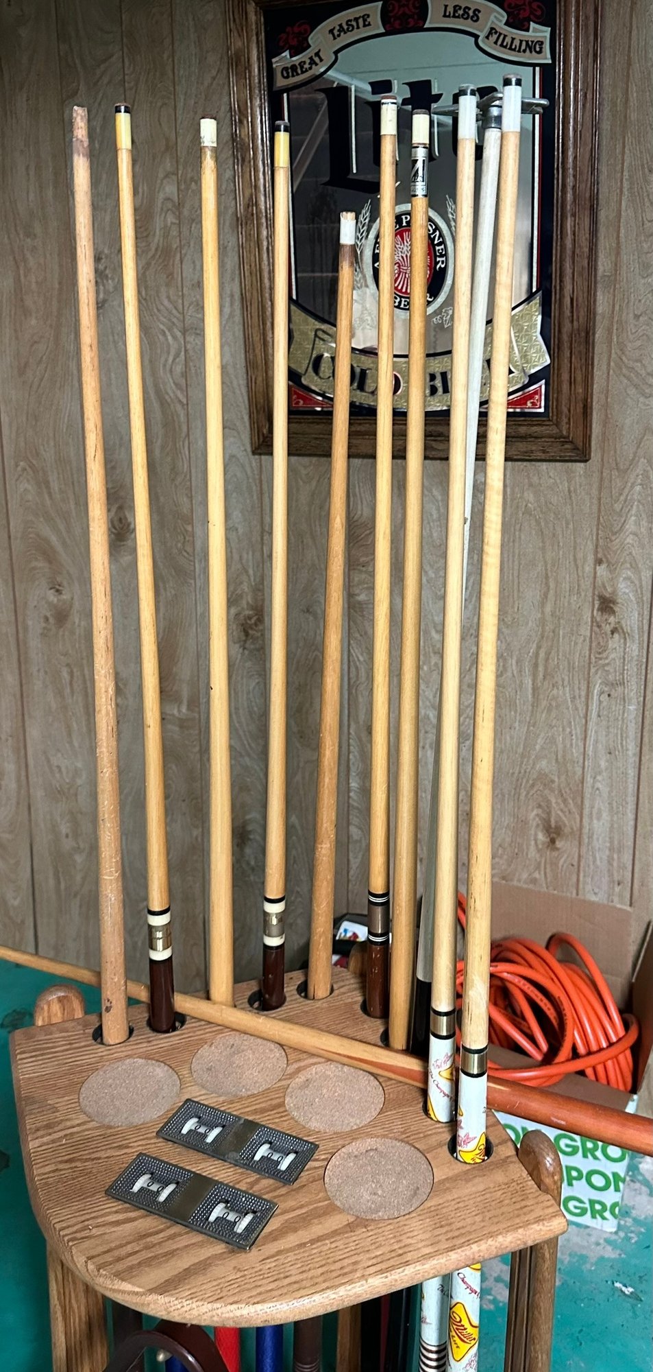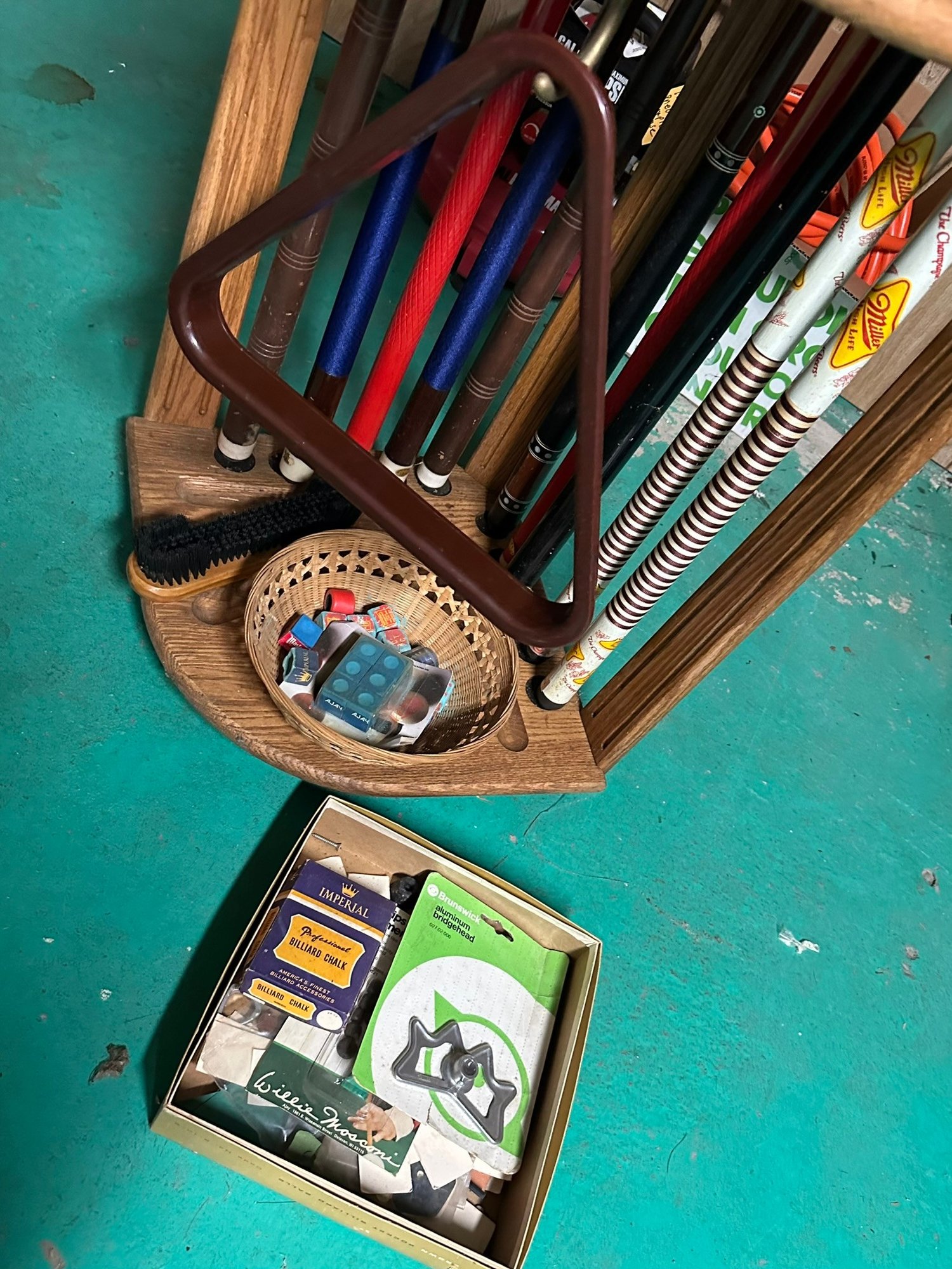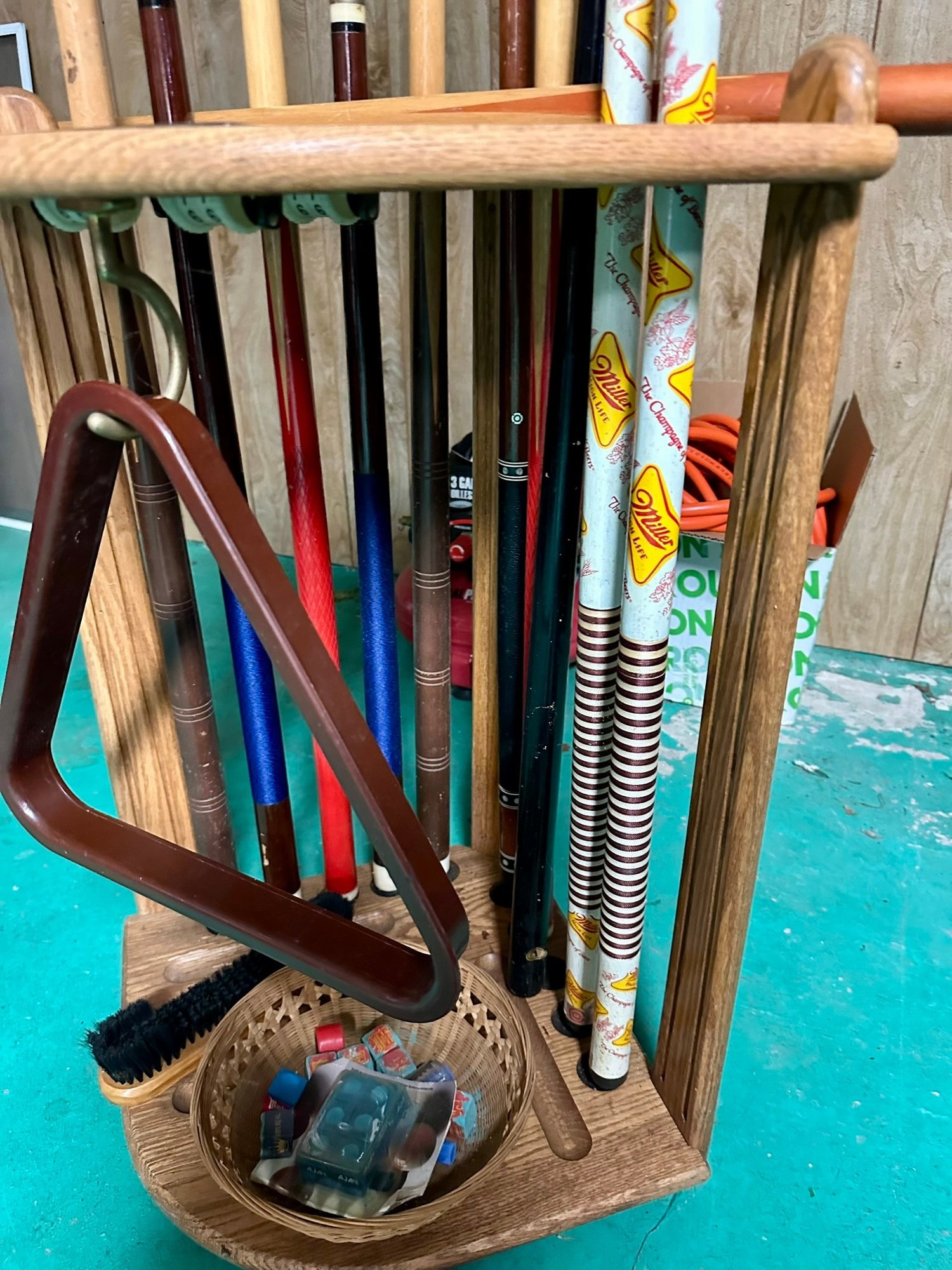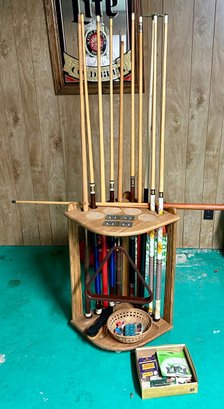 Pool Cue Stand With Cues, Triangle And Accessories (136)