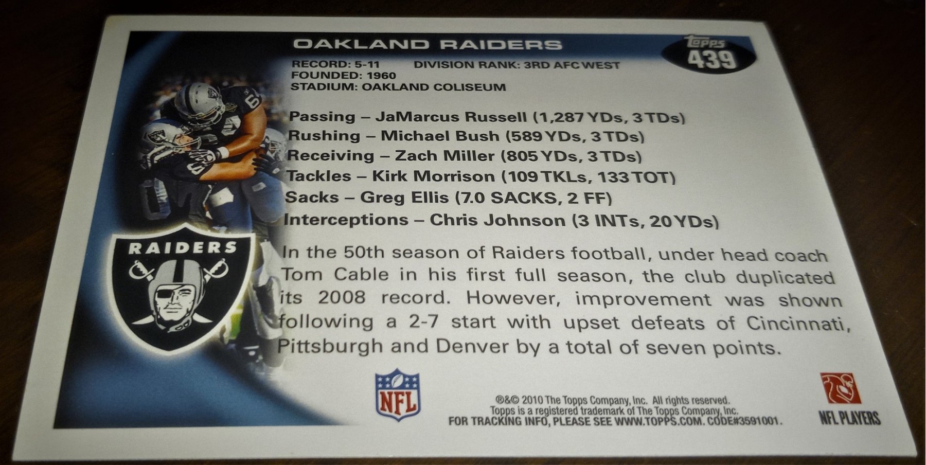 A vintage card of the iconic "Silver & Black"...Oakland Raiders!
