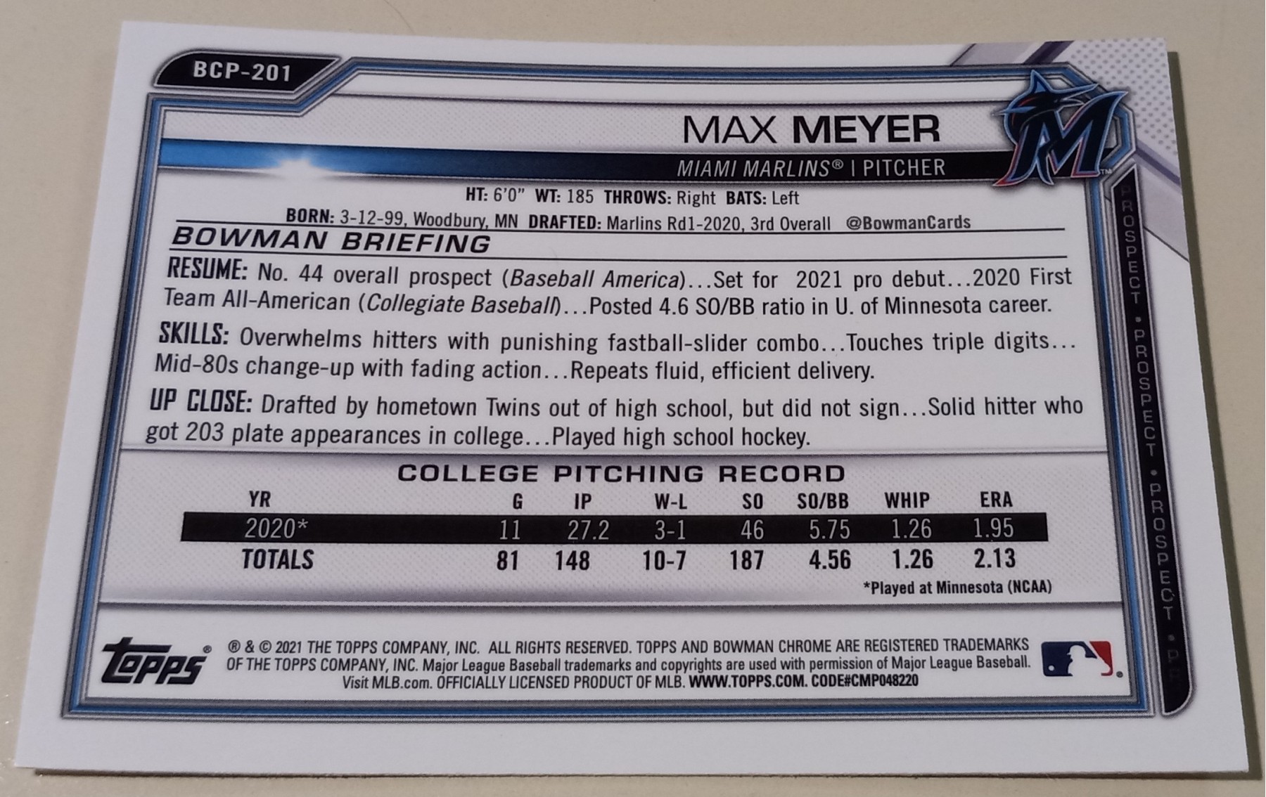 A top pitching prospect for the Marlins! A beautiful mojo refractor card.