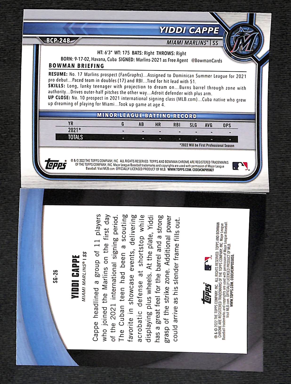 A great 2-card lot from the Bowman 2022 edition of this young star for the Miami Marlins...