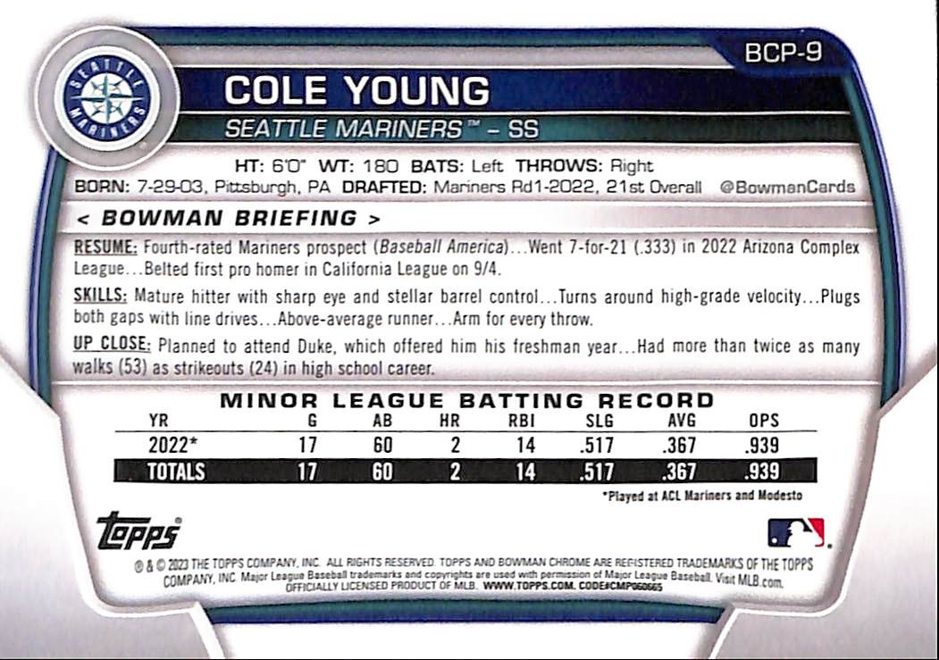 2023 Bowman Chrome: Cole Young "Black Parallel" Edition