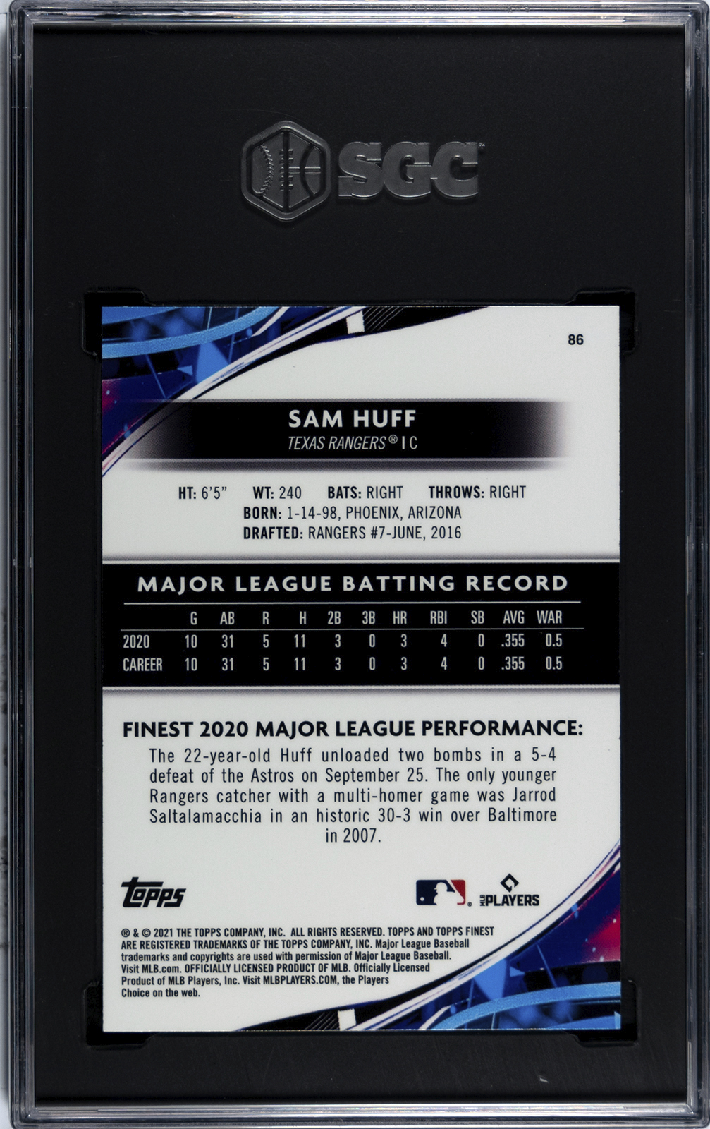 A gleaming SGC Gem Mint "10" of this powerful catcher and rookie phenom Sam Huff!