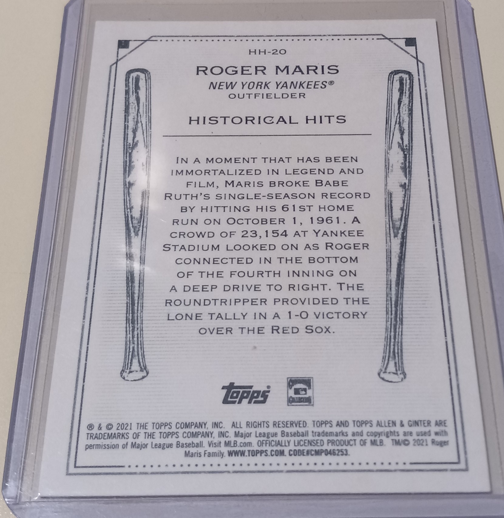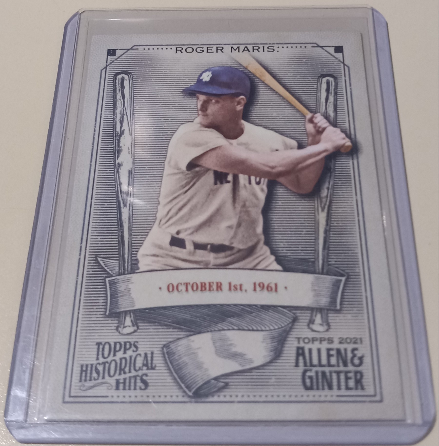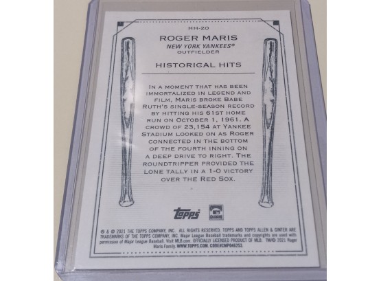 A brilliant historical Topps hits for Roger Maris breaking Babe Ruth's single season homerun record on October 1st, 1961 with his 61st homerun of the season.