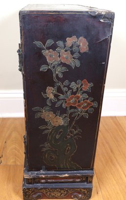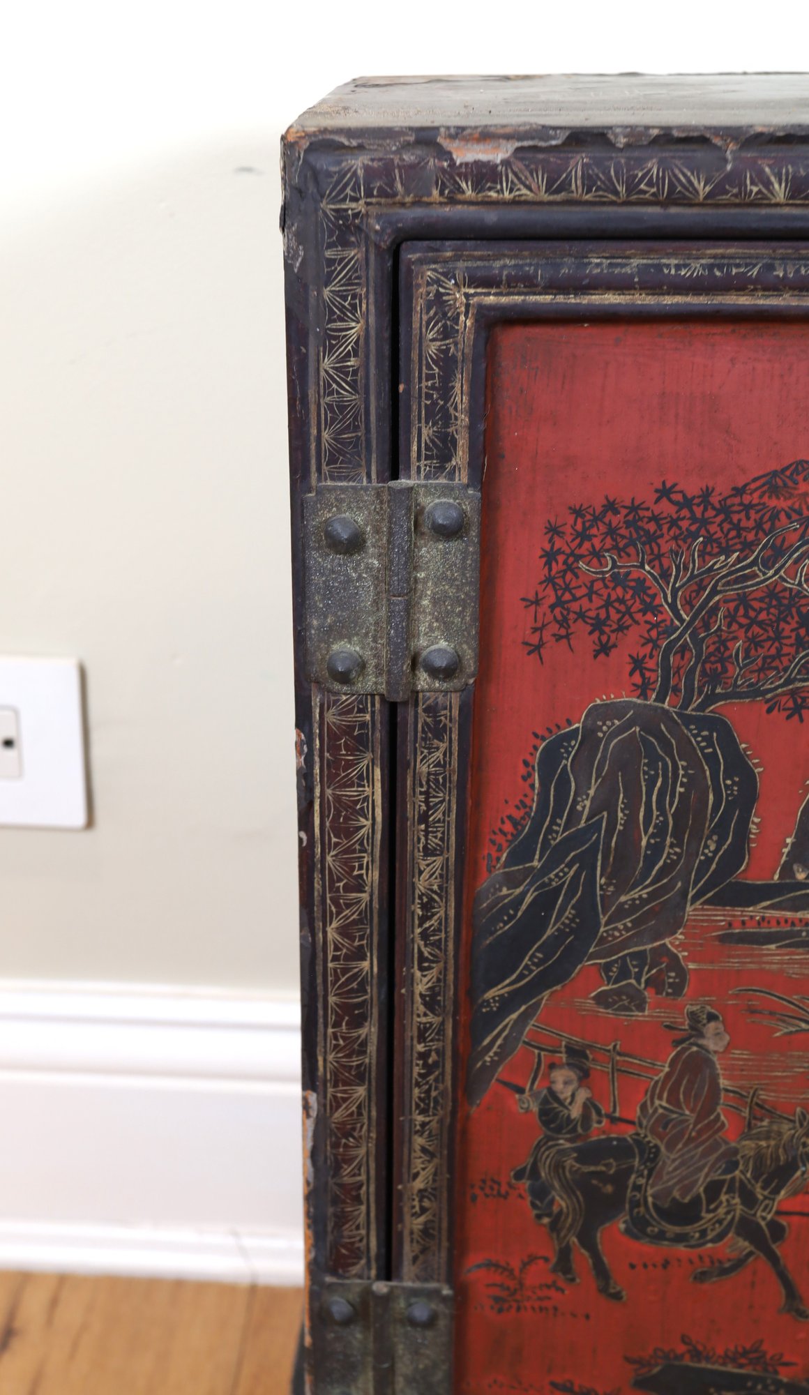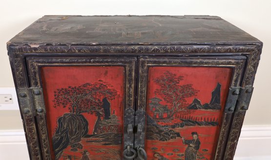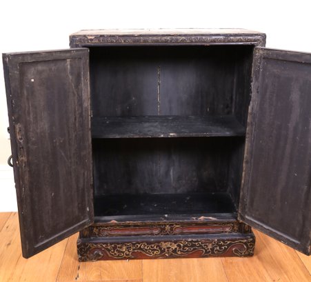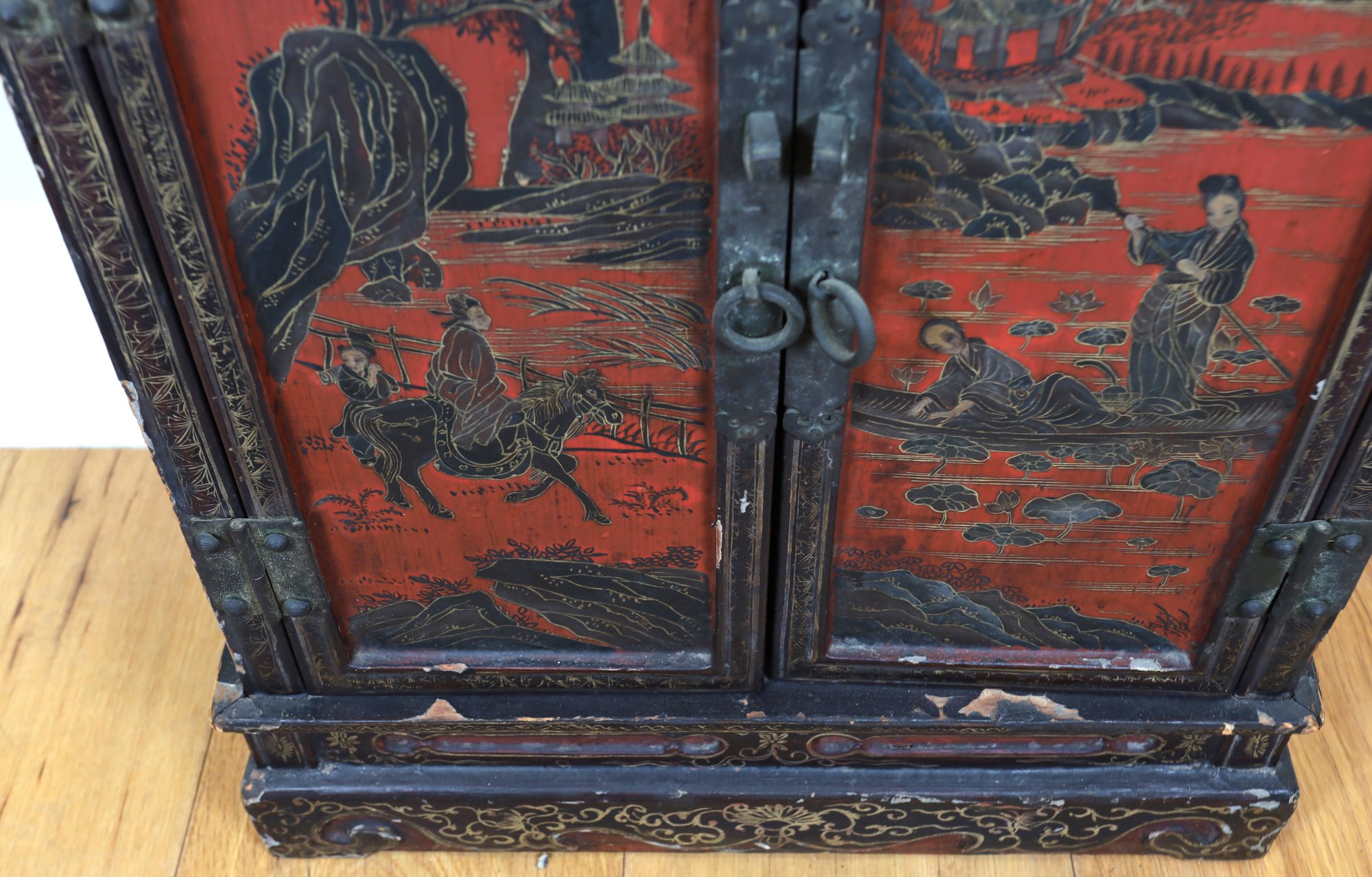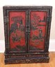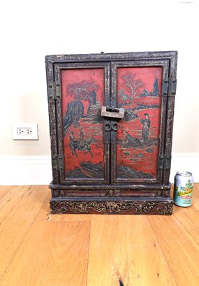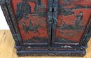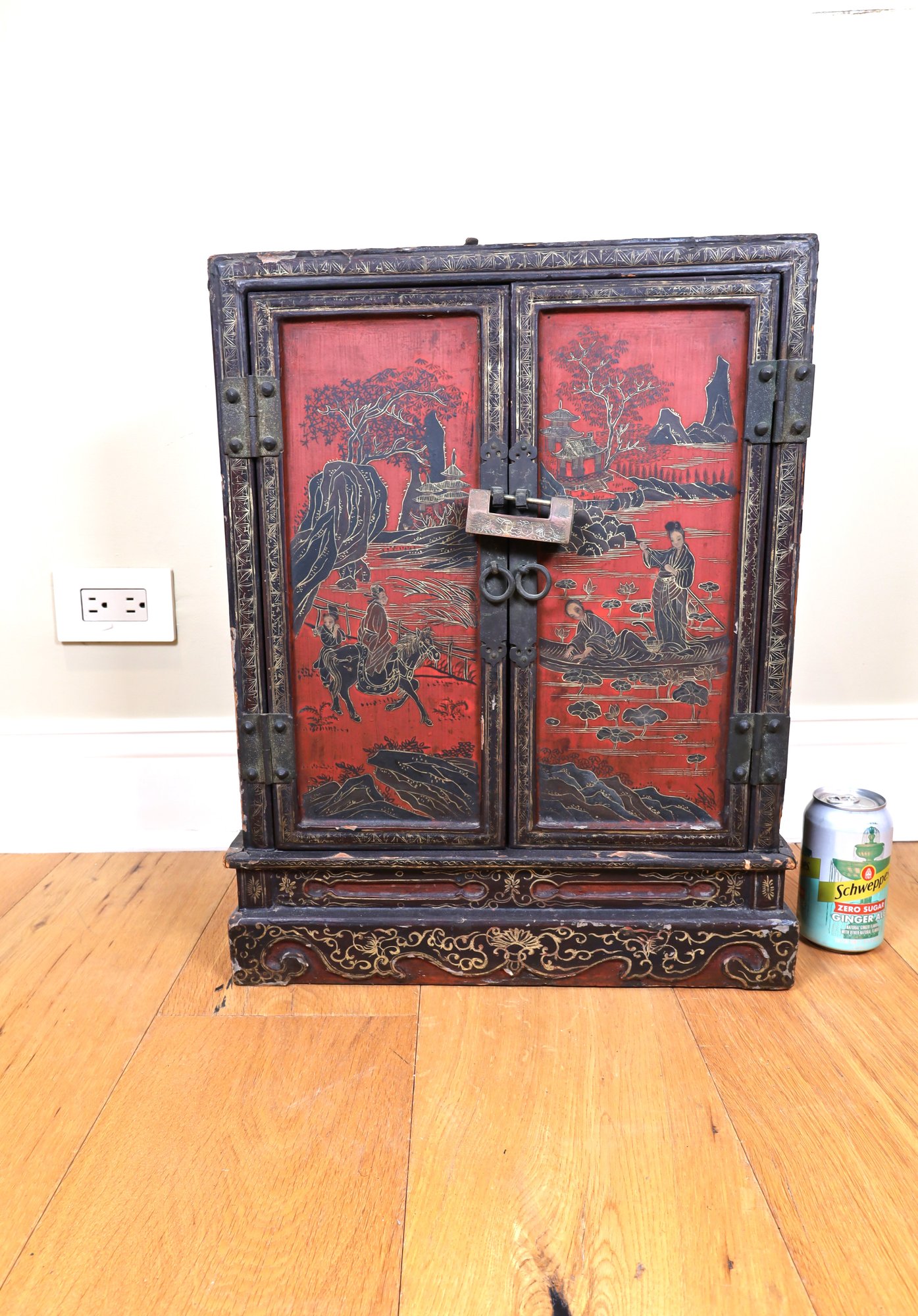 1 of 2 petite Chinese early cabinet. Red and black with tons of detail. Red and black wooden cabinets with figural scenes and landscape. Old brass locks , original hardware with 1 shelf inside.