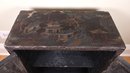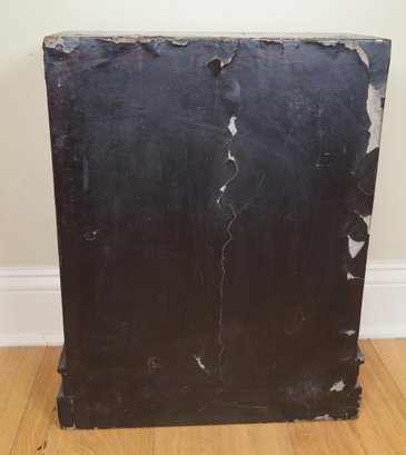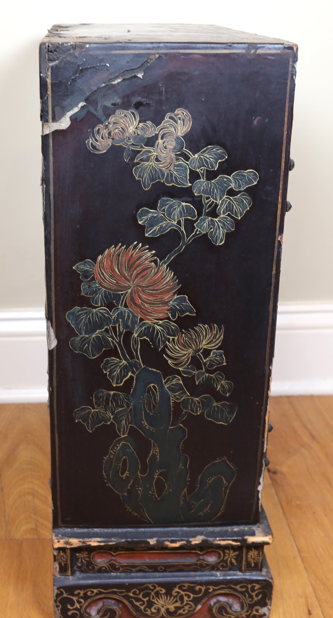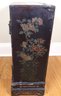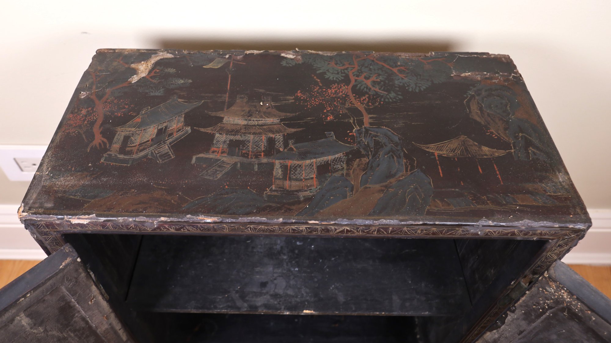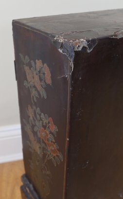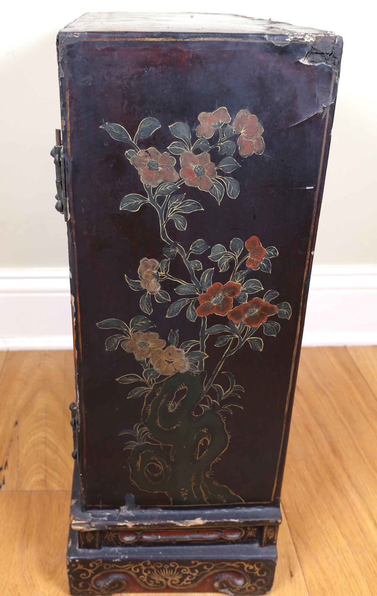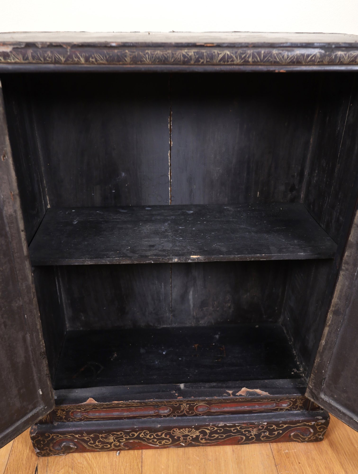 1 of 2 petite Chinese early cabinet. Red and black with tons of detail. Red and black wooden cabinets with figural scenes and landscape. Old brass locks , original hardware with 1 shelf inside.