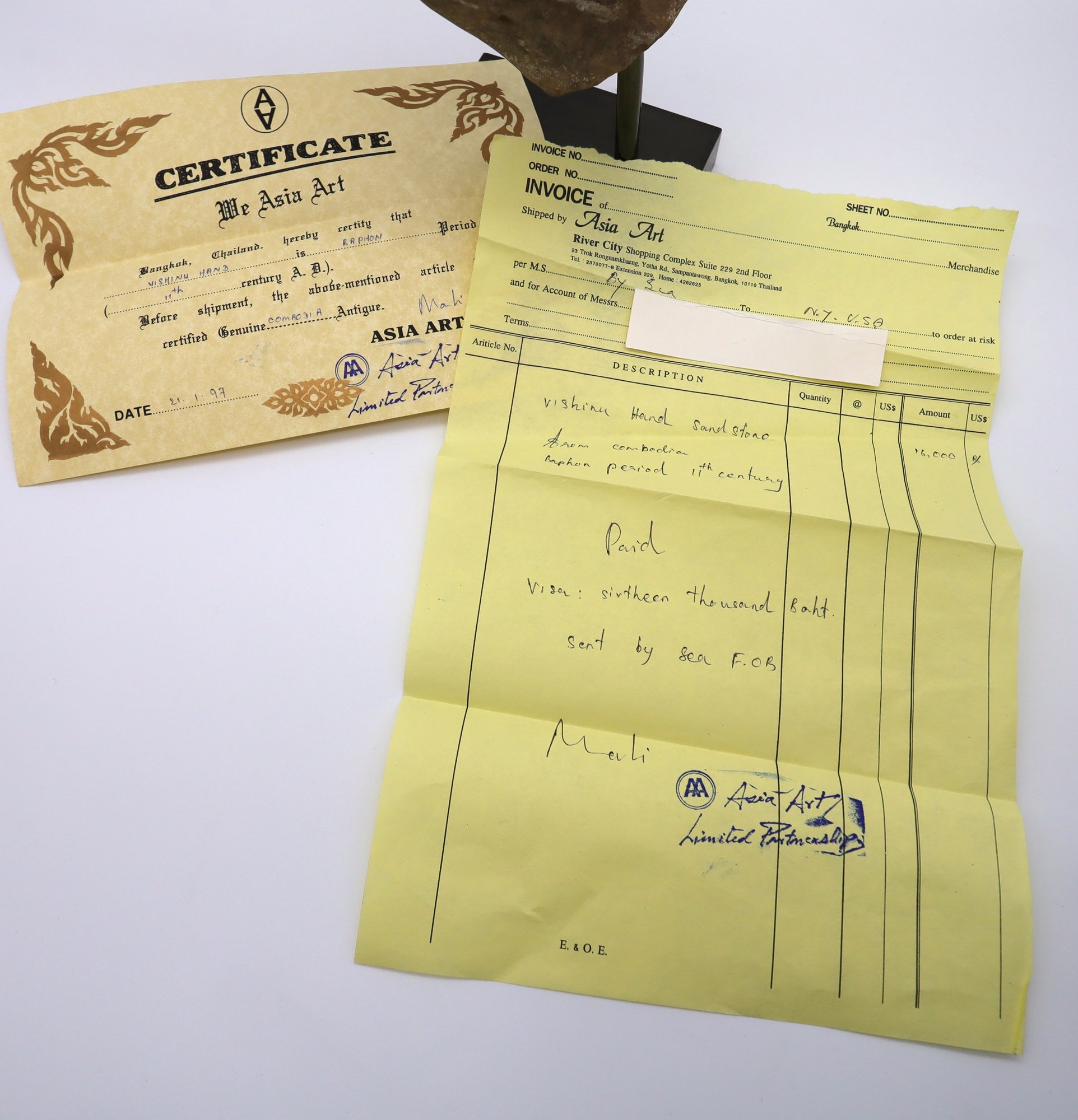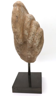 11th Century Sandstone Hand of Vishnu from Cambodia's Baphuon Period, on a black stand. Comes with certificate. Nice condition. 11"H x 5"W. Private Collection in Manhattan.