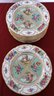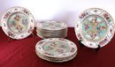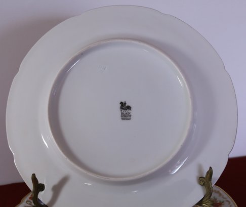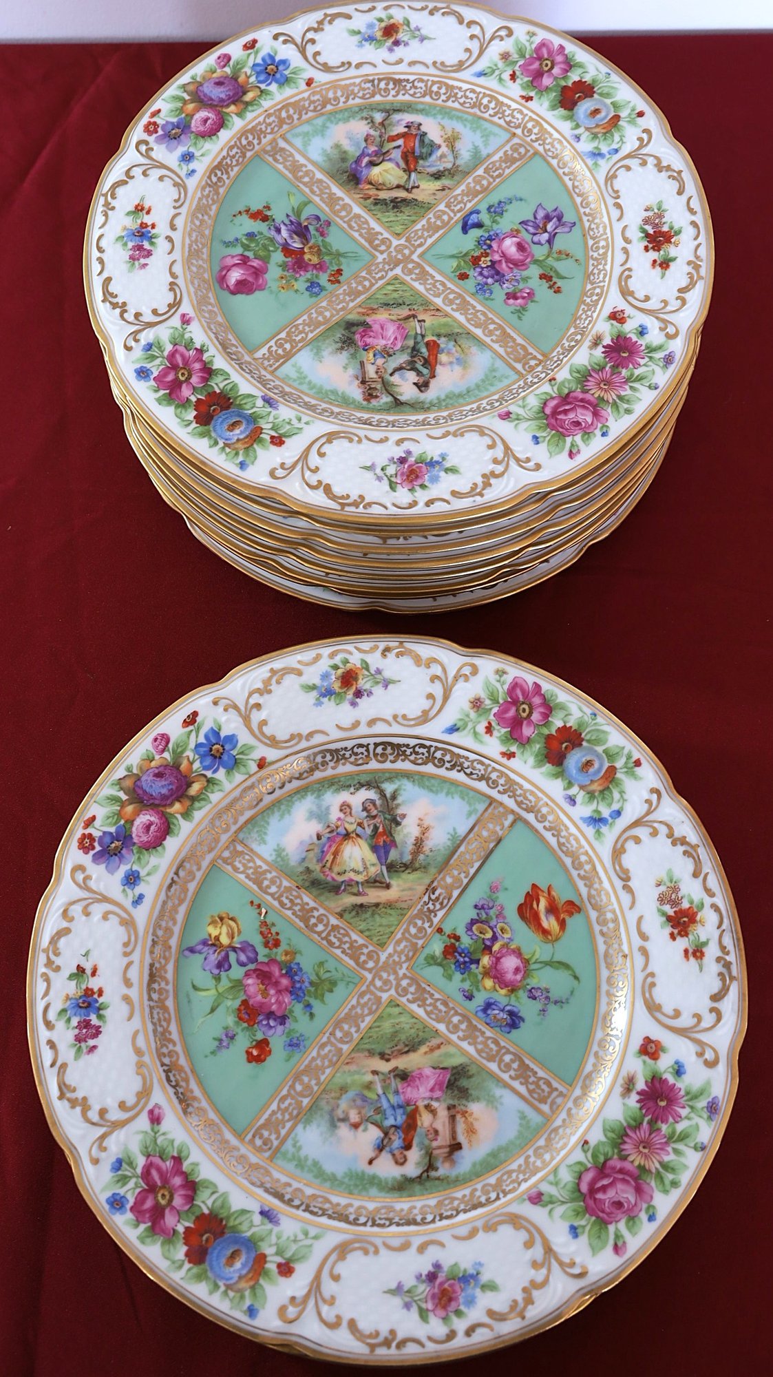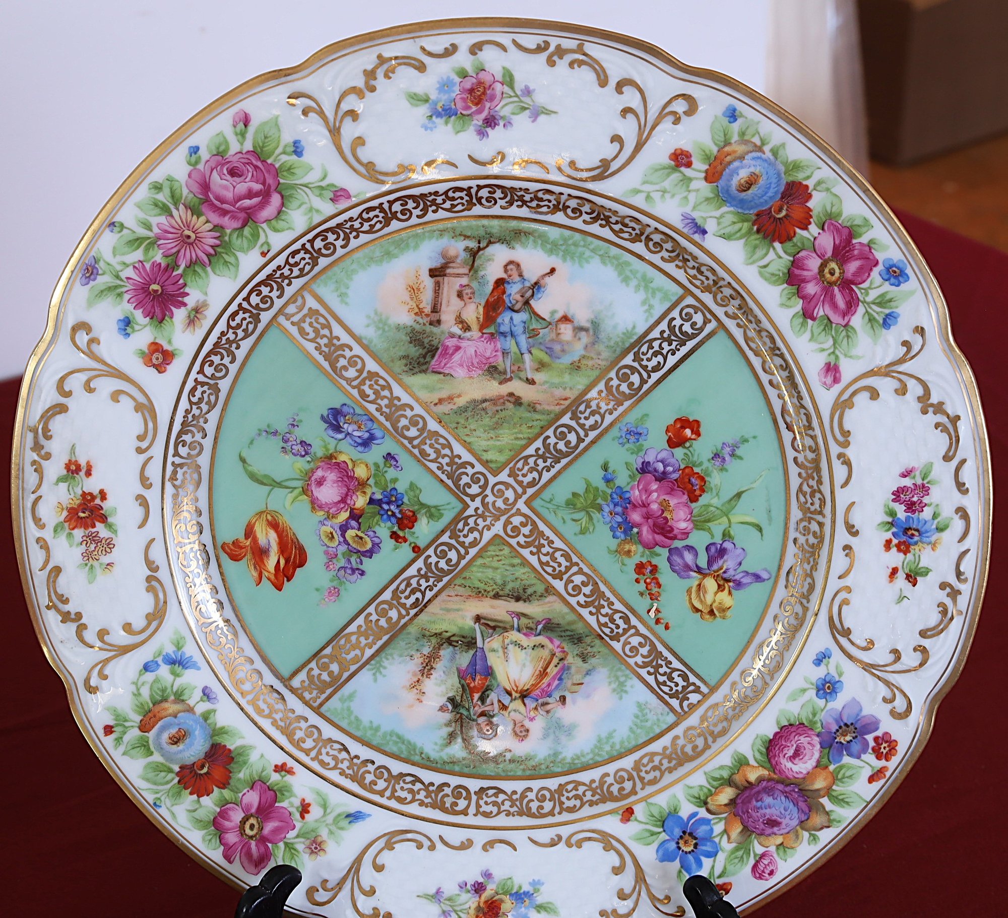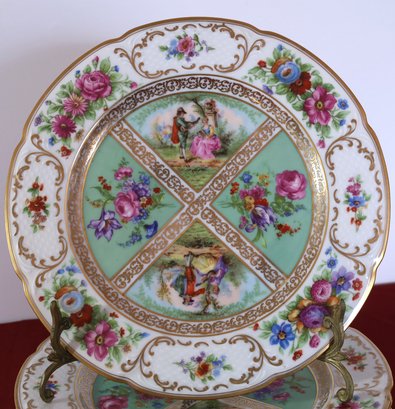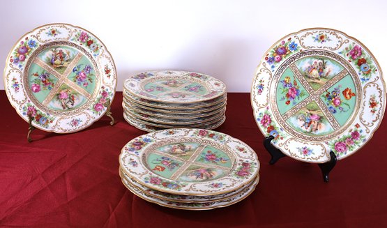 "Black Night" This decorative plate showcases a central scene of a couple, framed by four floral panels and an intricate gilt border. Eight plates are identical, while four are similar with slight variations. 10.5"D in good condition.