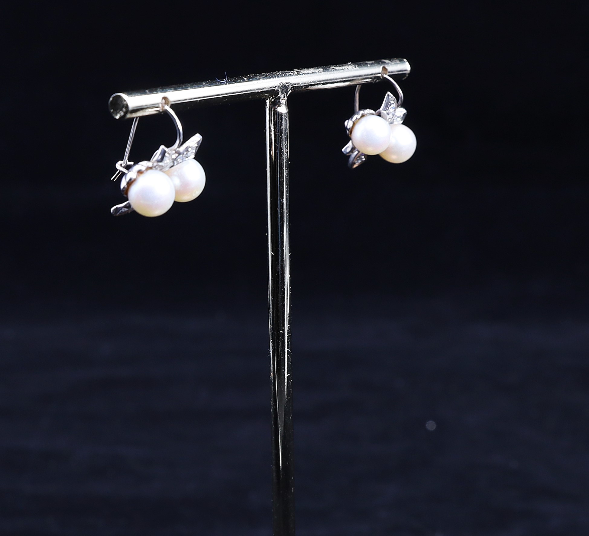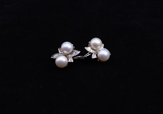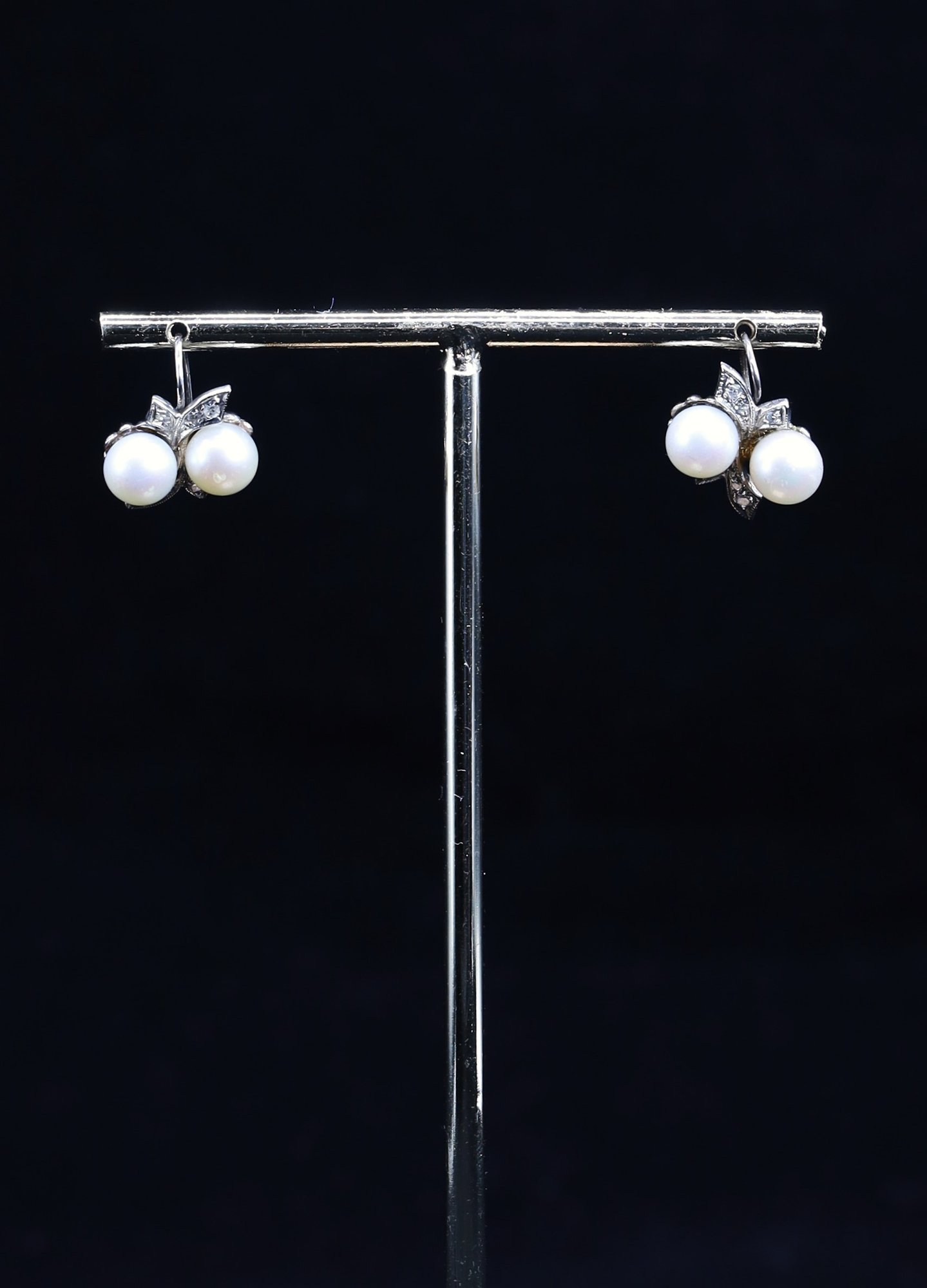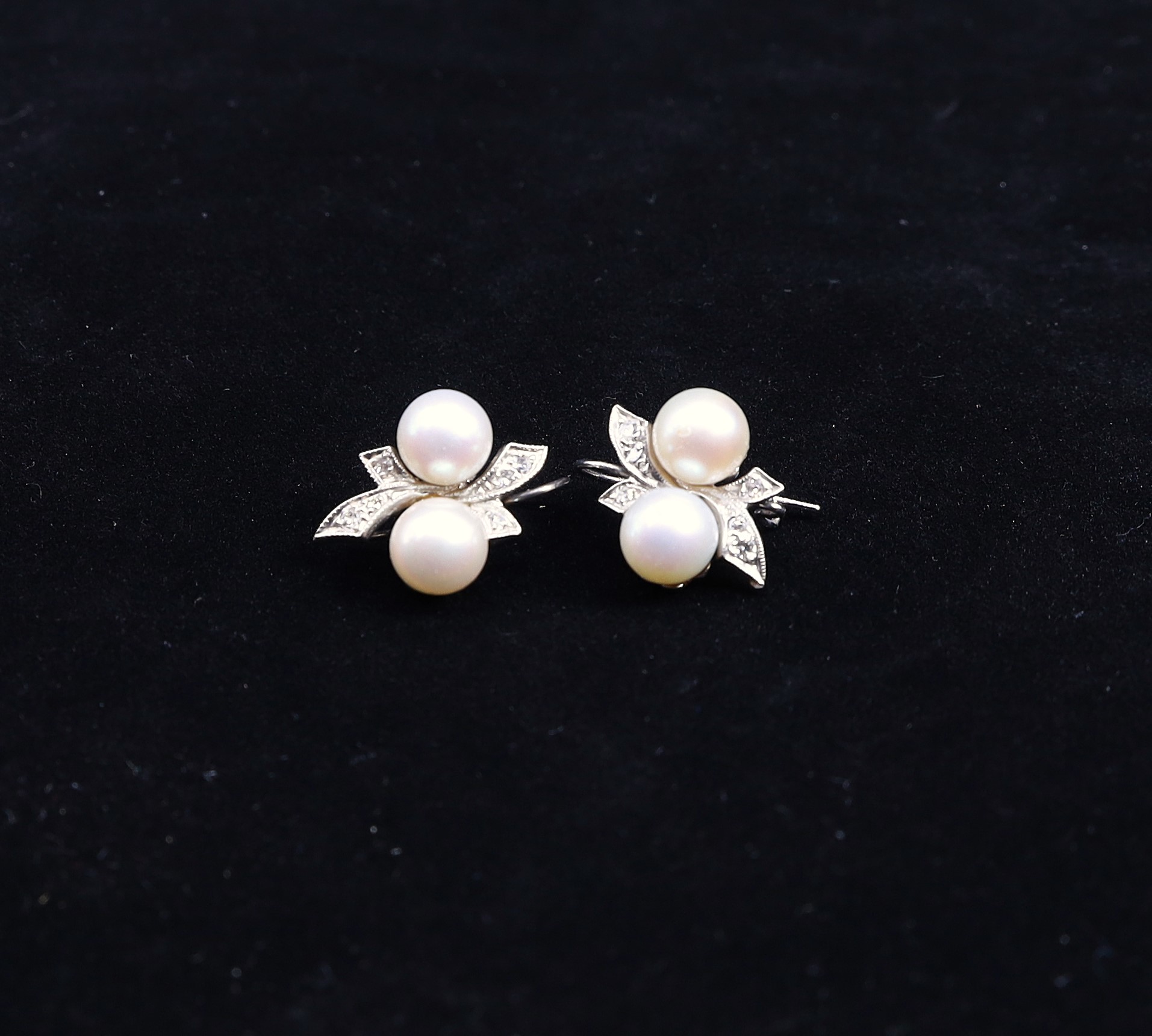 14k with 6 natural diamonds approx. .05ct with and 2 cultured pearls each. with wire backing.