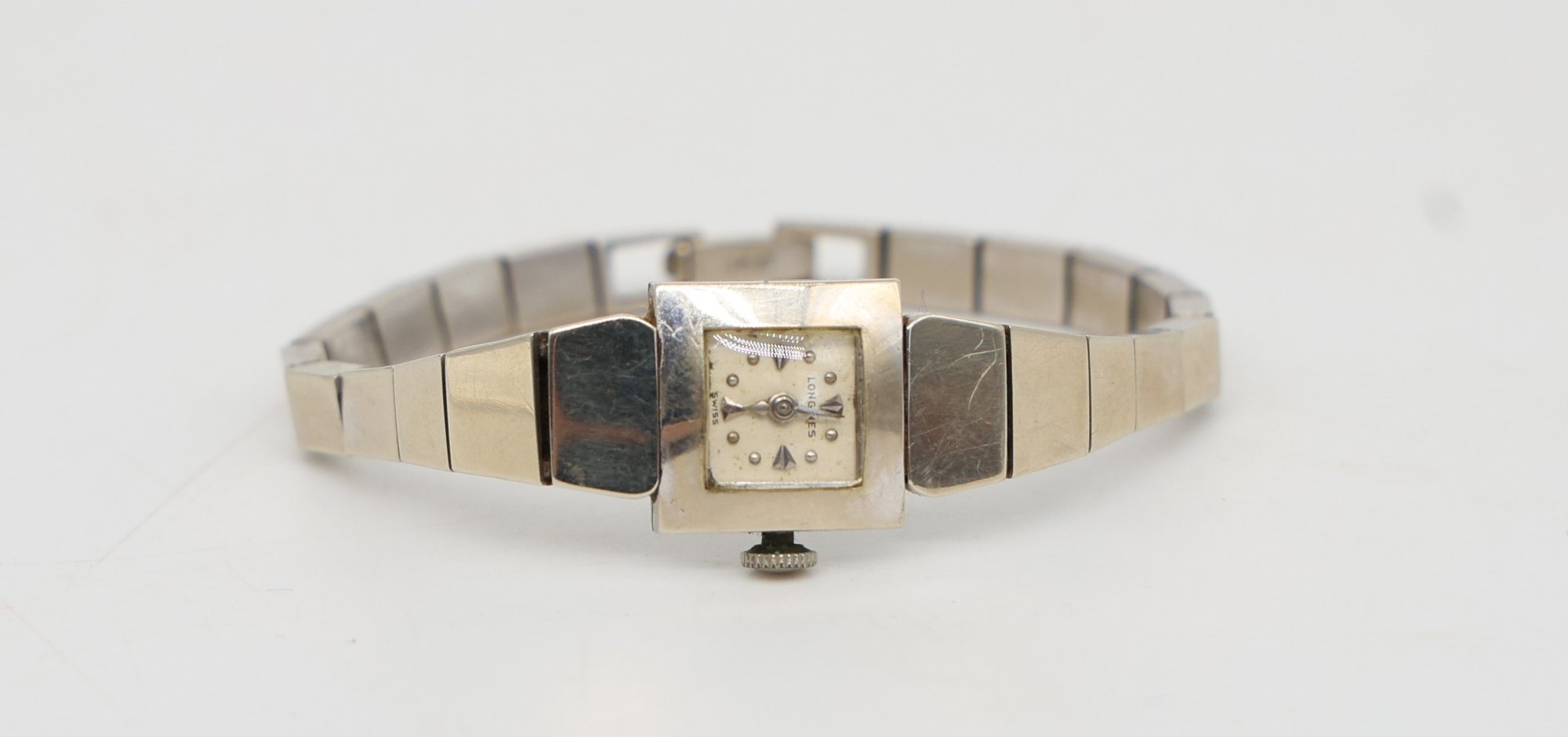 14k white gold face and band. Longines watch can be wound and working when tested.