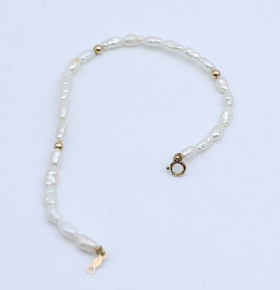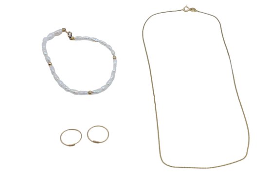 Balls and clasp 14k gold with water pearl bracelet and small twist 14k hoops earrings.