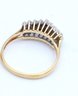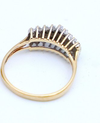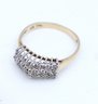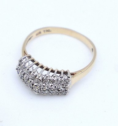 size 7.5 14k yellow gold ring with 3 rows of diamond clusters in a V shape