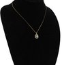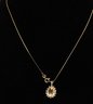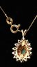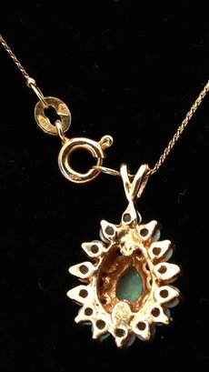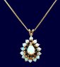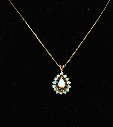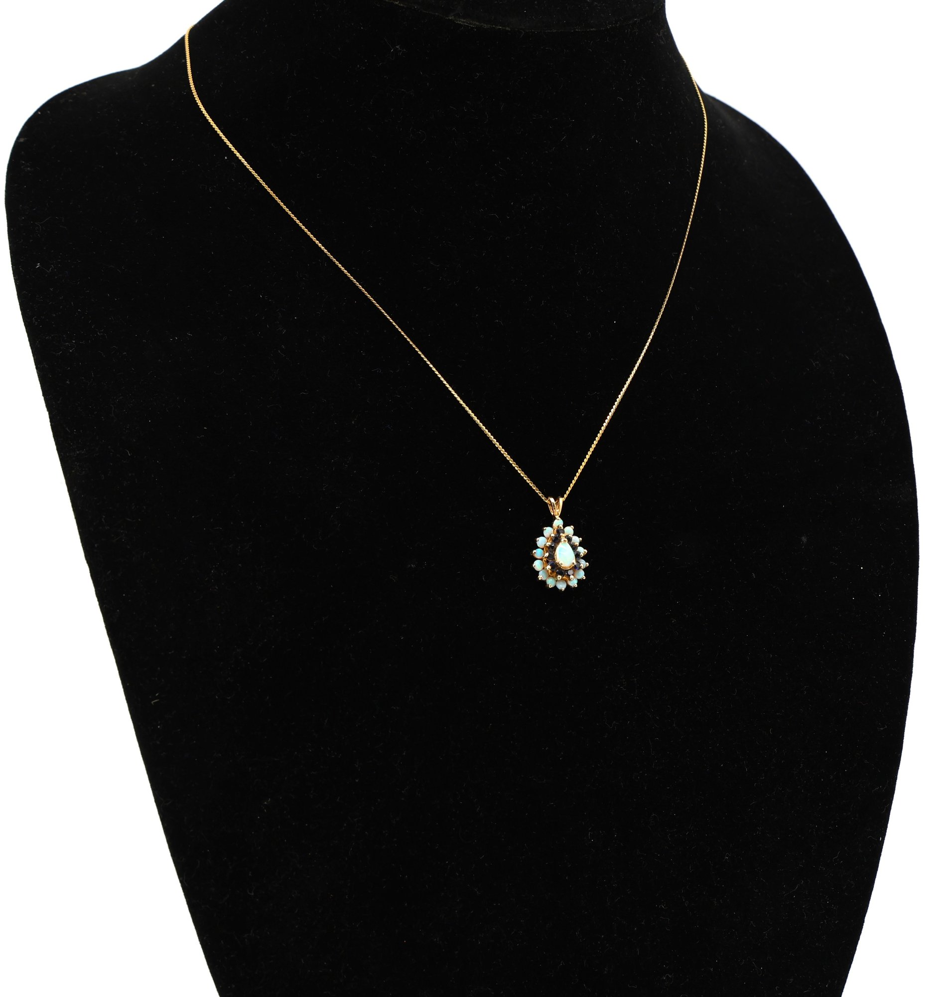 Gold opal and sapphire cluster pendant. The central teardrop-shaped stone and the outer border of smaller, round stones are opals, while the darker, round stones between them are likely blue sapphires.