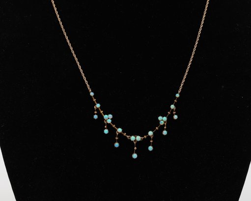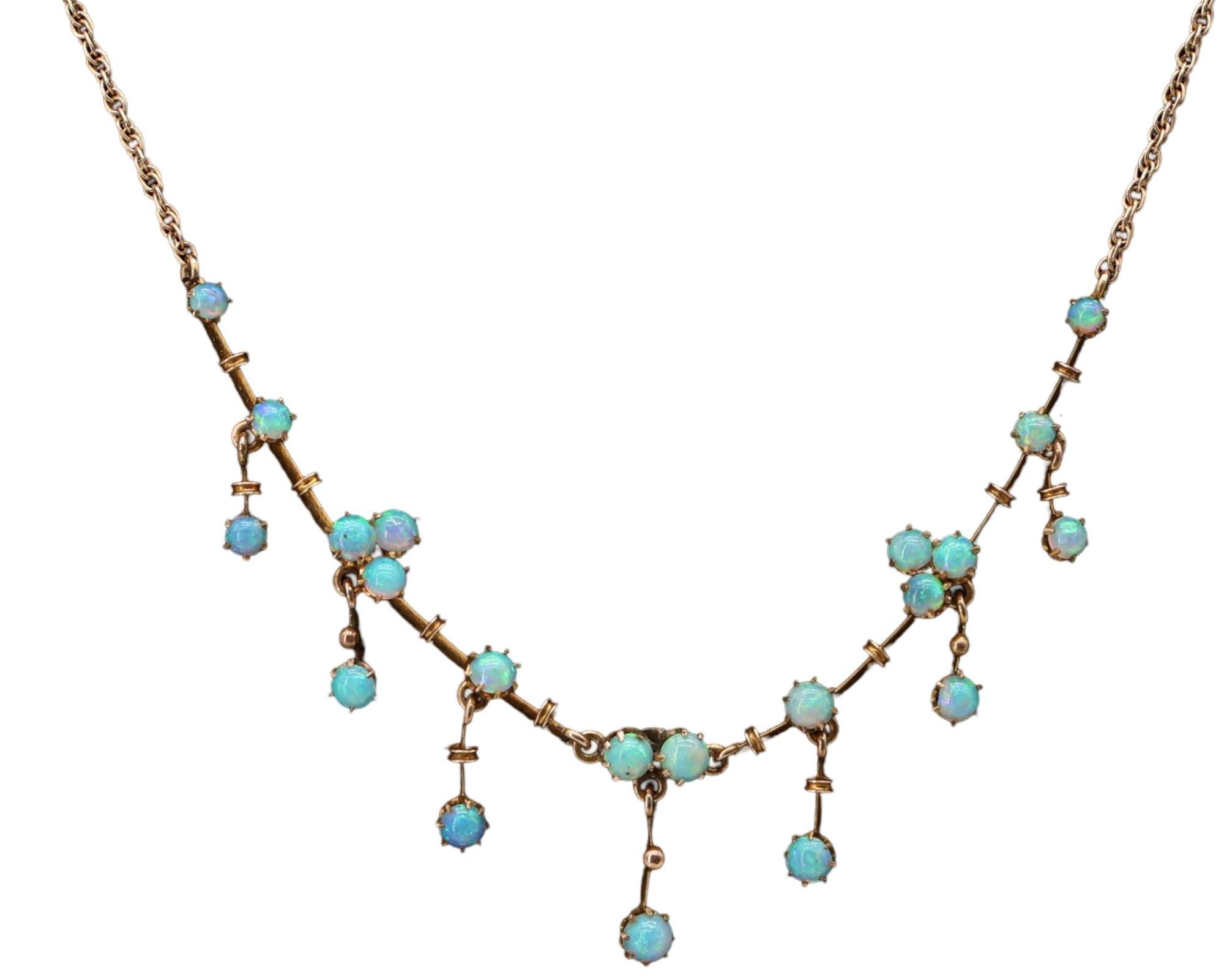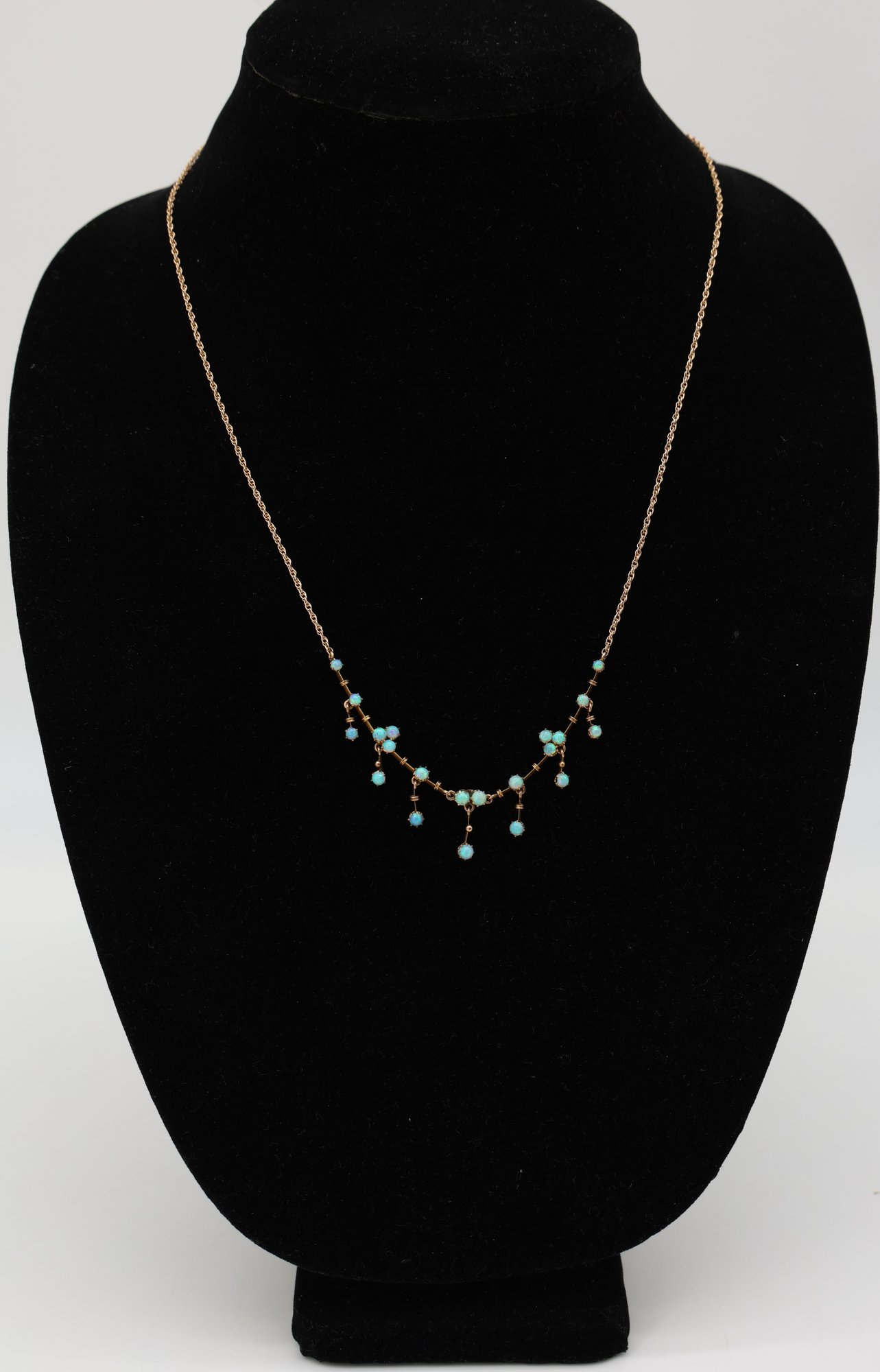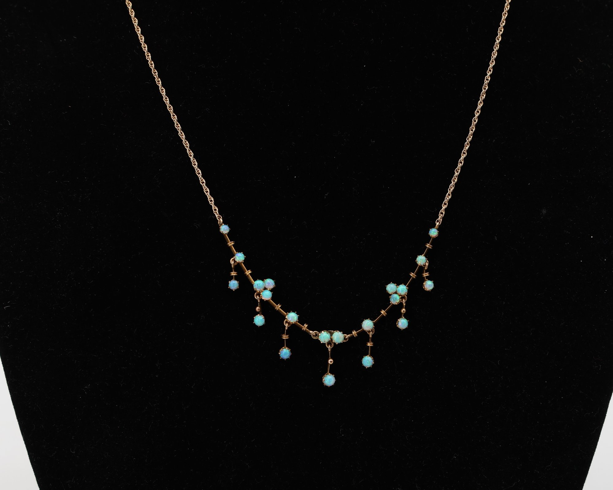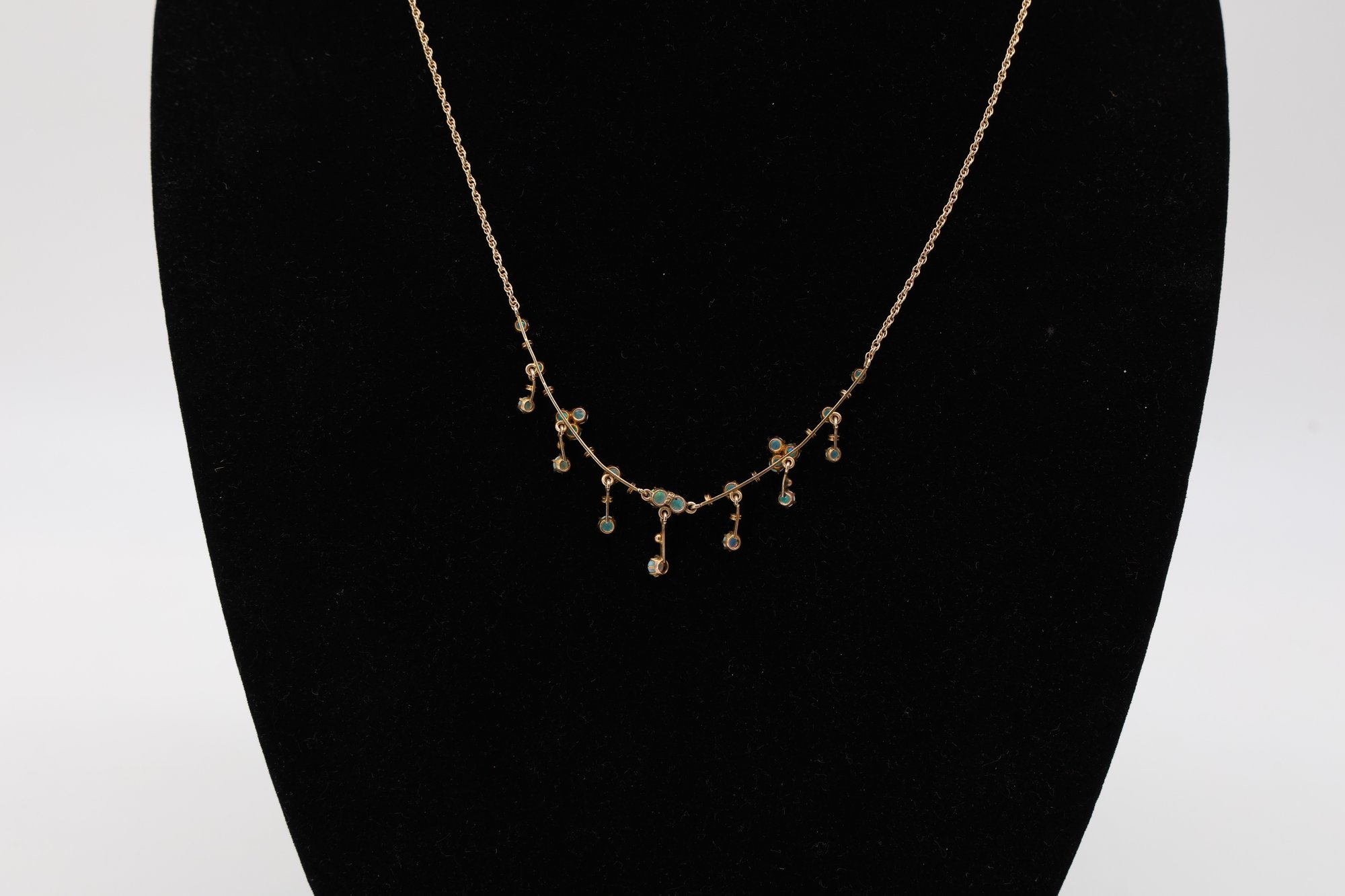 This charming necklace features opal beads arranged in an elegant fringe design. It measures 21 inches long and weighs approx 5.1 grams with the opals, making it a beautiful and lightweight accessory.