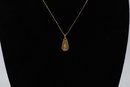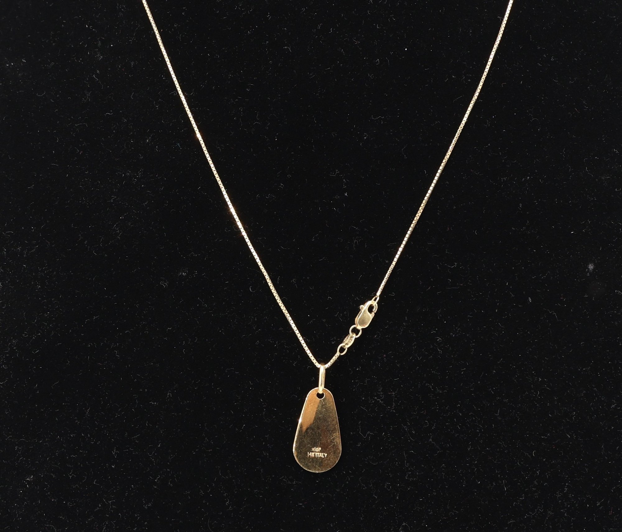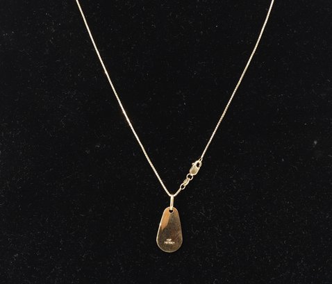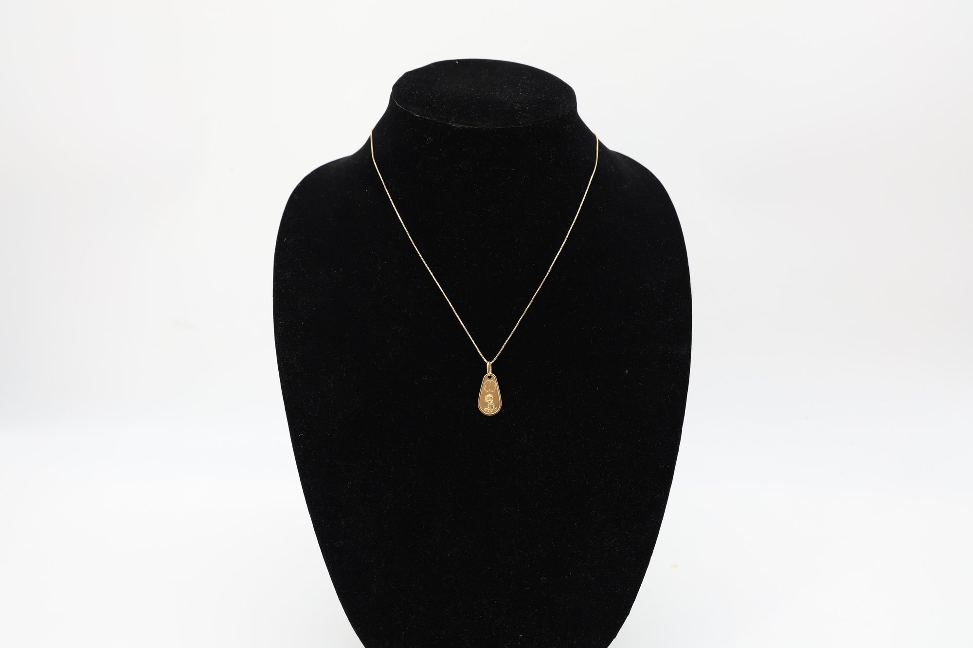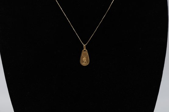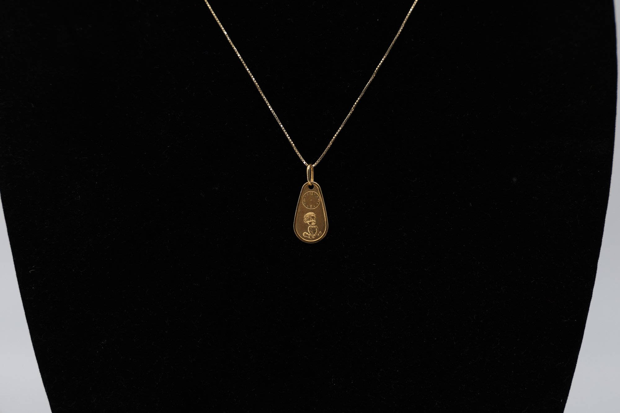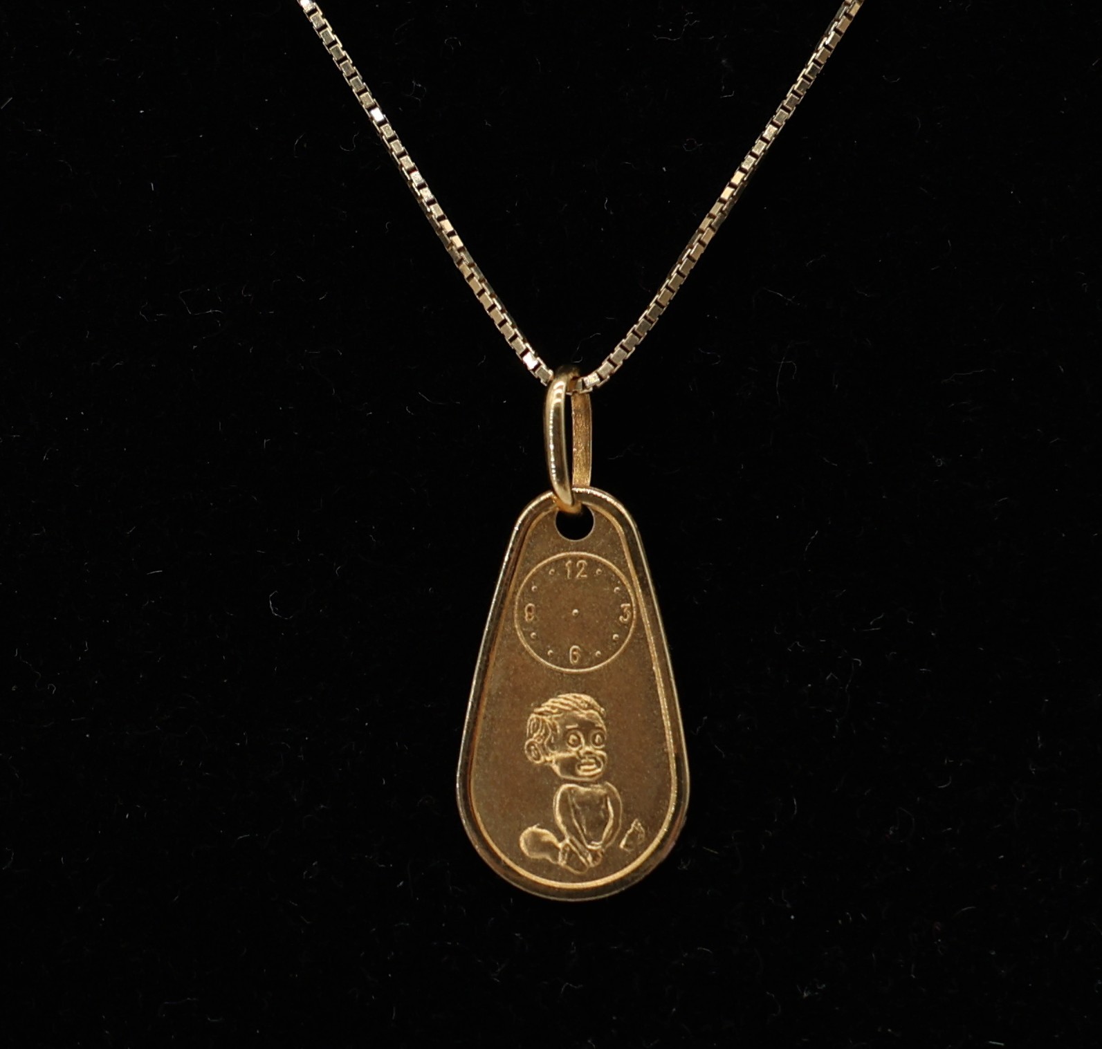 A satin-finished yellow gold pendant measuring (.40" x .75"). The plate displays an image of a child and a clock, which is ready for engraving, with the hands set to the time of birth and made of 14kt gold. Comes with a box chain measuring 19.5 inches.