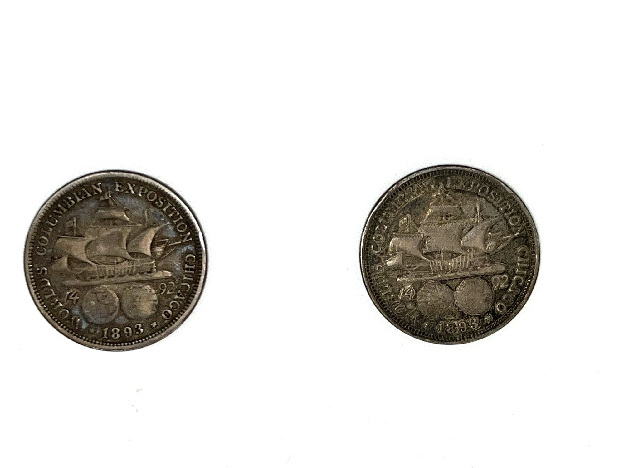 These are Colombian half dollars, the first commemorative coins issued by the United States. They were initially sold for $1 a piece to fund the Columbian Exposition held in Chicago in 1893 to celebrate the 500th anniversary of Columbus's landing in the New World.