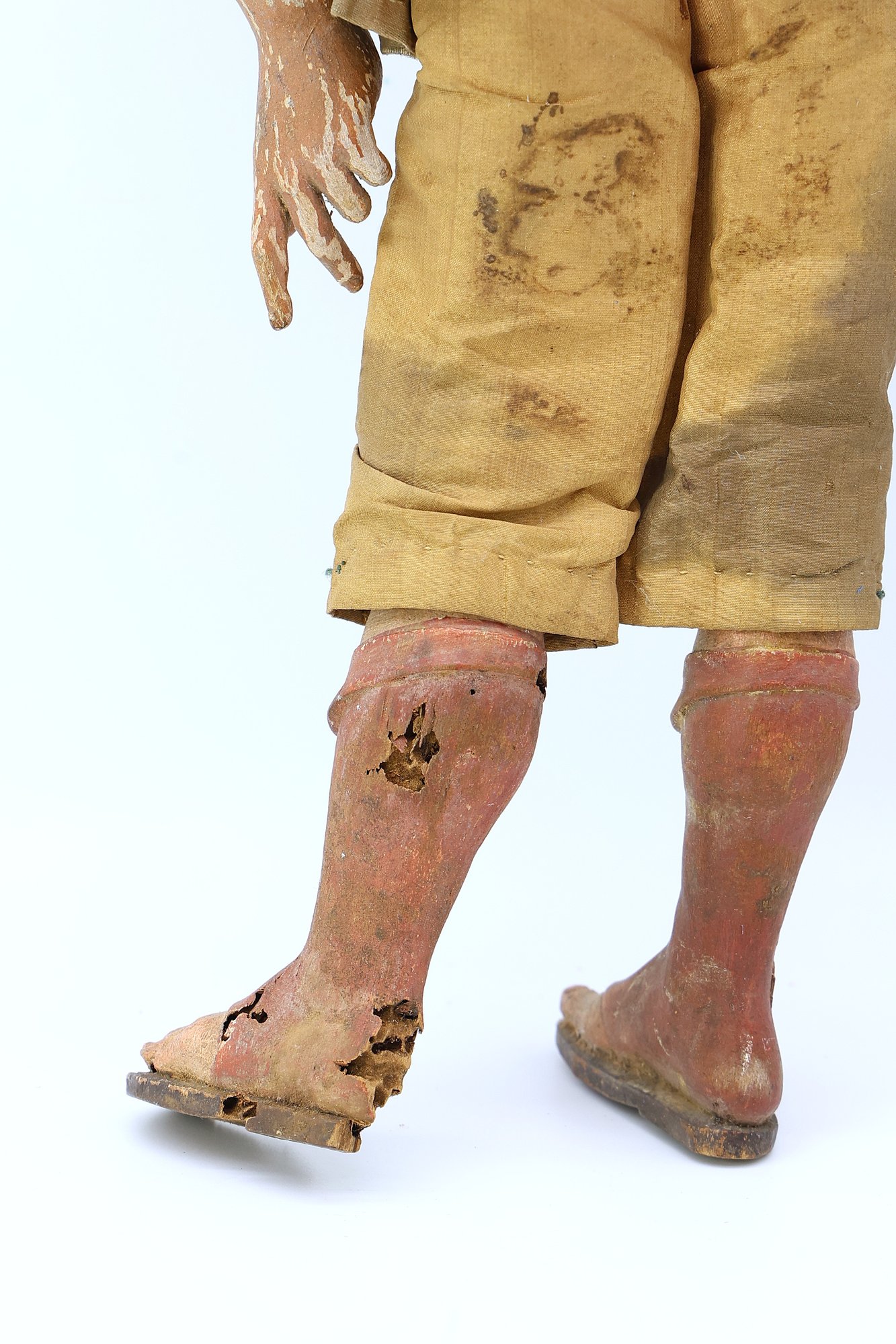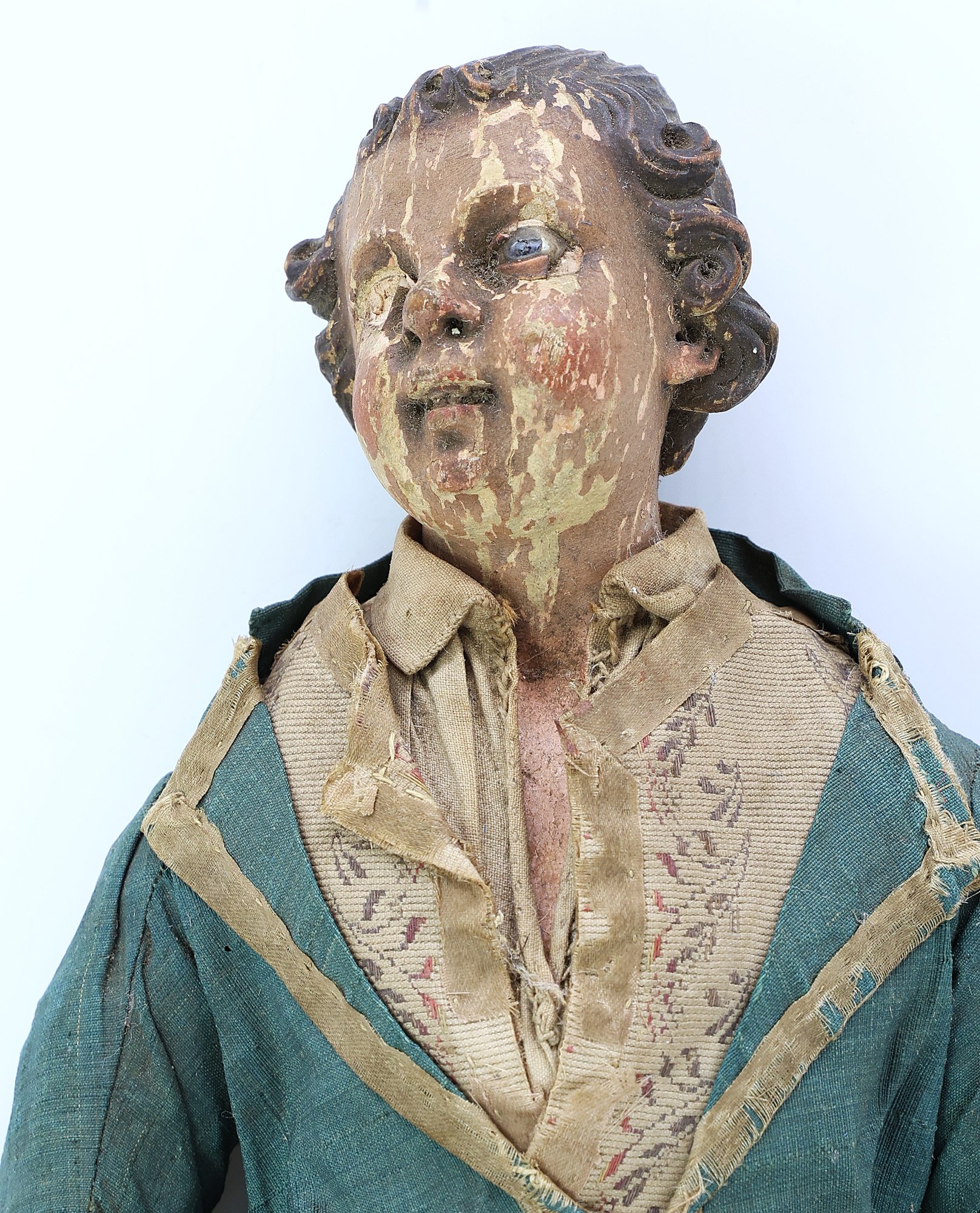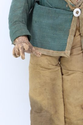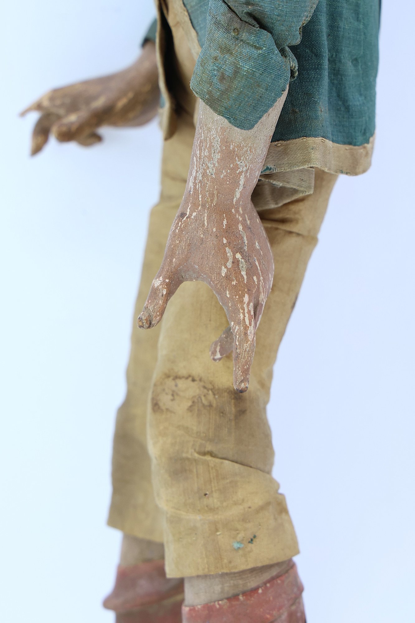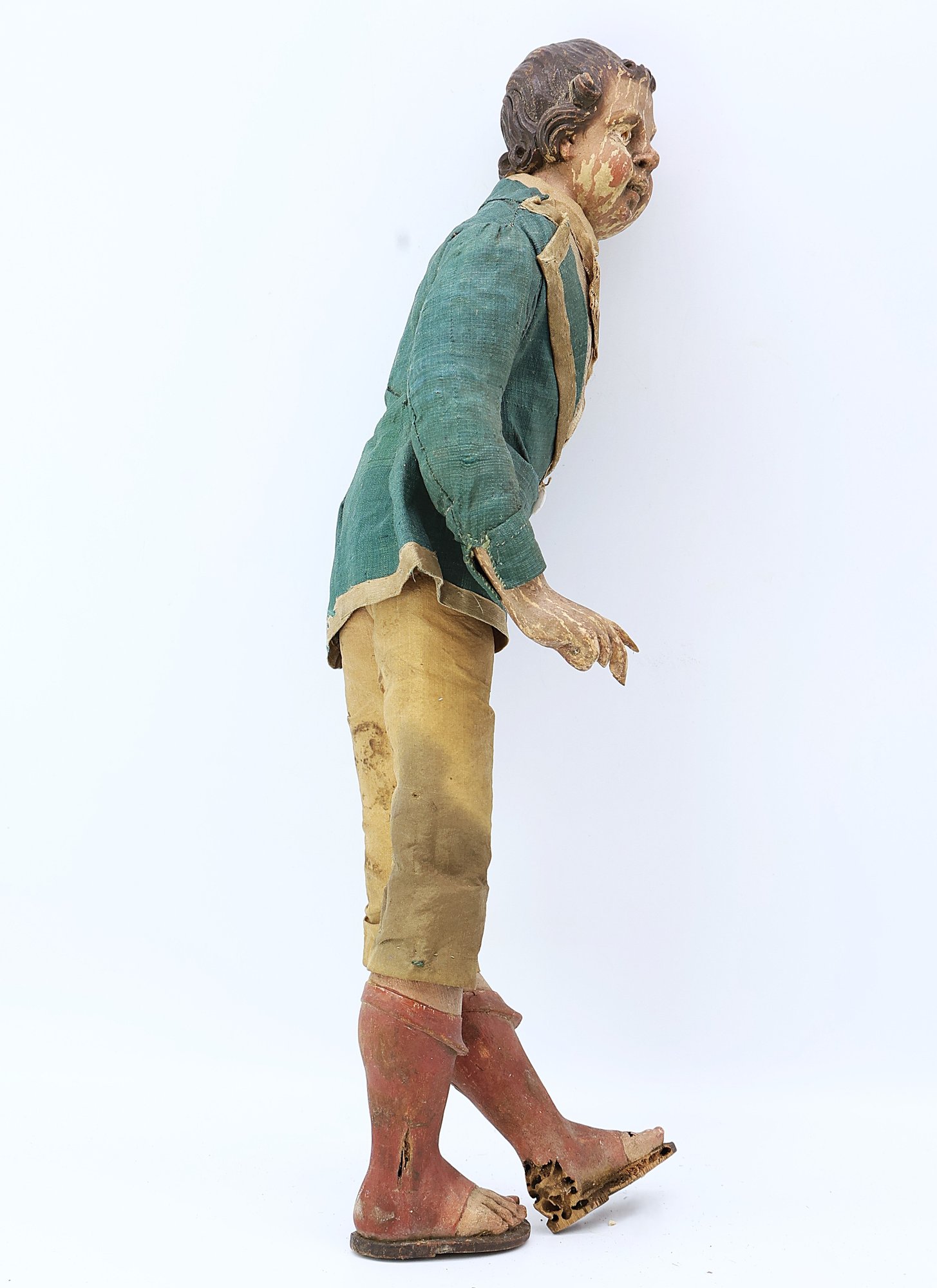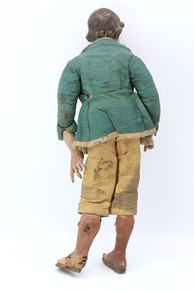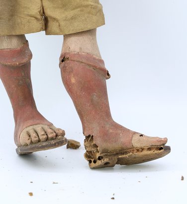 Gentleman of the period with details to original clothing and sandals. One leg needs repair ,fingers are missing and one eye is missing