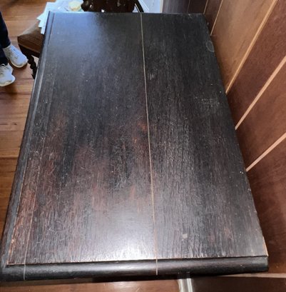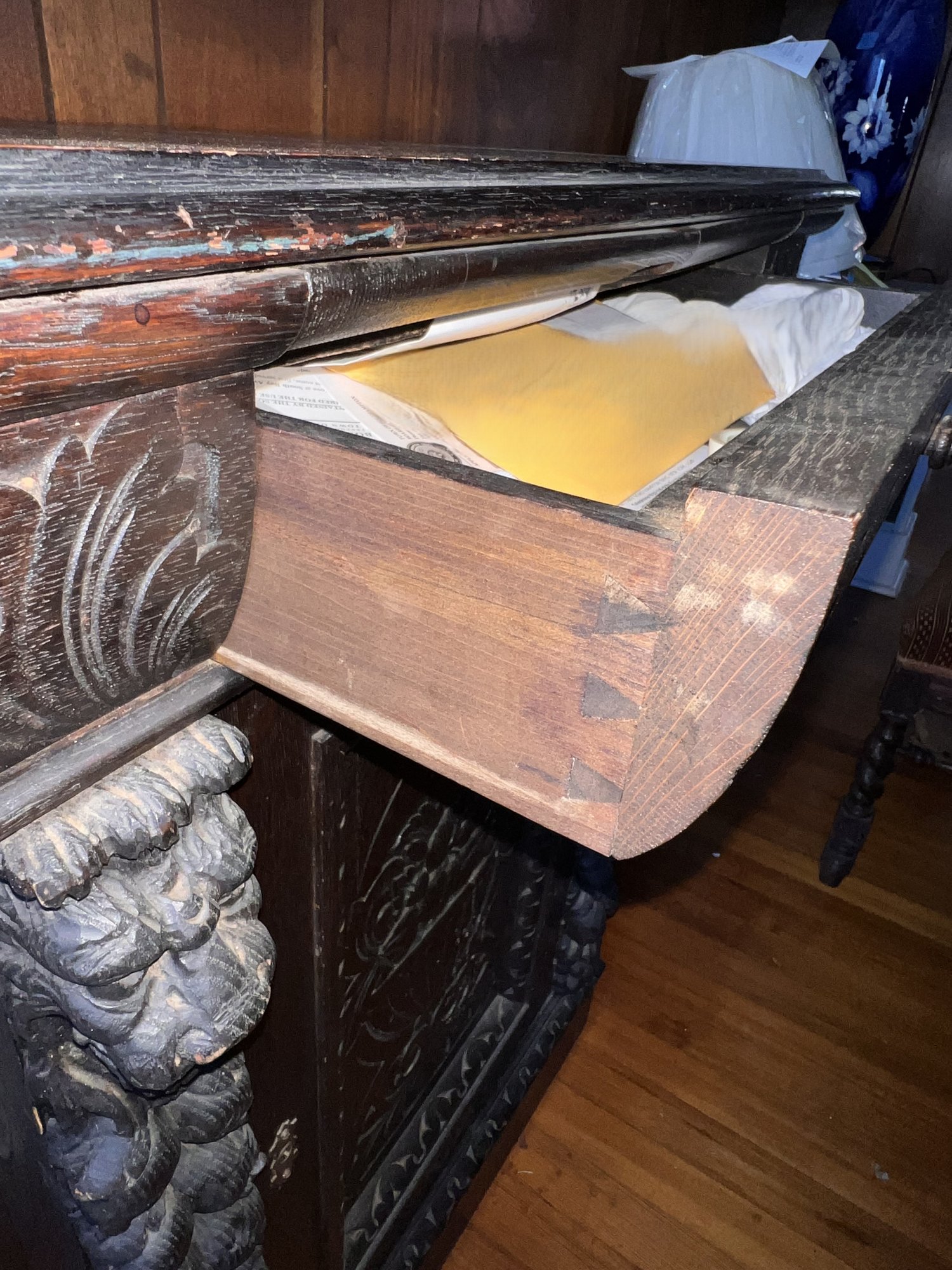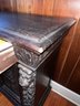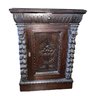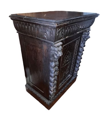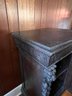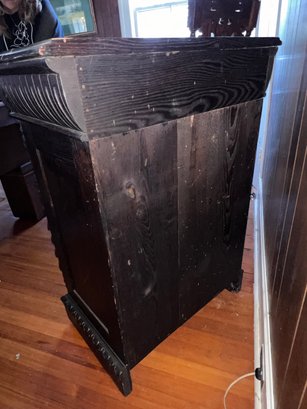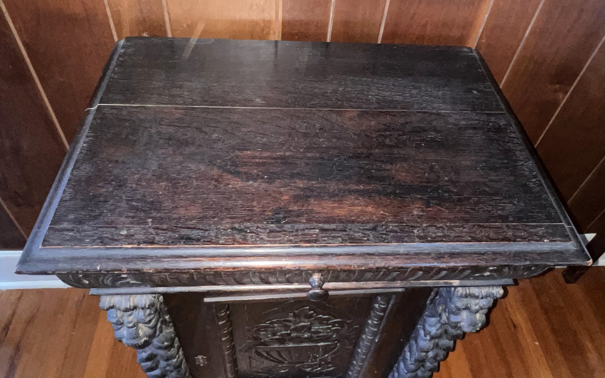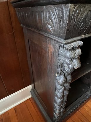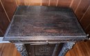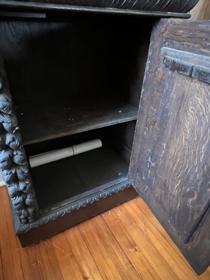 Exquisite piece, hand-carved oak that can fit anywhere. It needs a good cleaning and will be absolutely fantastic! It features 1 drawer and a shelf inside, and it moves easily on casters.