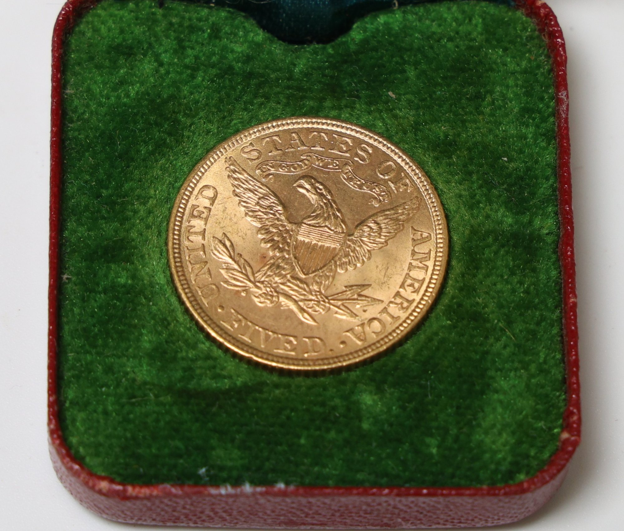 The Liberty Head Half Eagle series was minted from 1839 to 1908, enduring the Gold Reserve Act of 1934. The motto "IN GOD WE TRUST" was incorporated on the reverse side in 1866.