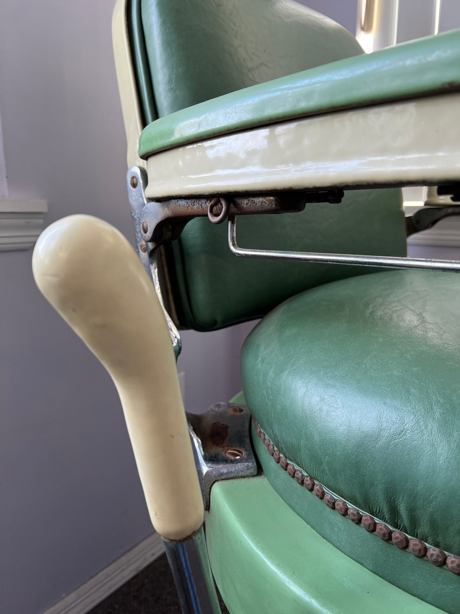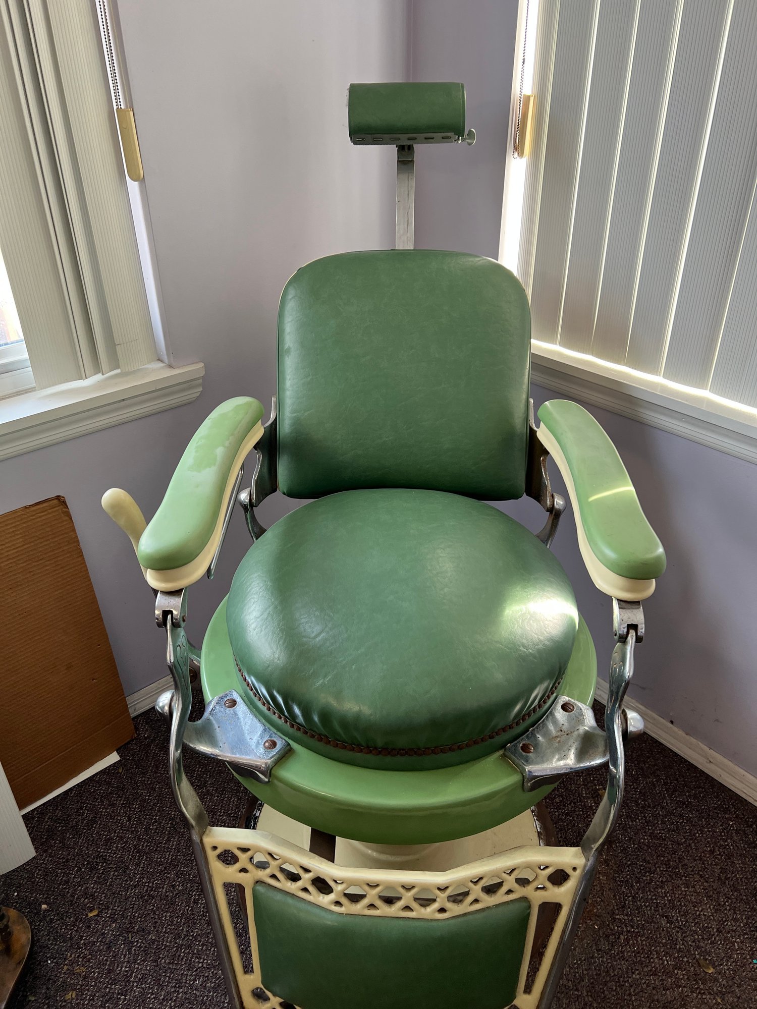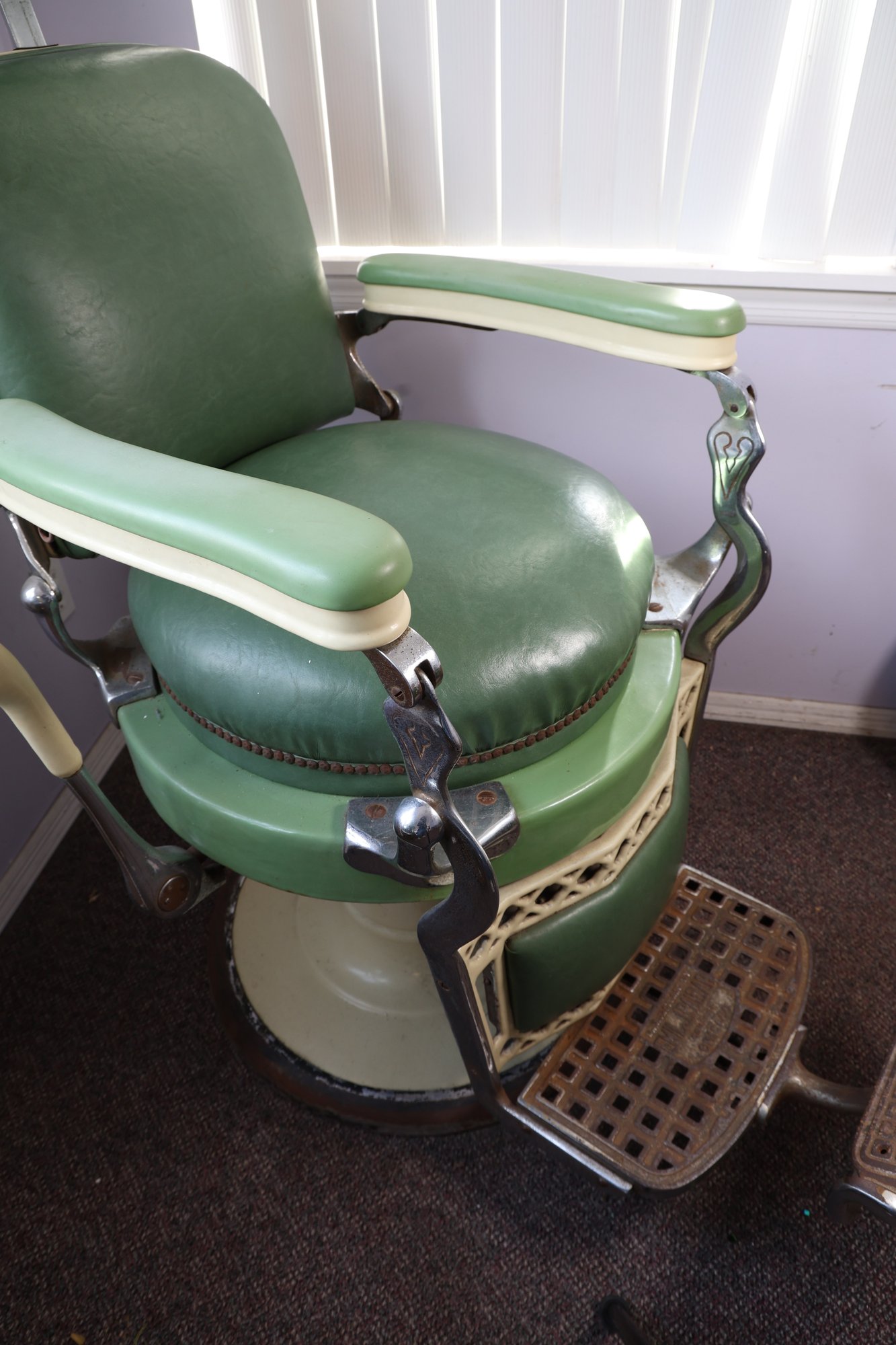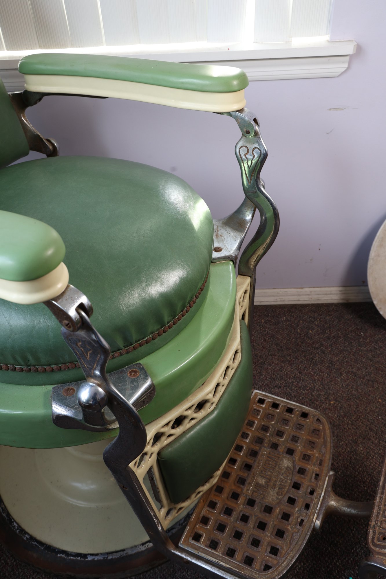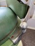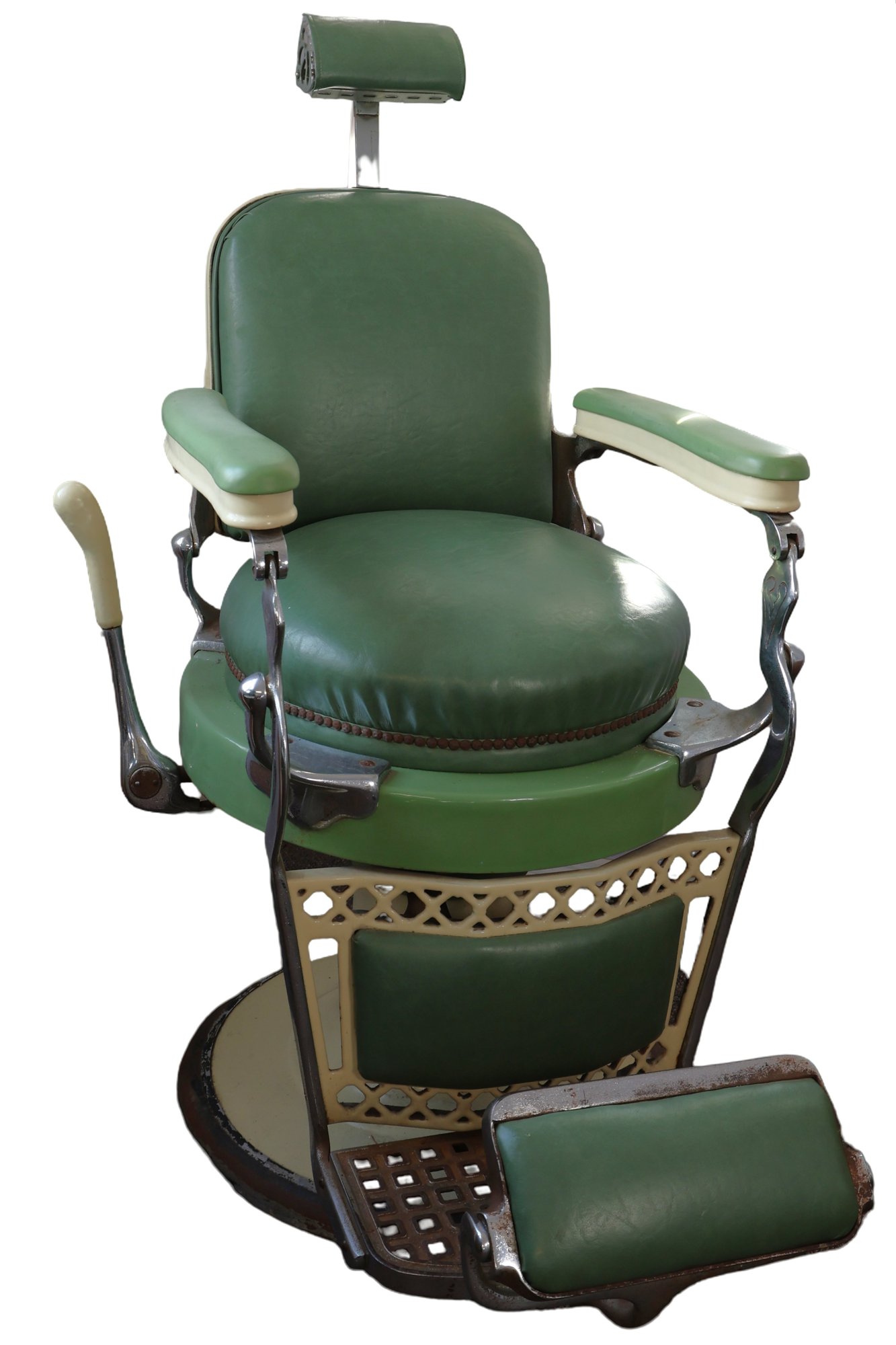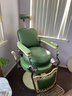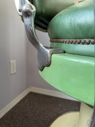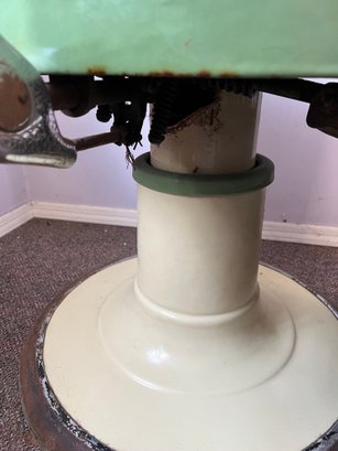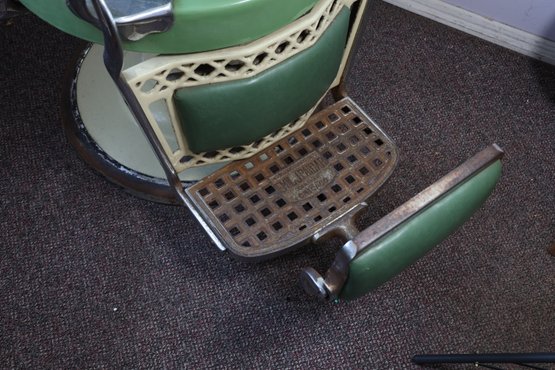 Antique completely working hydraulics by Emil J. Paidar barber chair features adjustable height, operated by a foot jack or side lever. It can rotate or lean backward, ideal for hair washing and shaving. In certain states, a headrest is legally required for shaving. Constructed from heavy-duty metal and leather for durability. Metal components and porcelain enamel show some age, but overall, very nice.