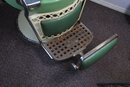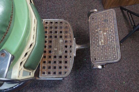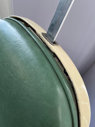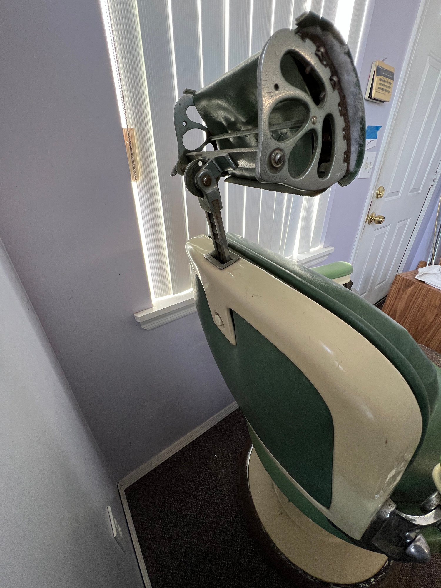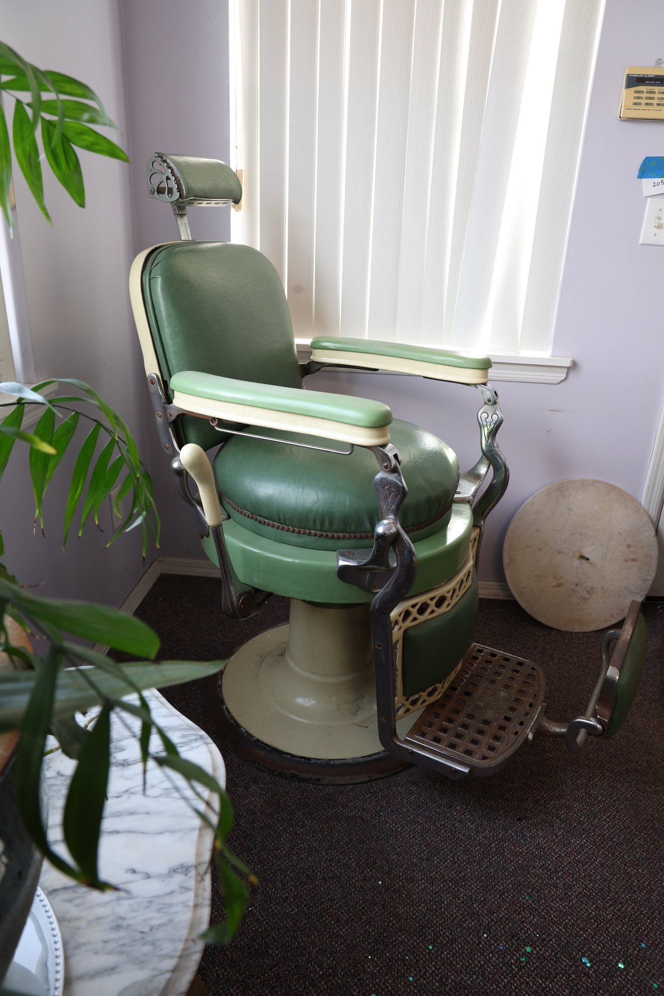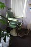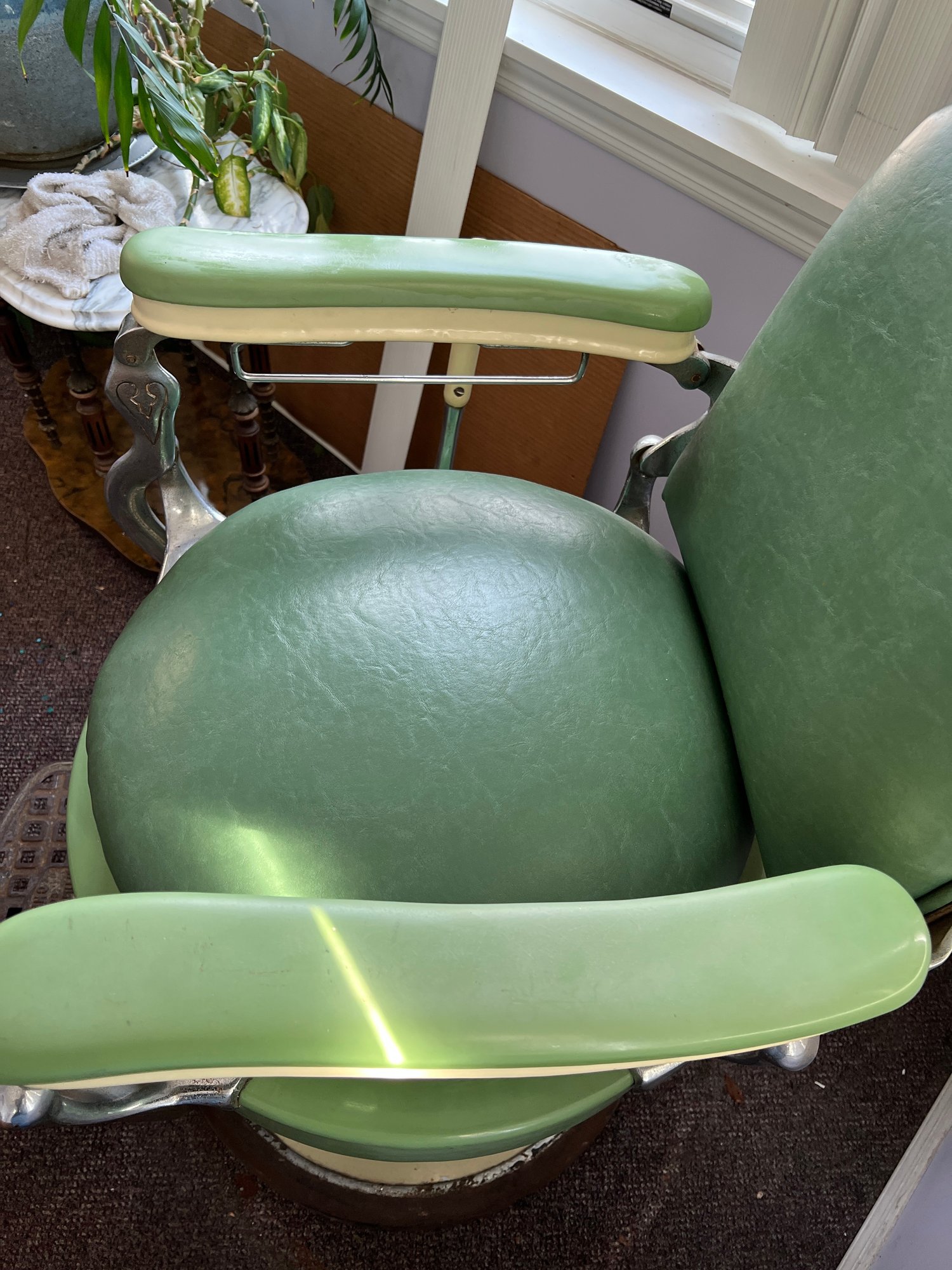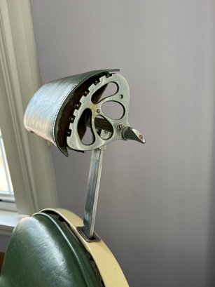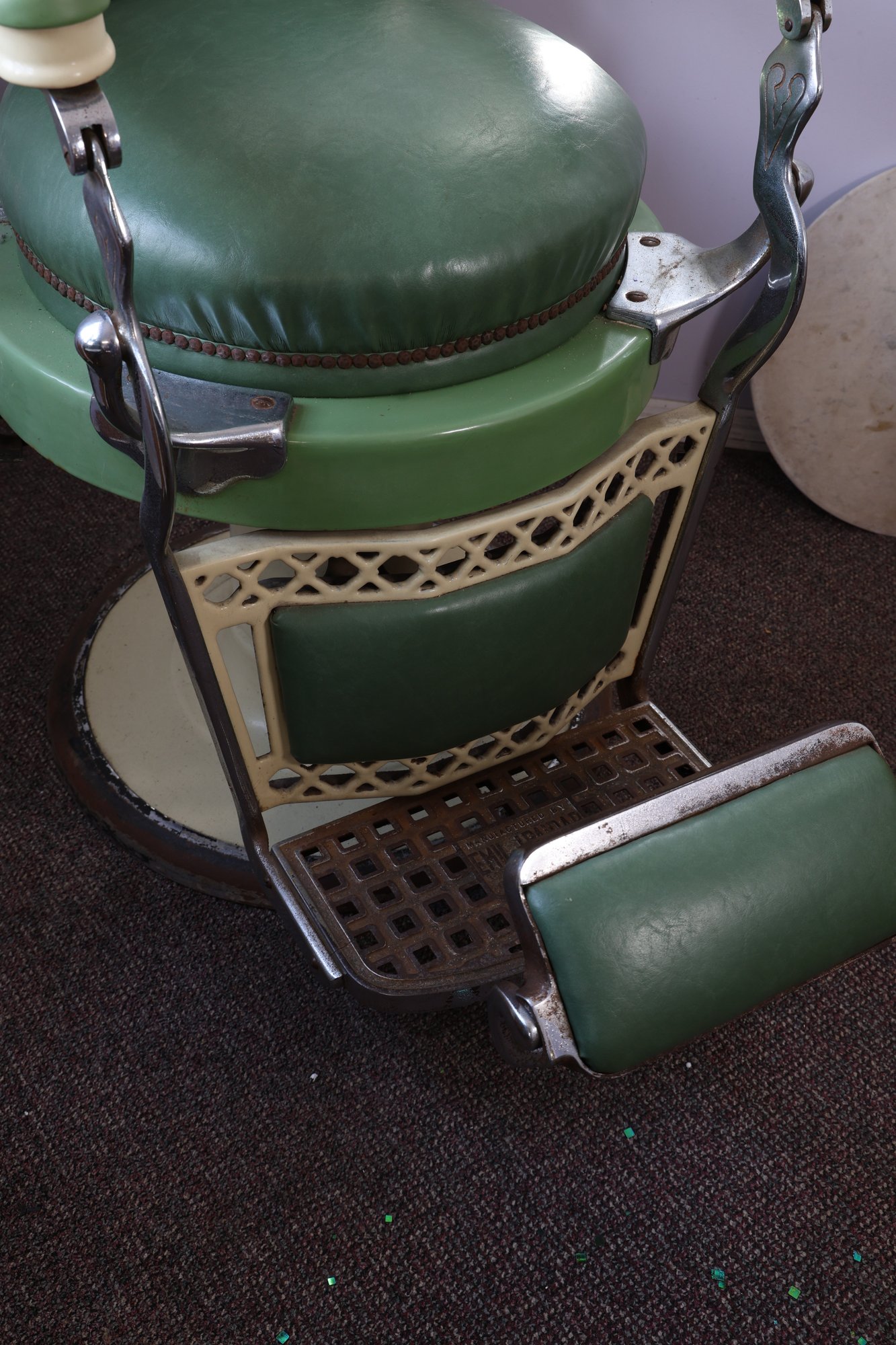 Antique completely working hydraulics by Emil J. Paidar barber chair features adjustable height, operated by a foot jack or side lever. It can rotate or lean backward, ideal for hair washing and shaving. In certain states, a headrest is legally required for shaving. Constructed from heavy-duty metal and leather for durability. Metal components and porcelain enamel show some age, but overall, very nice.