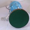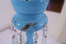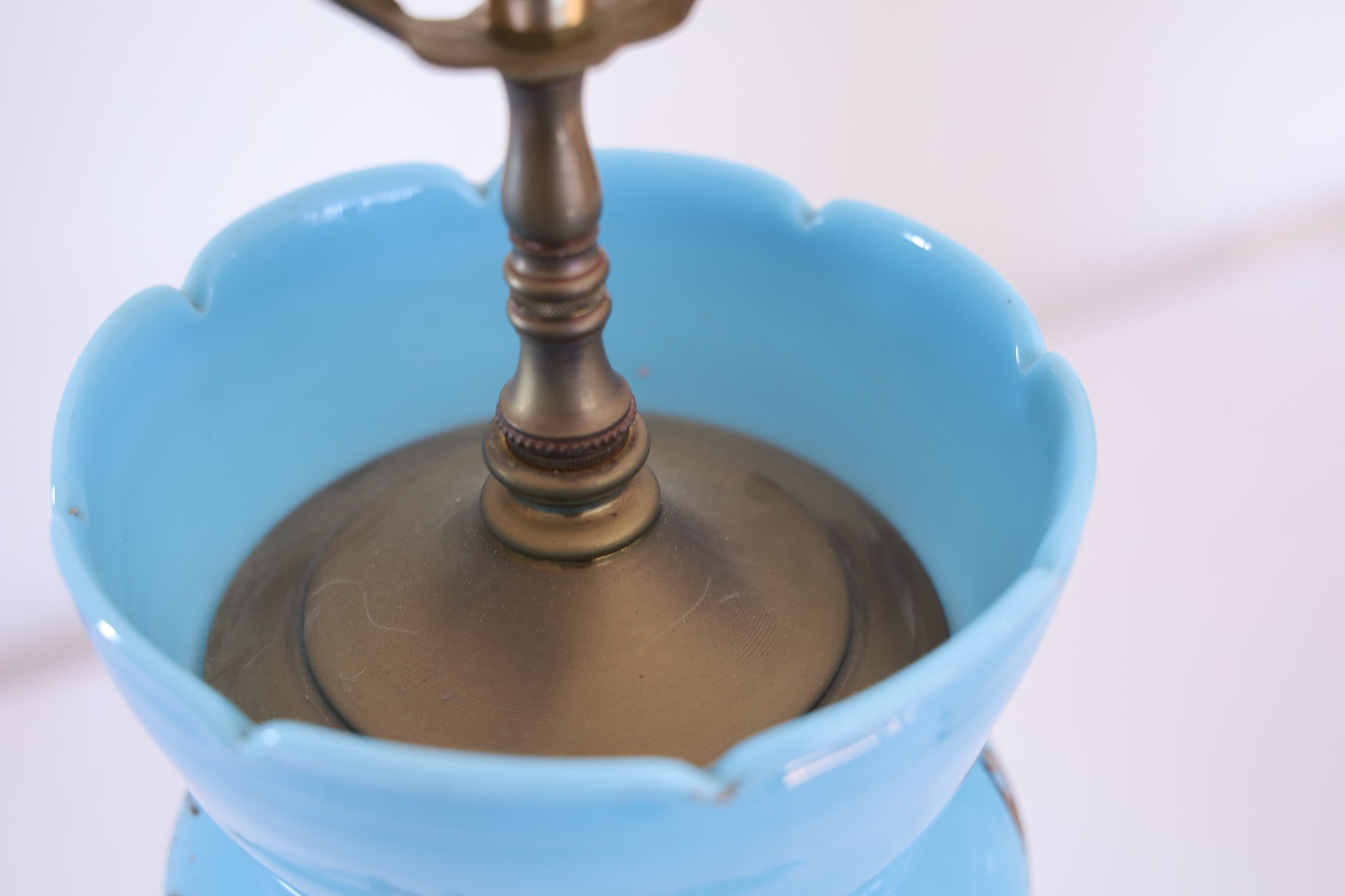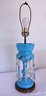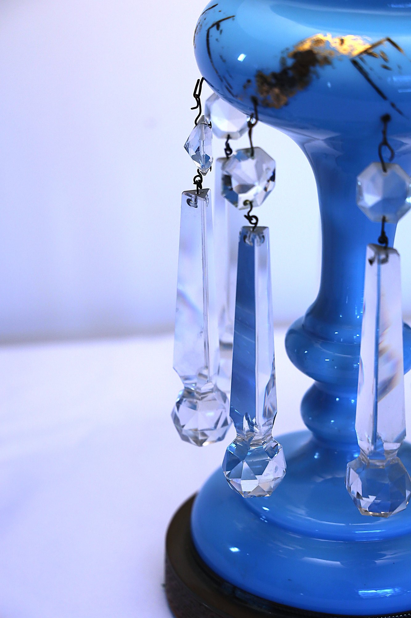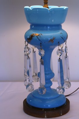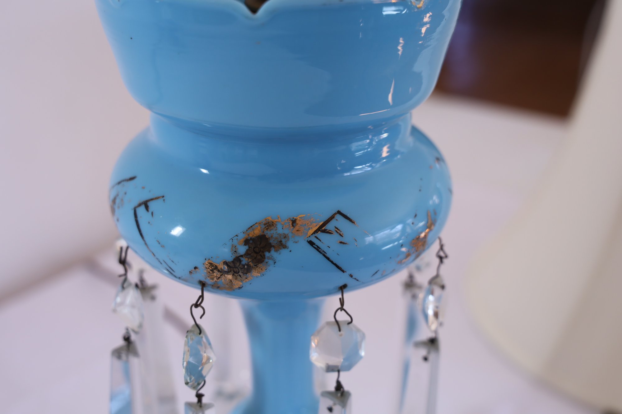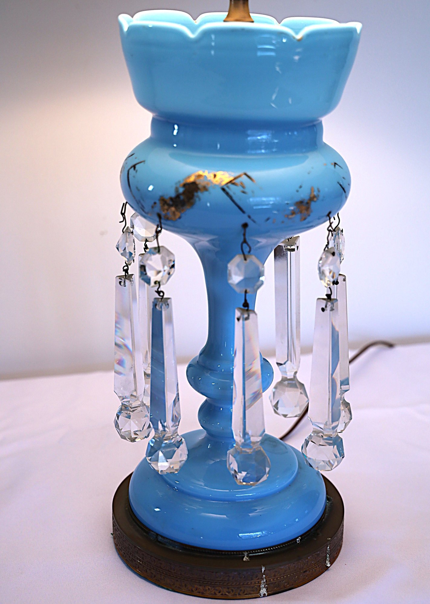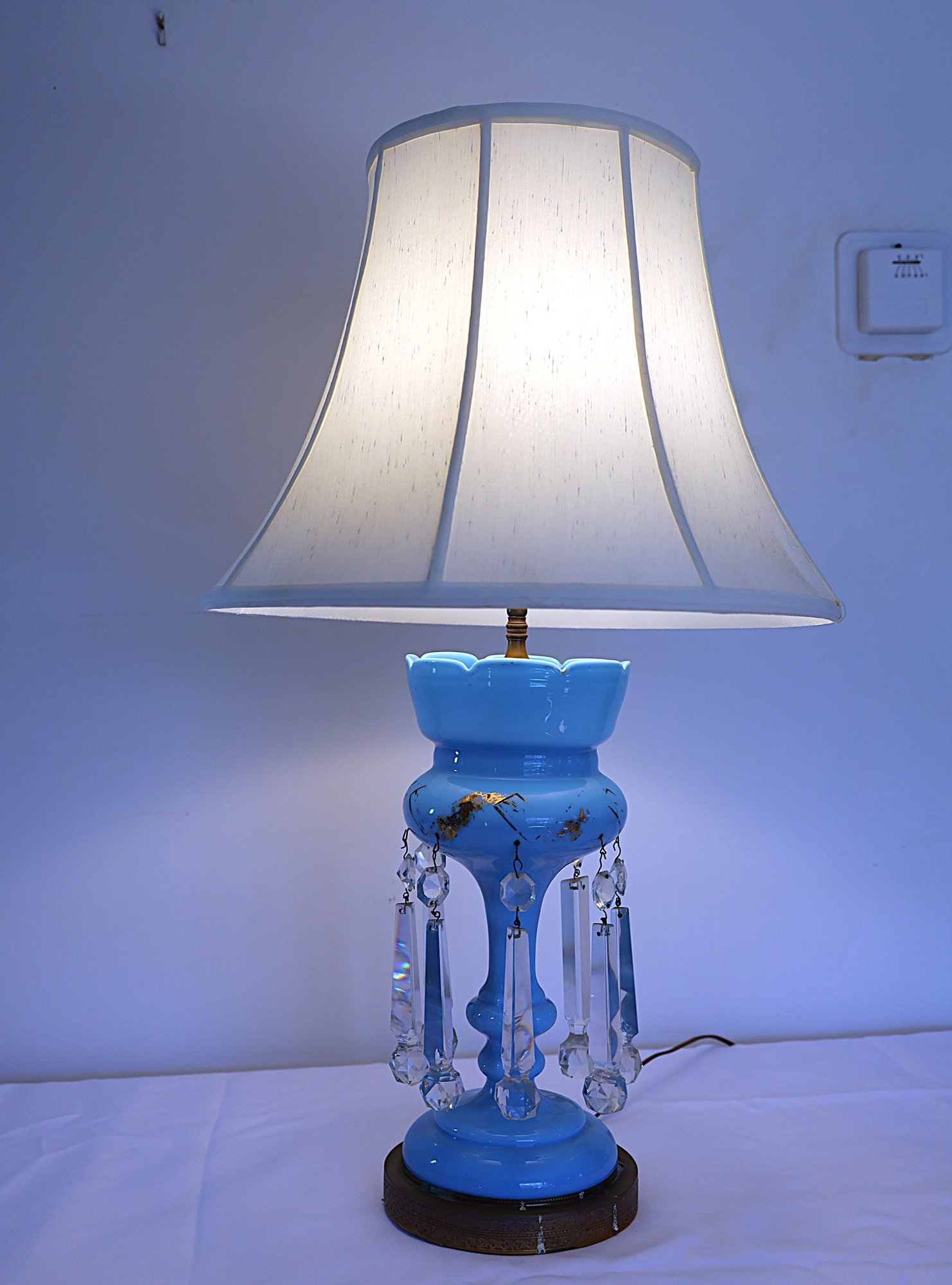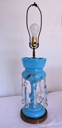 Works when tested—one prism has a small nick. The gold design is worn but is otherwise in nice condition. Measures 29 inches with shade.