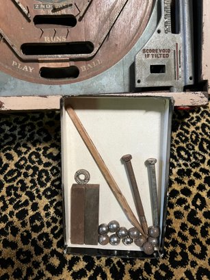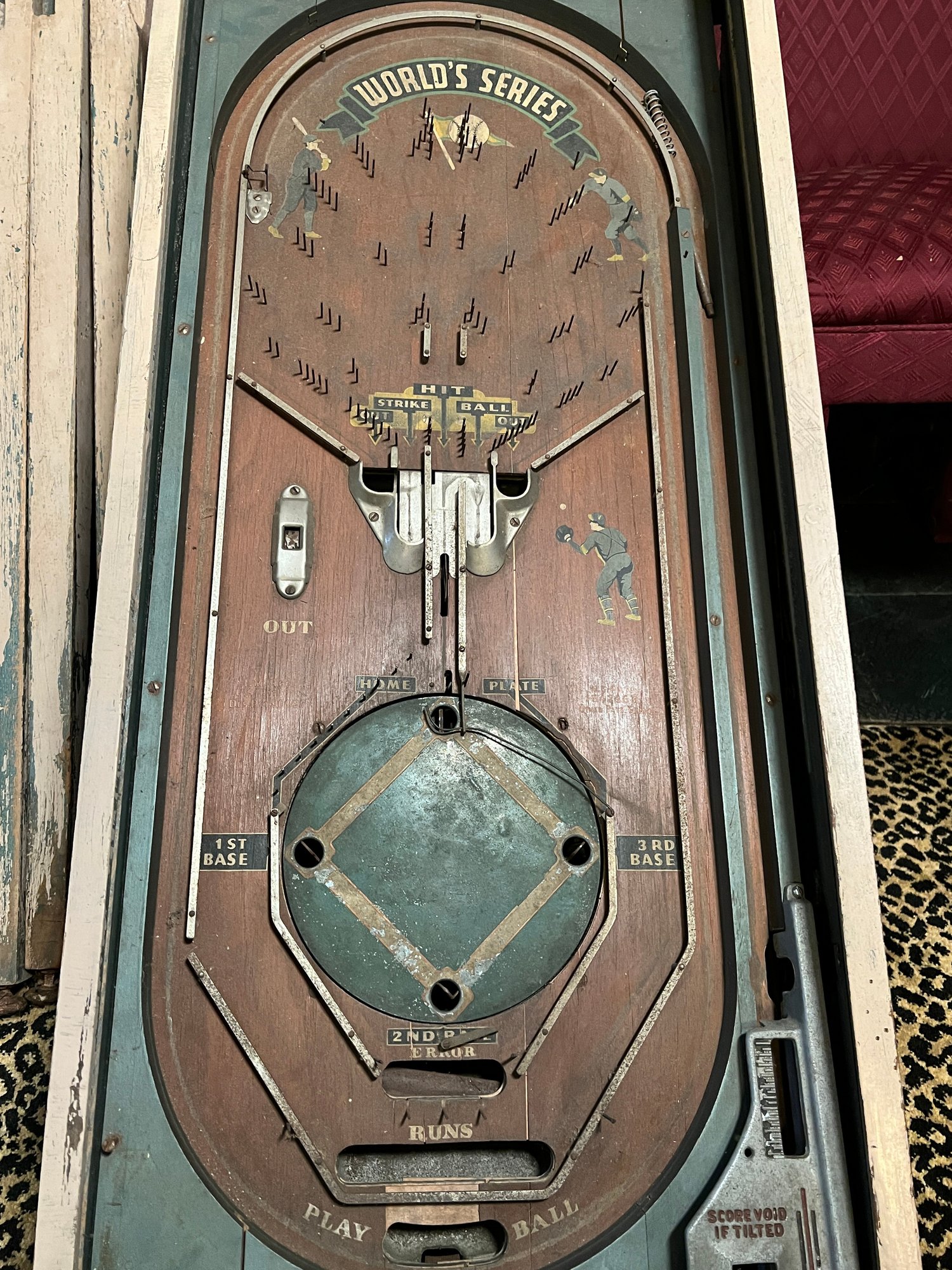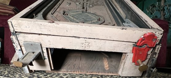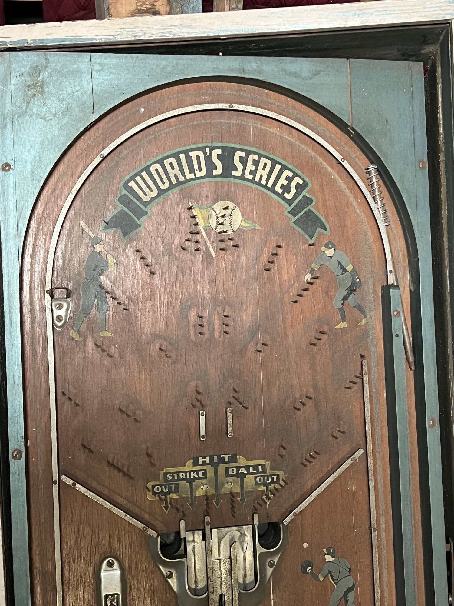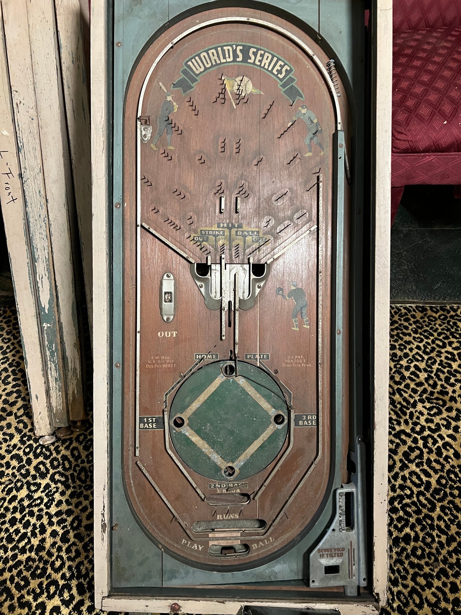 The 1934 Rock-Ola "World Series" baseball pinball machine is a fully mechanical, clockwork-operated arcade game with no electrical parts. It features animated playfield action, with balls moving around the bases, and players use 15 balls in an attempt to score 12 runs or achieve 3 outs. Only about 4,000 units are believed to have survived out of the 70,000 produced. This machine needs assembly and cleaning; all the legs are appear to be there. It measures 16" wide by 36" tall. A great project for restoration.