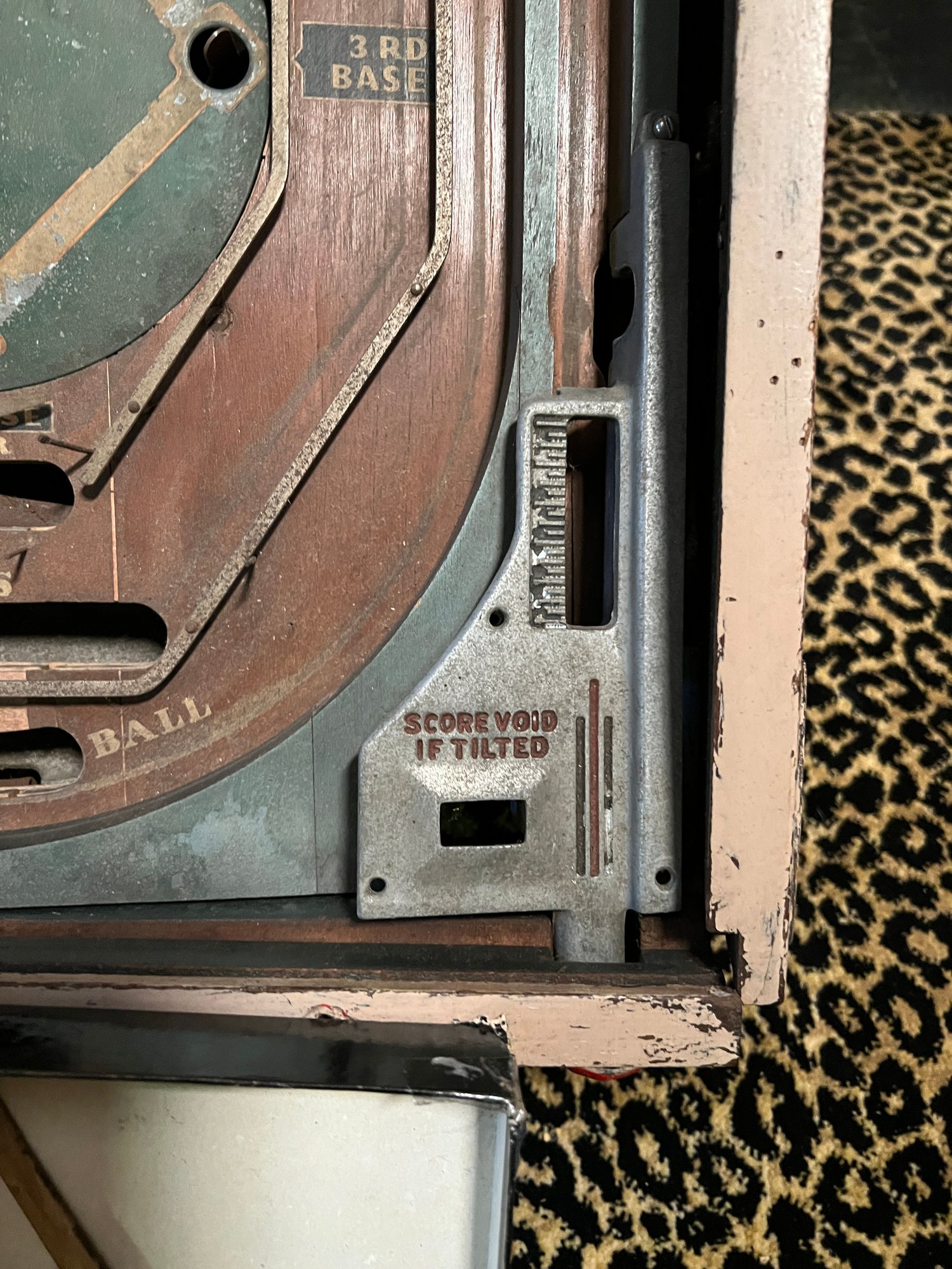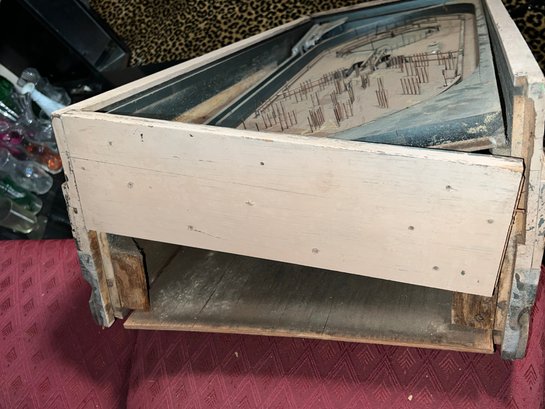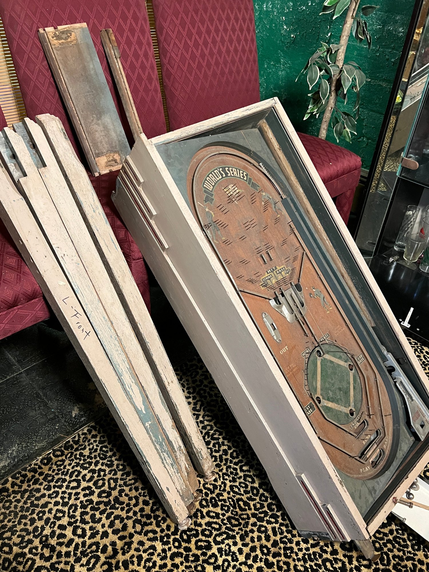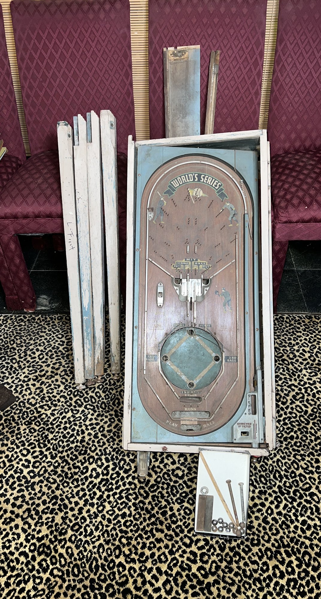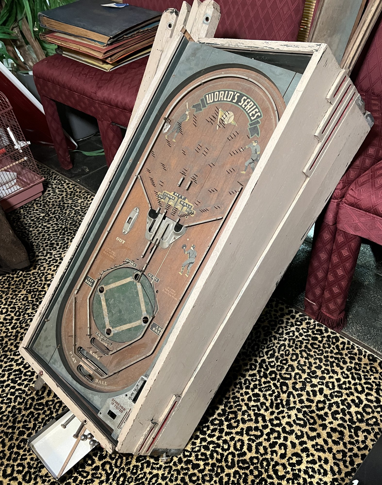 The 1934 Rock-Ola "World Series" baseball pinball machine is a fully mechanical, clockwork-operated arcade game with no electrical parts. It features animated playfield action, with balls moving around the bases, and players use 15 balls in an attempt to score 12 runs or achieve 3 outs. Only about 4,000 units are believed to have survived out of the 70,000 produced. This machine needs assembly and cleaning; all the legs are appear to be there. It measures 16" wide by 36" tall. A great project for restoration.