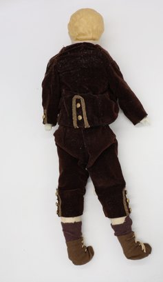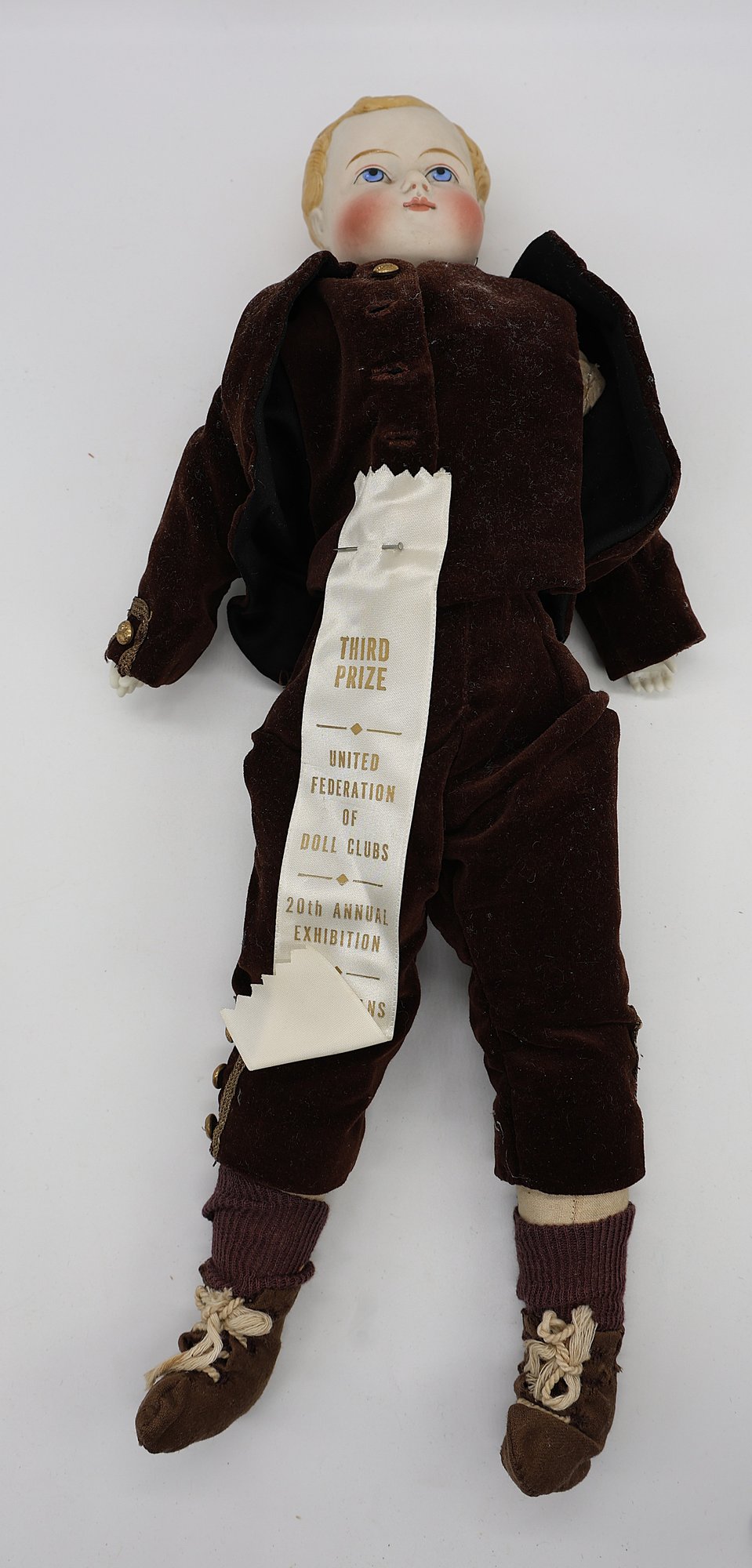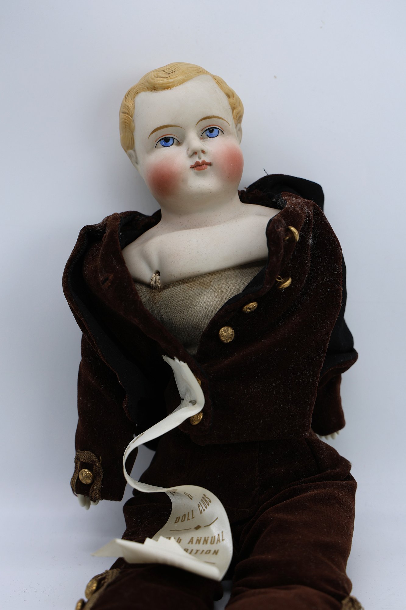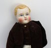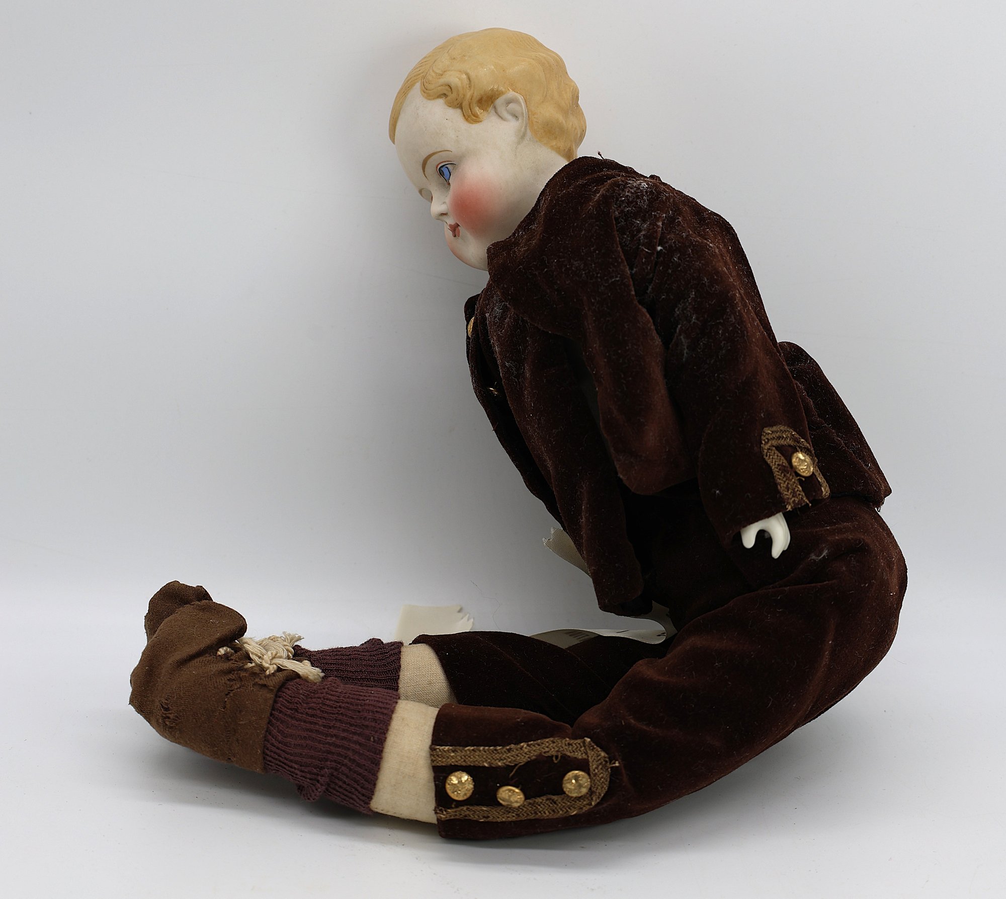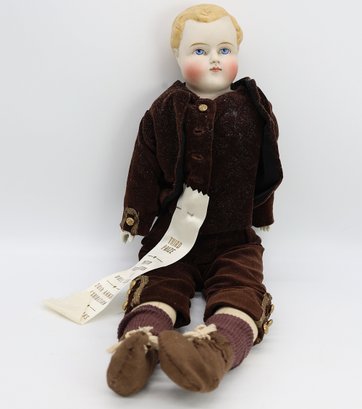 Bisque head, hand painted boy doll with blonde hair with blue eyes and bisque hands, cloth body.