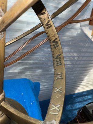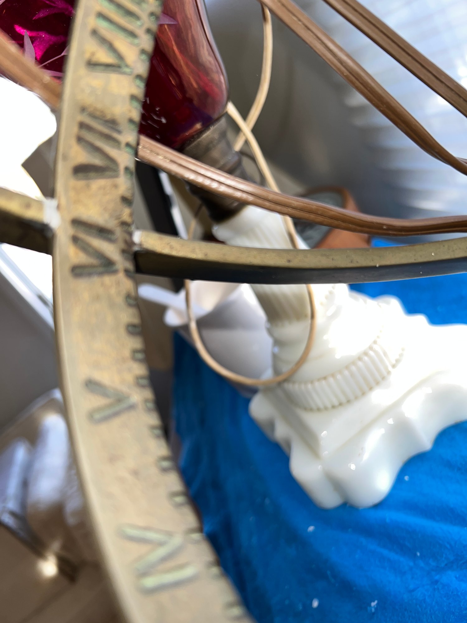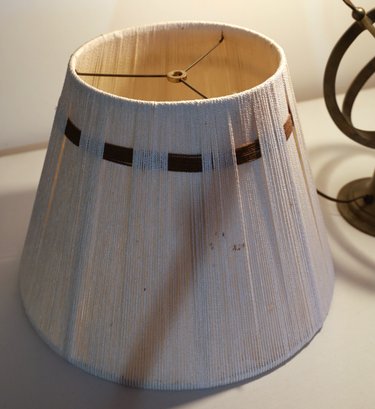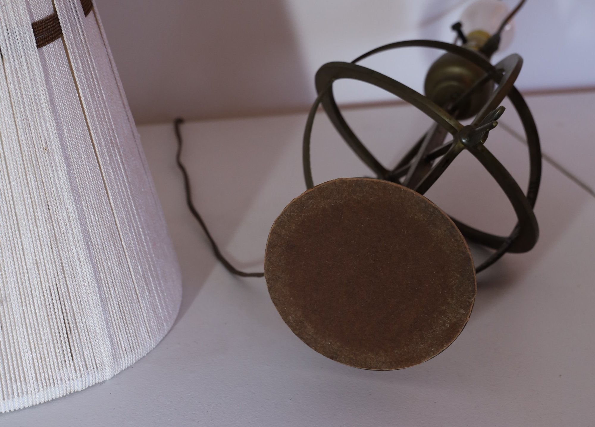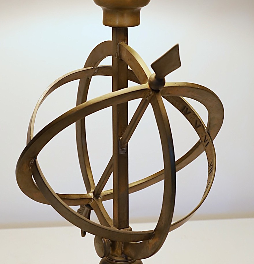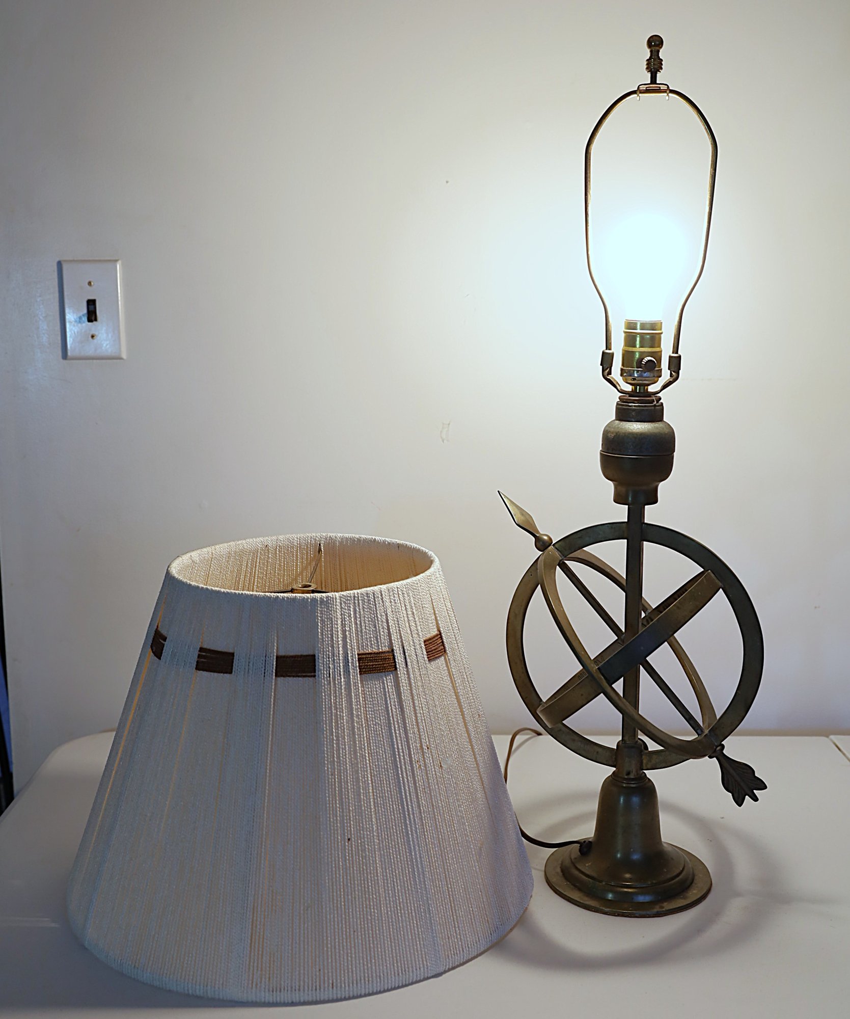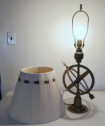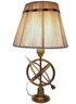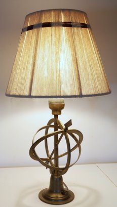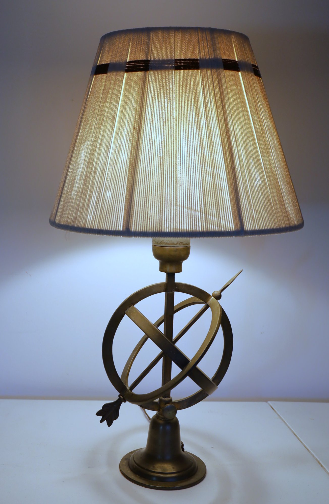A unique table lamp showcases an armillary sphere on a pedestal base, crowned with a sheer, conical shade. The overall design combines elements of scientific instrument aesthetics with a classic lamp form. Tested and functional, it stands at 28.5 inches high.