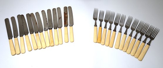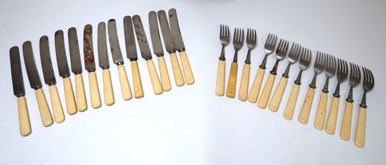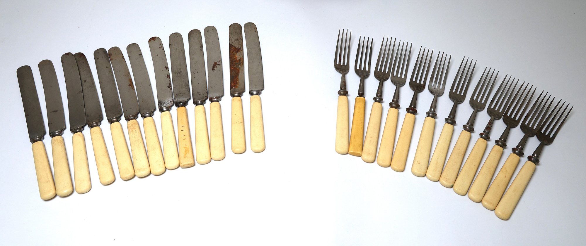 12 four-prong forks and 13 knives need cleaning; some have rust. See photos.