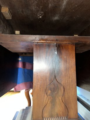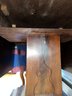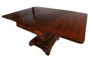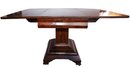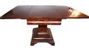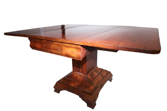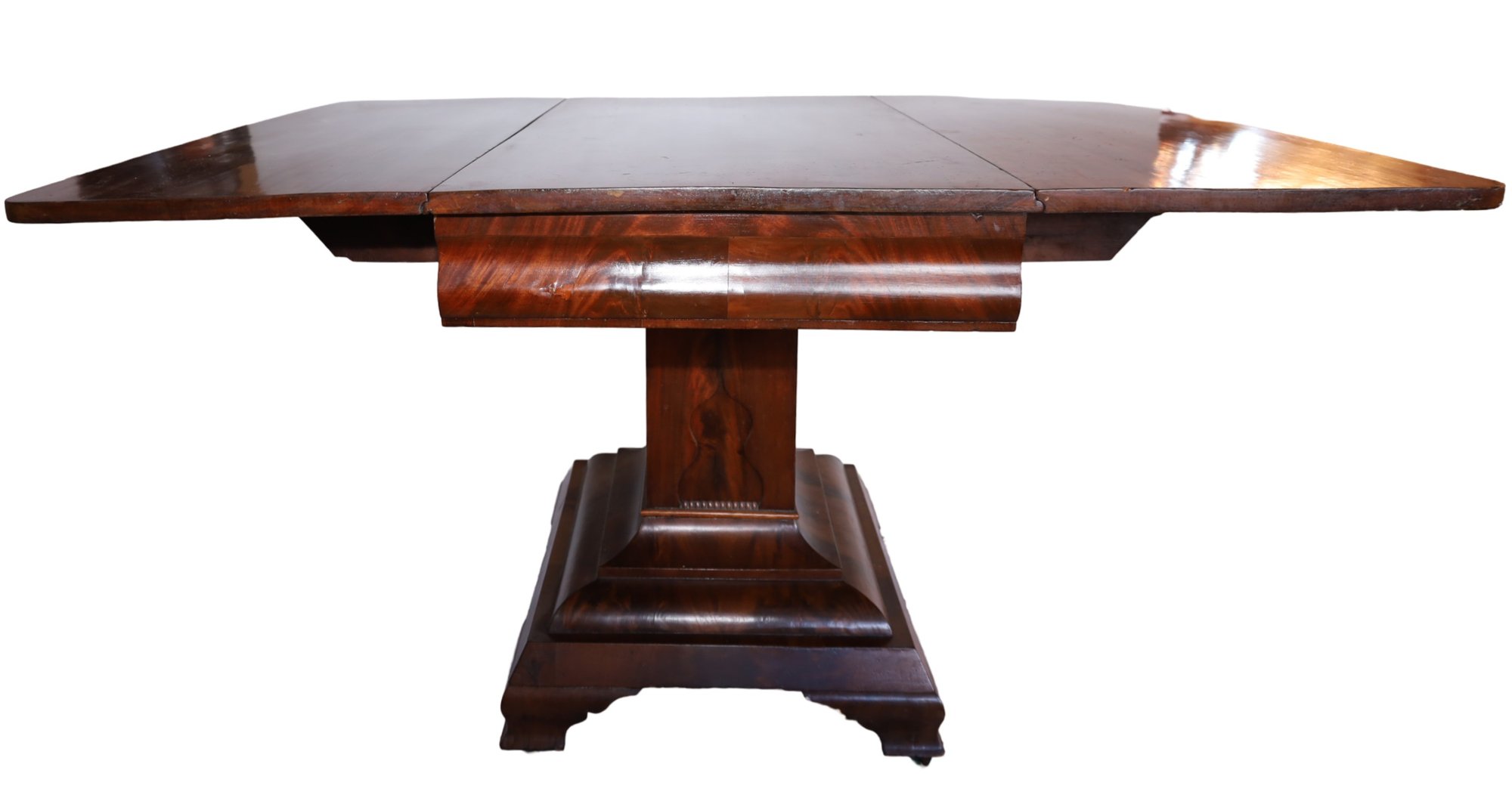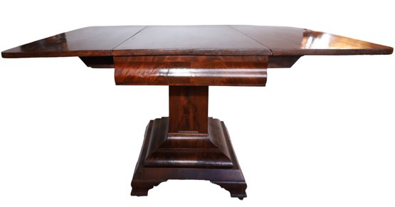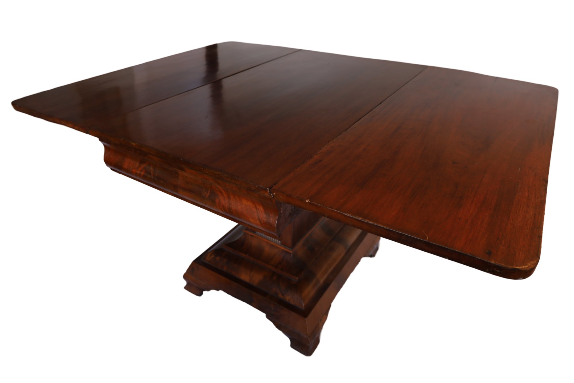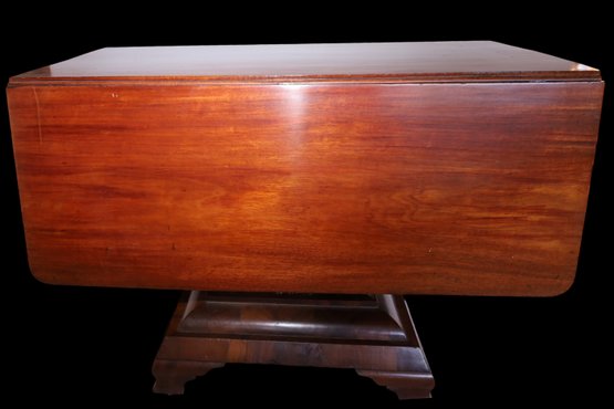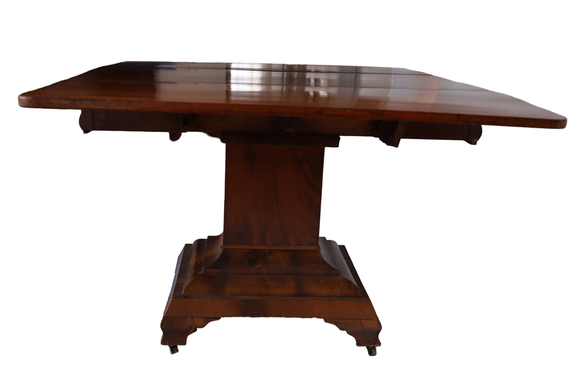 The table features a central pedestal mounted on wheels for easy movement. It has a flame mahogany base and is in nice condition with normal wear for its age. Please refer to the photos for details. Dimensions: 41.5"D x 2.25"W when closed, 52.75" when open, and 29.5"H.