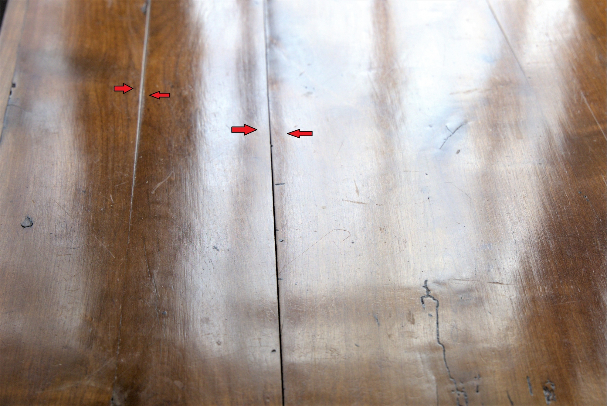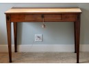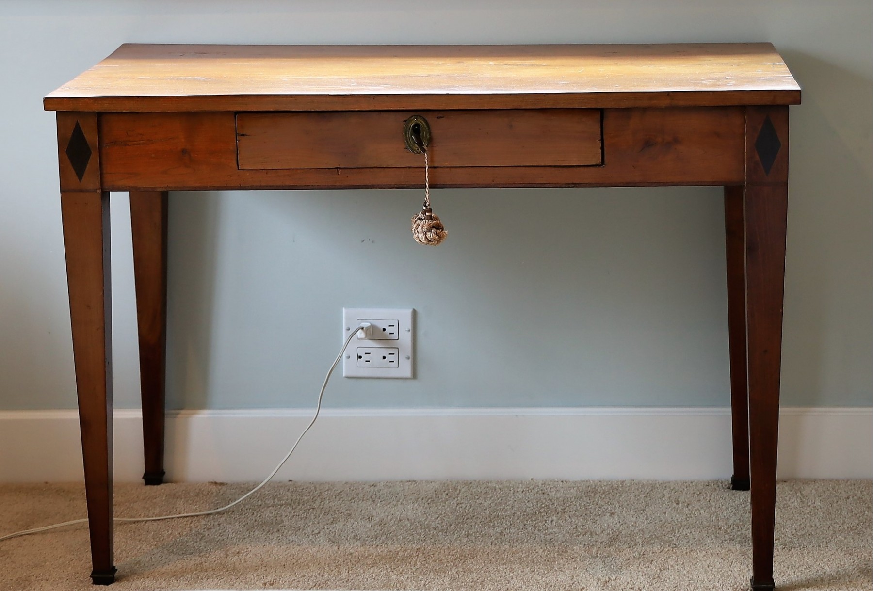 19th century desk has diamond inlay and 1 pegged drawer with an old key. Top has a split but it is a solid piece. Great patina!