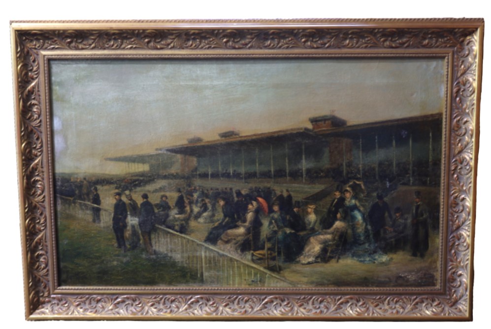 19th C French School A Day At The Racetrack. Provenance Doyles Auction House 2014. Oil on Canvas Some painting missing, See photos. 38.5"W x 23"H
