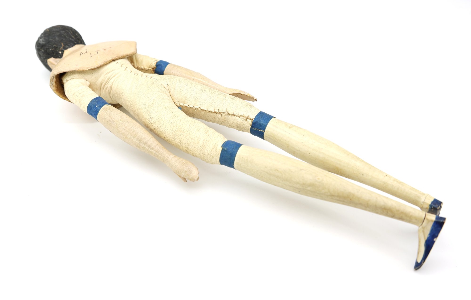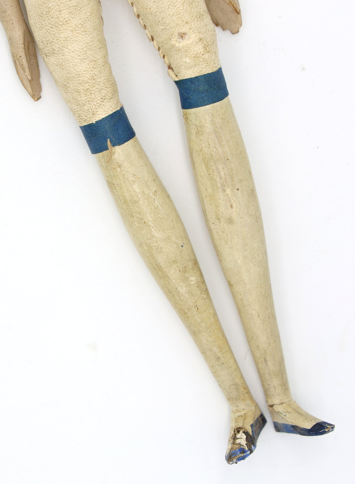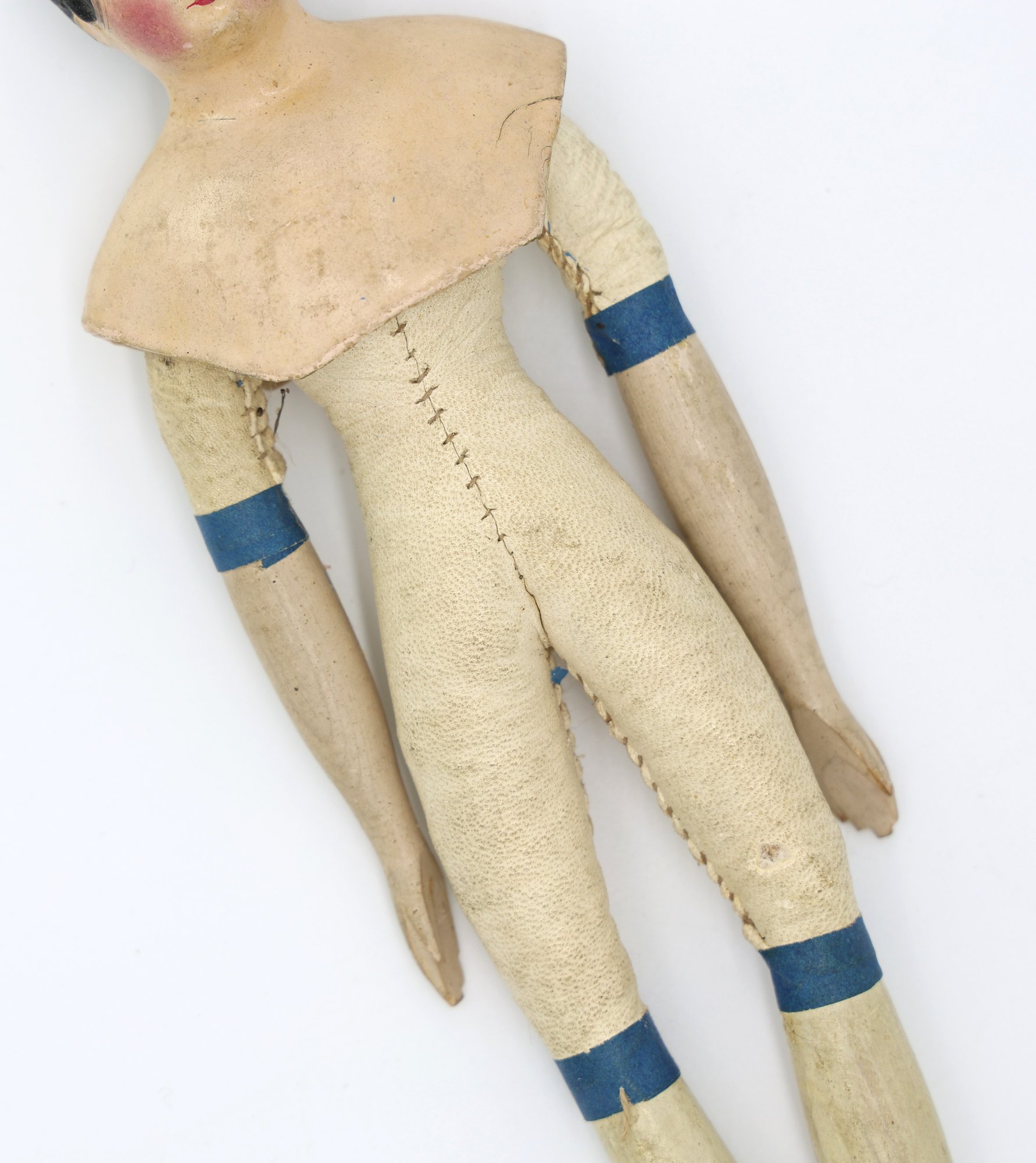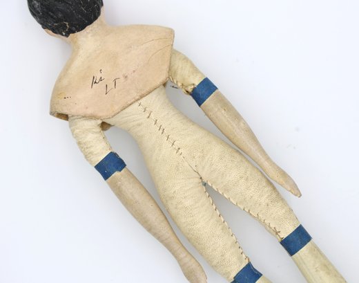 Hand painted , leather and wood. Signed on back. Kid leather body with wooden limbs and blue bands at elbows and knees. Dark ringlets hair. Nice condition with wear