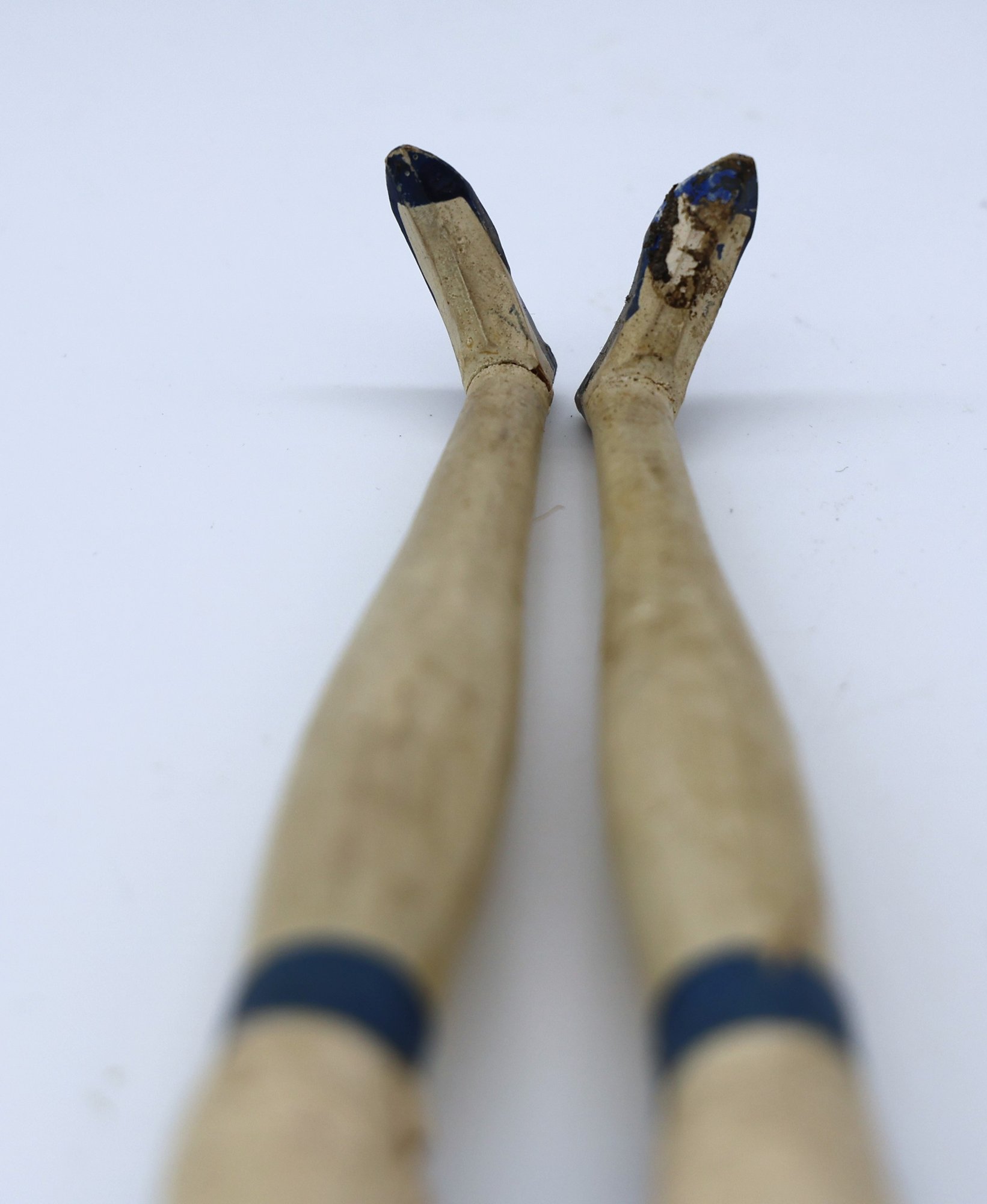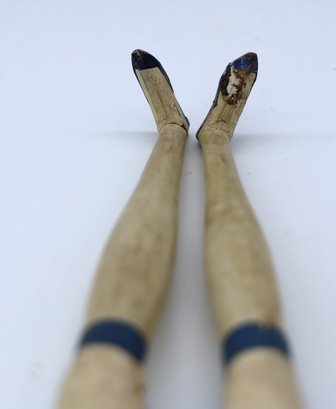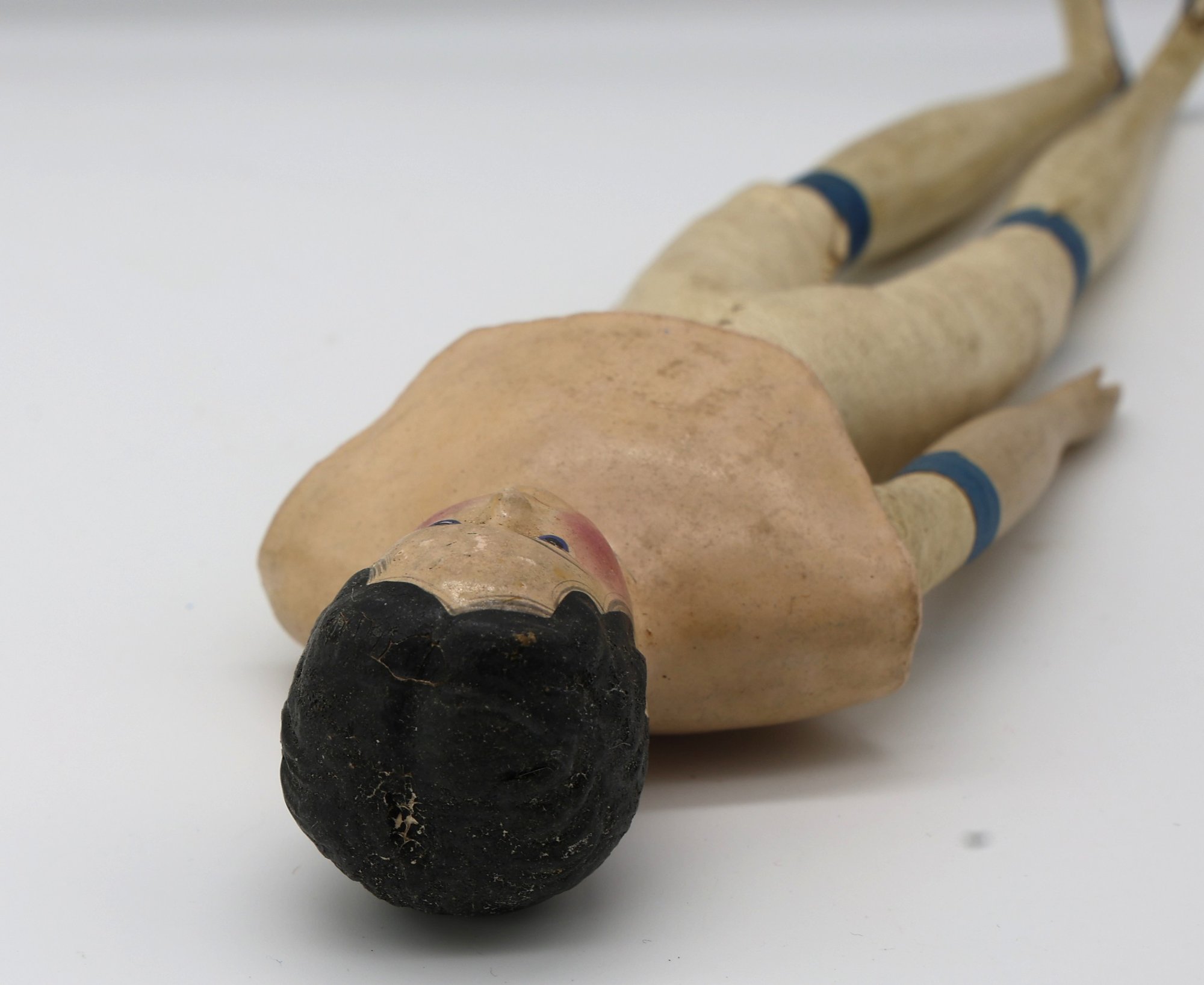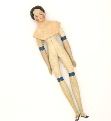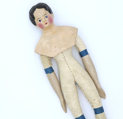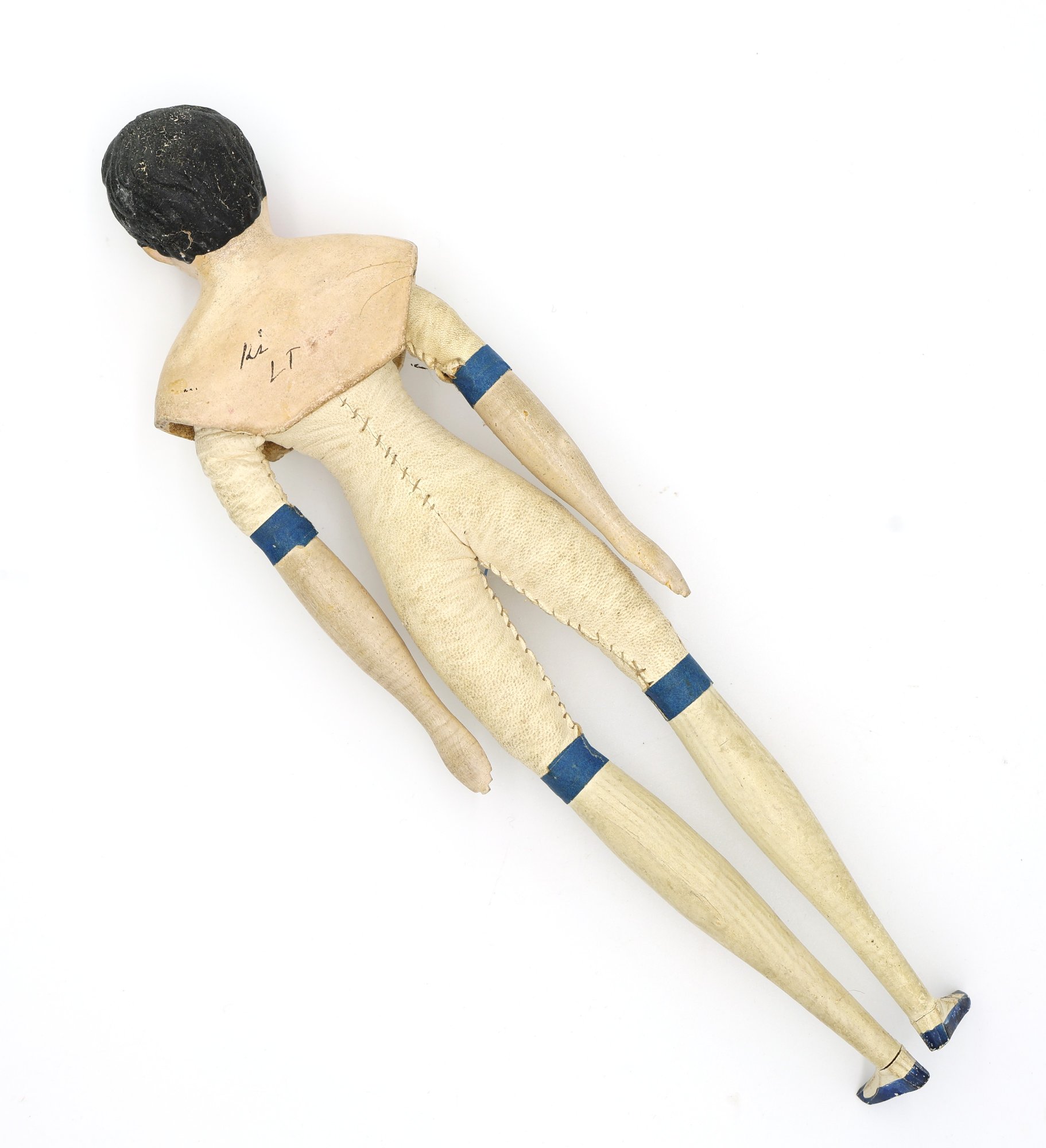 Hand painted , leather and wood. Signed on back. Kid leather body with wooden limbs and blue bands at elbows and knees. Dark ringlets hair. Nice condition with wear