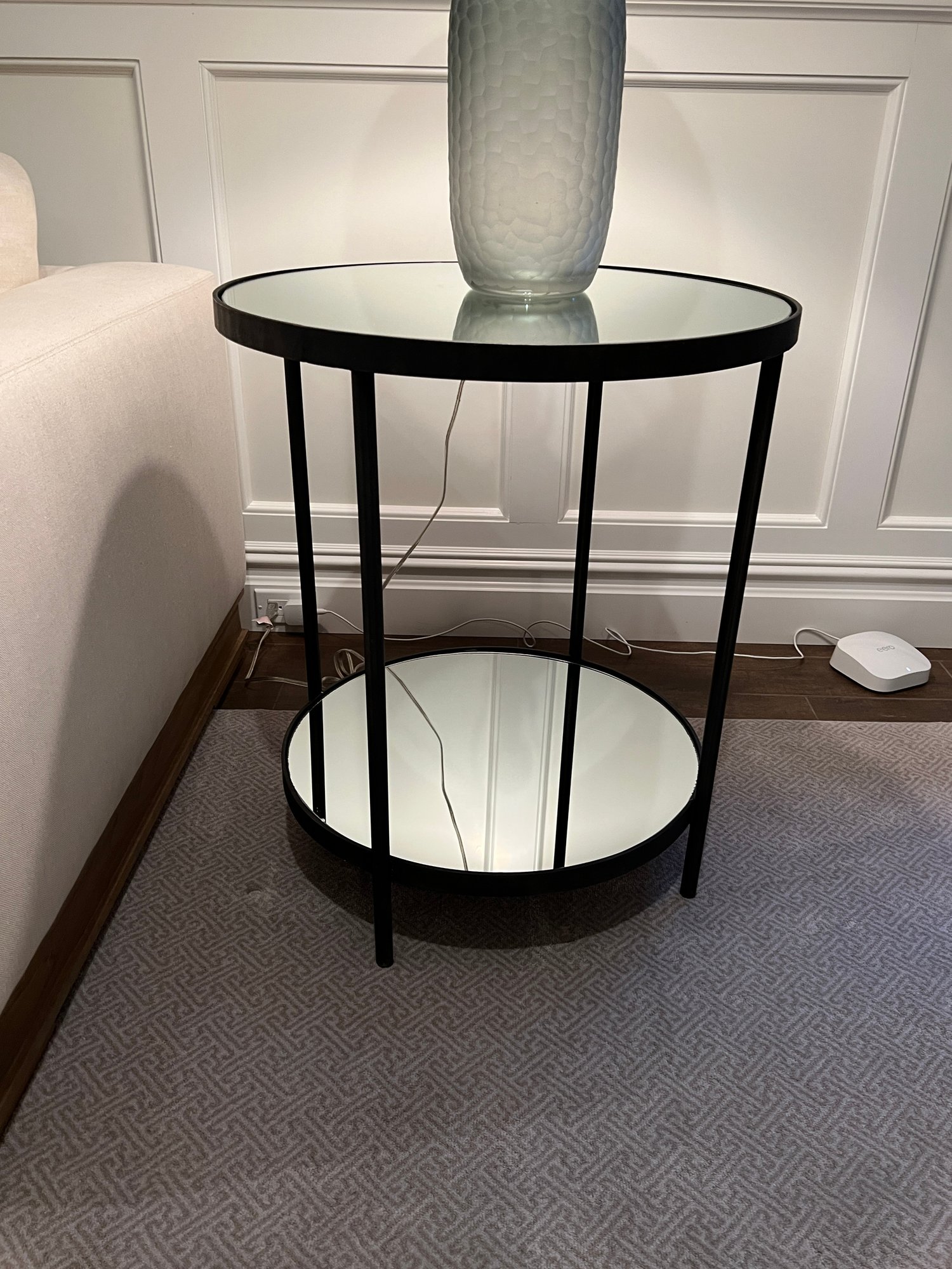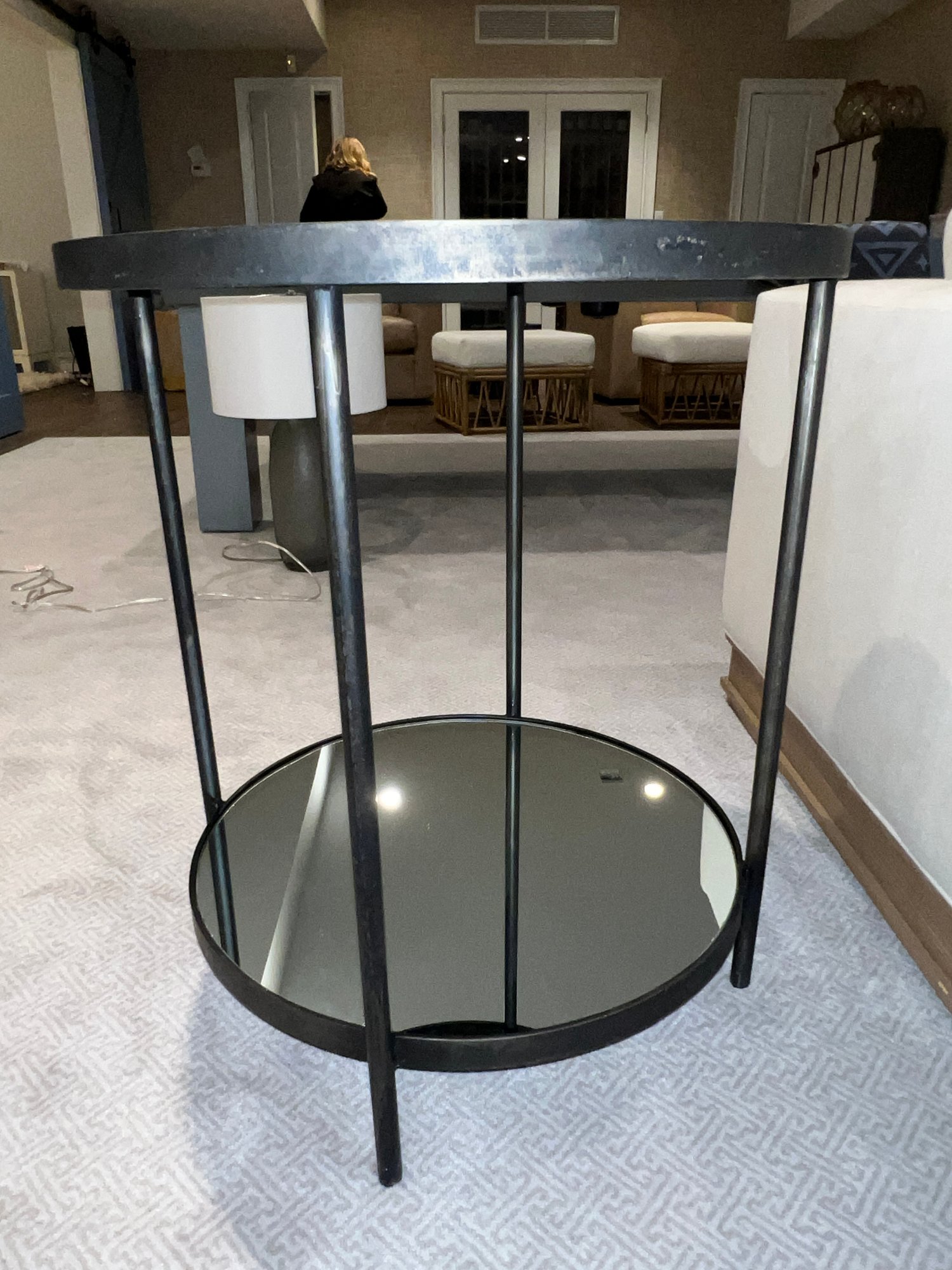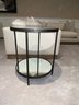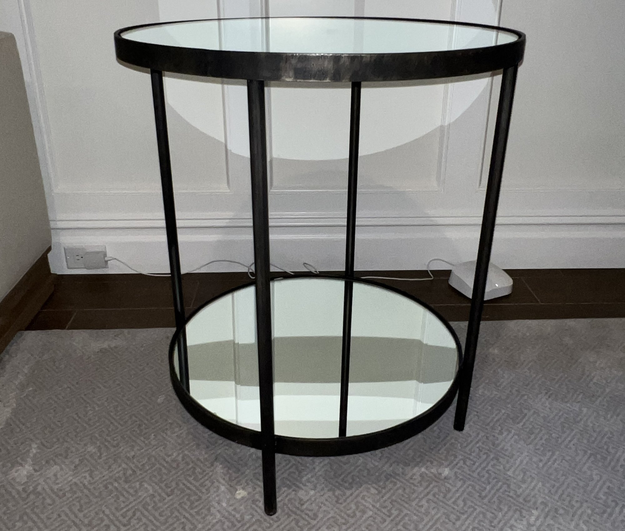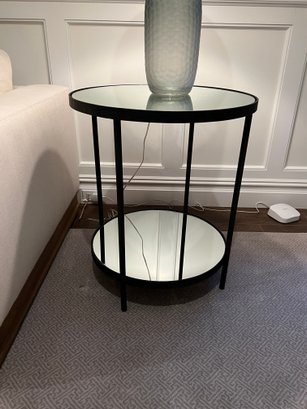 Nice condition black metal contemporary round table with top and bottom mirrored shelves.