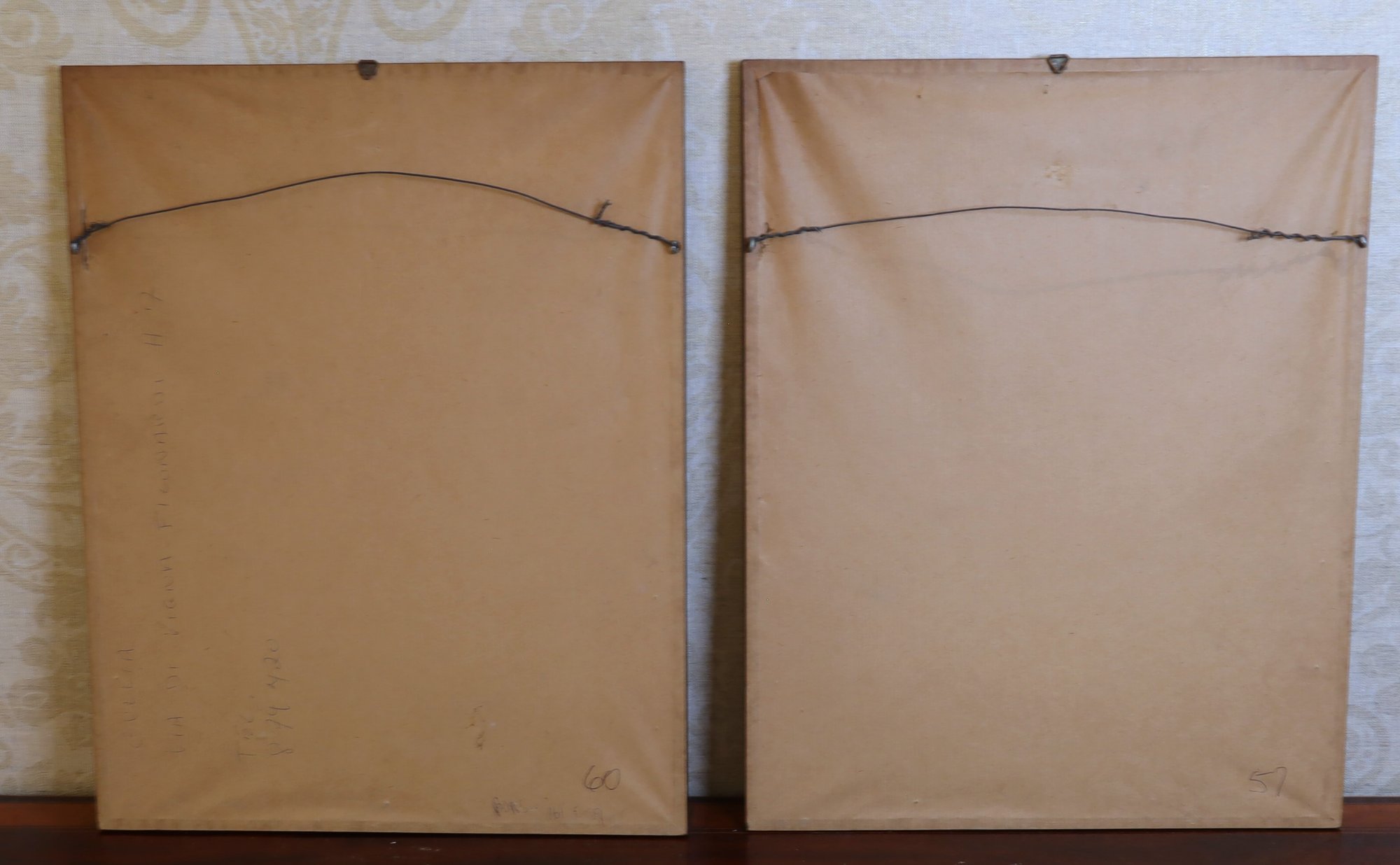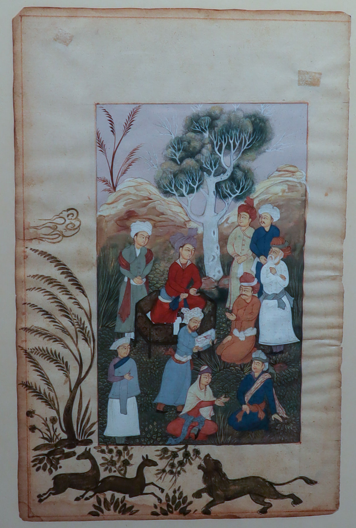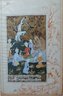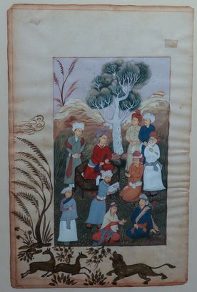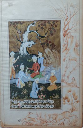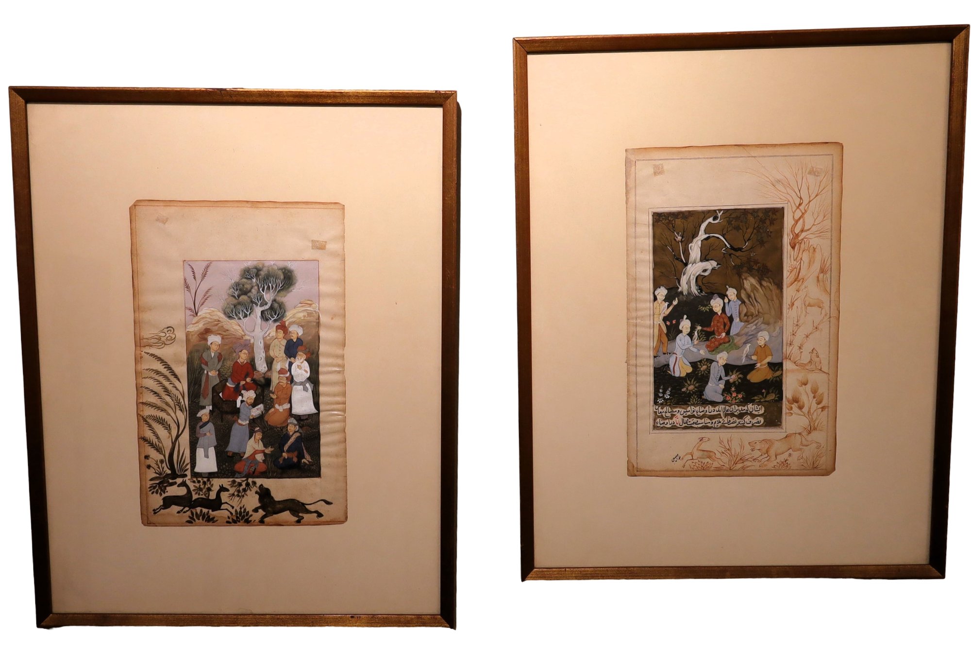 Two original Persian paintings on paper featuring animal drawings around the paintings. Beautiful, vivid colors. Framed dimensions are 12" x 15.5". From a private collection in NYC.
