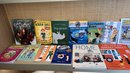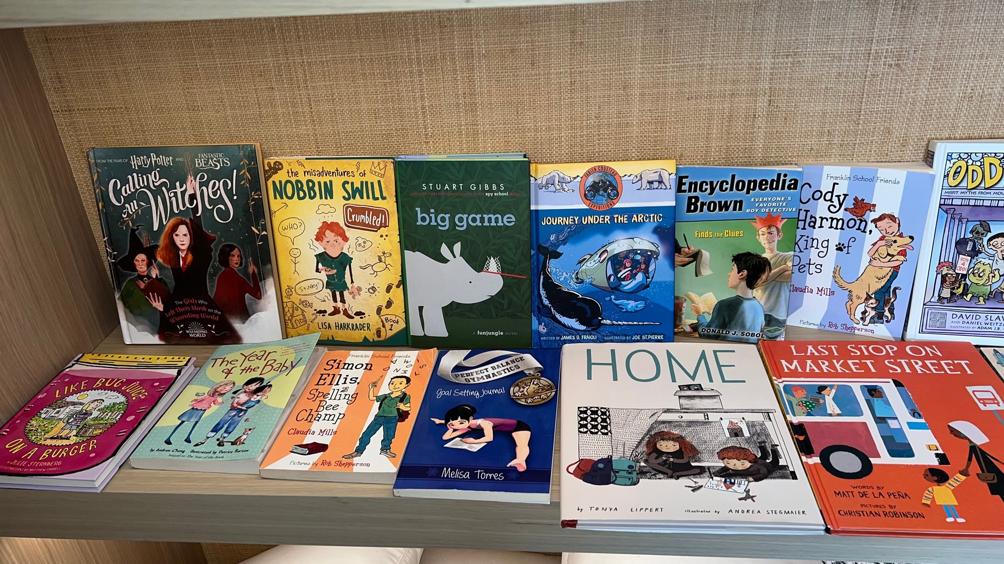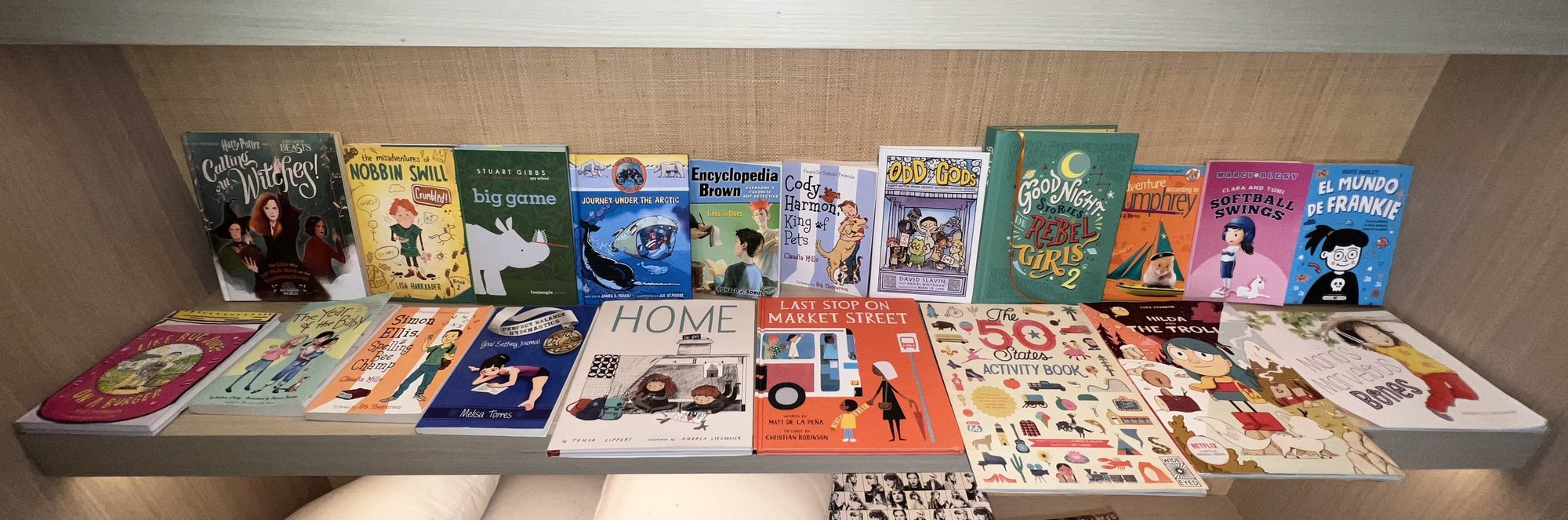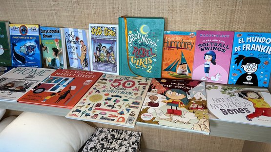 The collection includes books like The Misadventures of Nobbin Swill, Big Game, and Journey Under the Arctic. Other titles feature Encyclopedia Brown, Cody Harmon, King of Pets, and Odd Gods. The shelf also displays Good Night Stories for Rebel Girls 2, Last Stop on Market Street, and Hilda the Troll. Several books are in Spanish, such as El Mundo de Frankie and Clara and Tuni Softball Swings, and more. Nice condition.