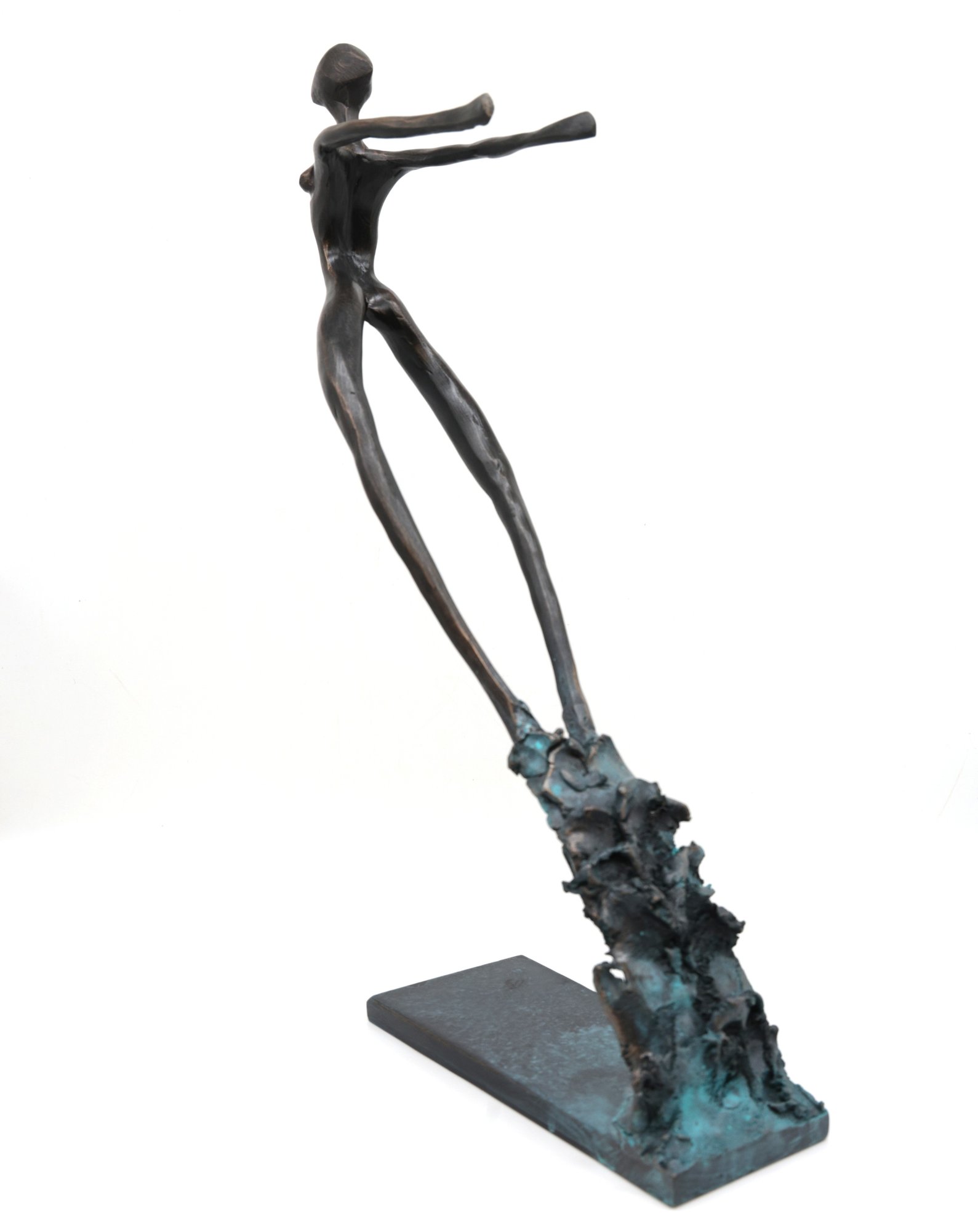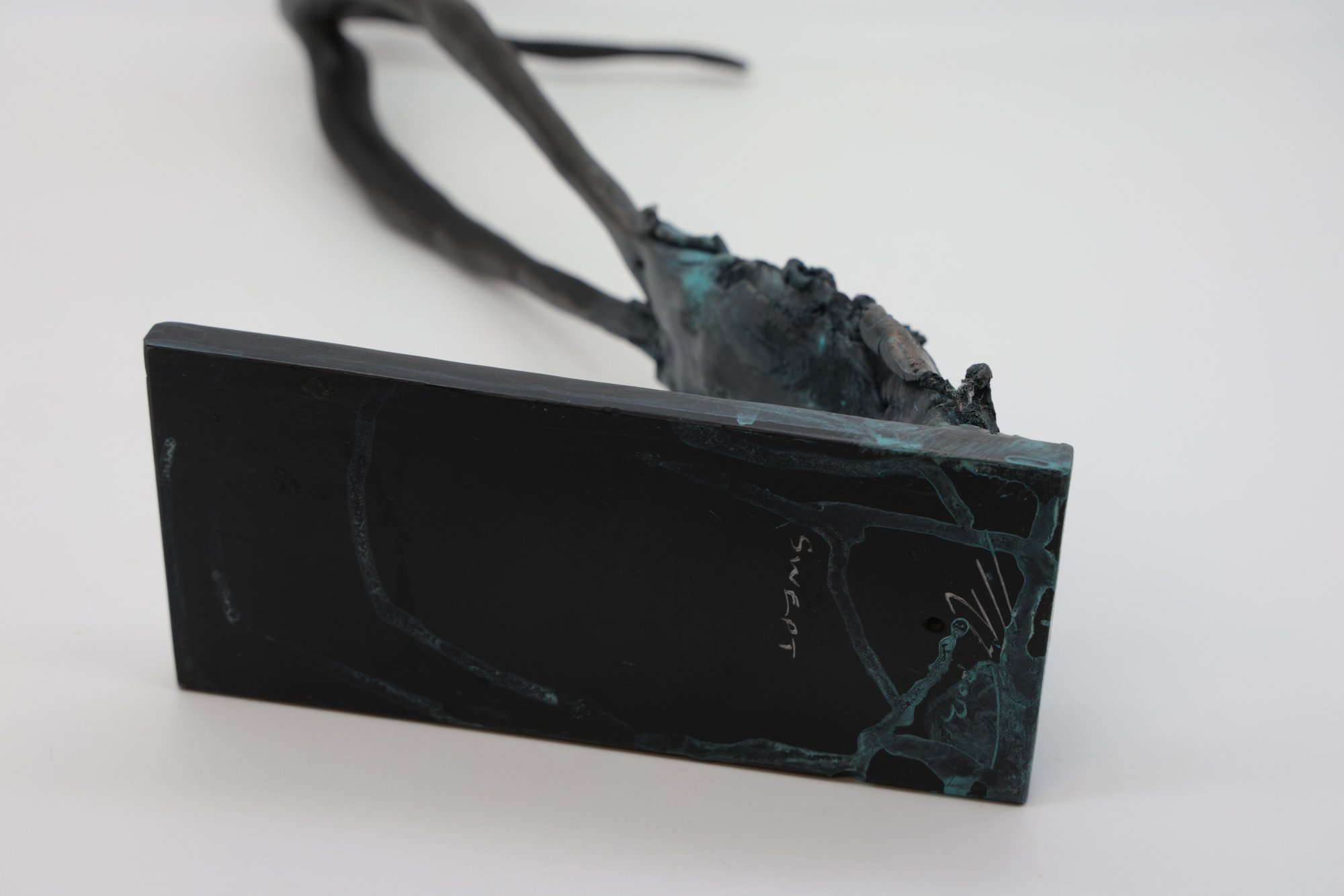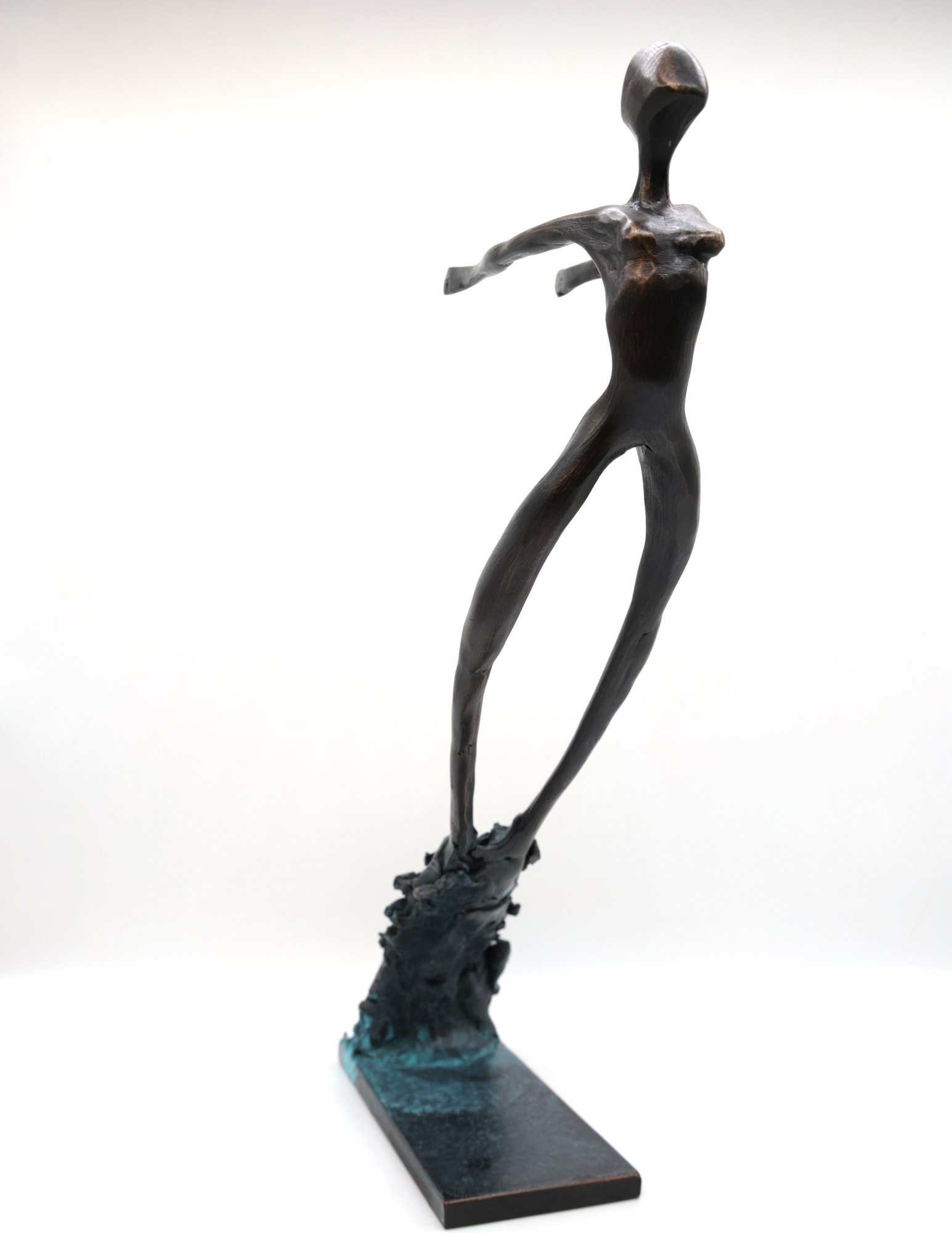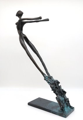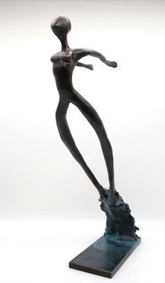 2012 Modern Abstract "Swept" Figure and Signed on base. Mixed media with blue patina base and brown and gold on figure all hand done. A wonderful piece of art!