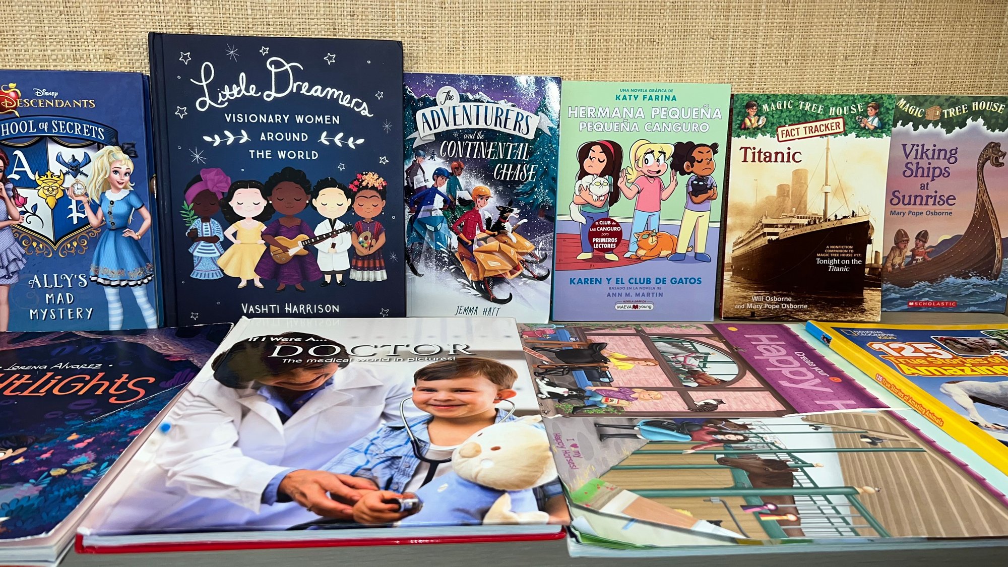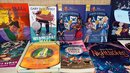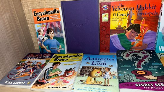 The collection features popular series and authors, including Encyclopedia Brown, Magic Tree House, The Velveteen Rabbit, and works by Vashti Harrison and Gary D. Schmidt. It includes both English and bilingual (English/Spanish) titles, such as El Conejo de Terciopelo (The Velveteen Rabbit) and Katy Farina Hermana Pequeña (Katy Farina Little Sister). The Zach & Zoe Mysteries: The Half-Court Hero by Mike Lupica, Encyclopedia Brown: Boy Detective by Donald J. Sobol, Androcles and the Lion retold by Russell Punter (Usborne First Reading series), The Name of This Book Is Secret (Secret Series) by Pseudonymous Bosch, Like Carrot Juice on a Cupcake by Julie Sternberg, illustrations by Matthew Cordell, The Adventurers and the Cursed Castle by Jemma Hatt, Nightlights by Lorena Alvarez, and more. Items are in nice condition.
