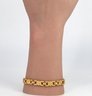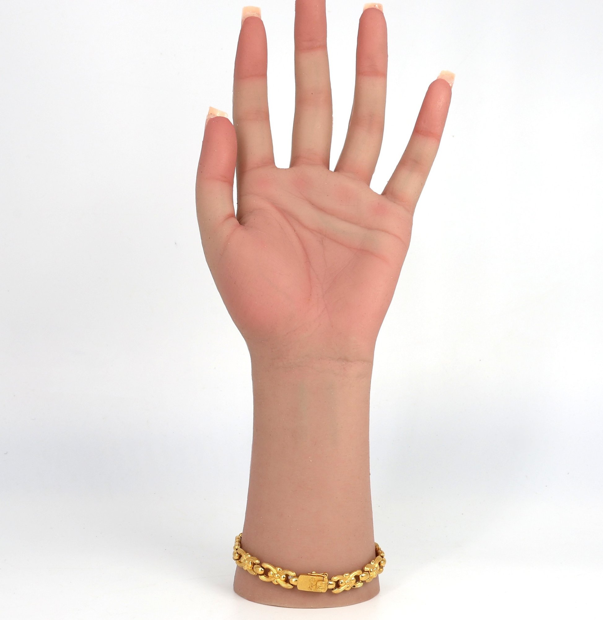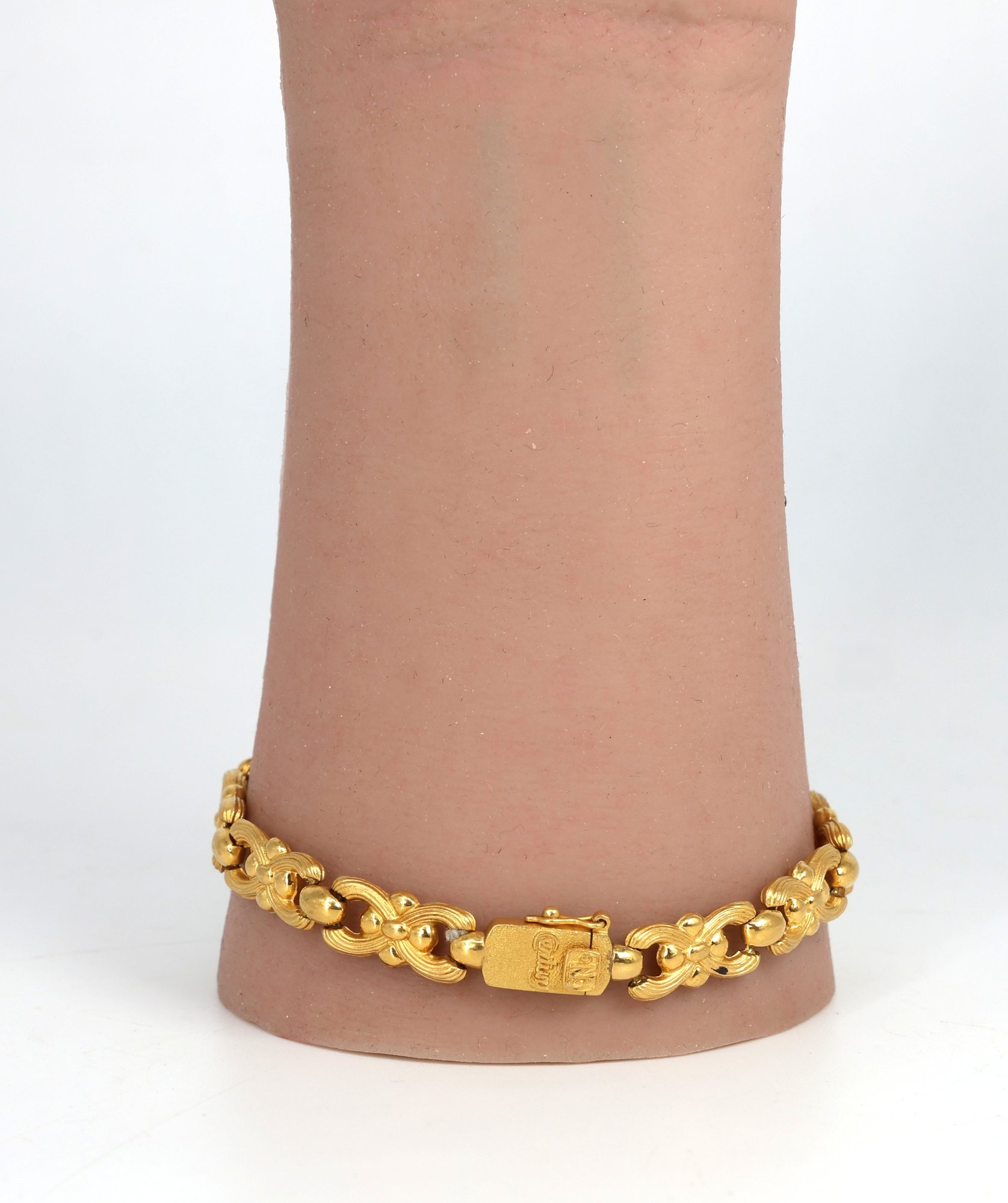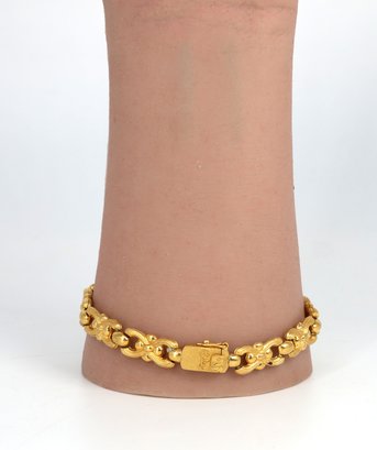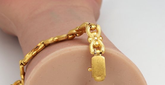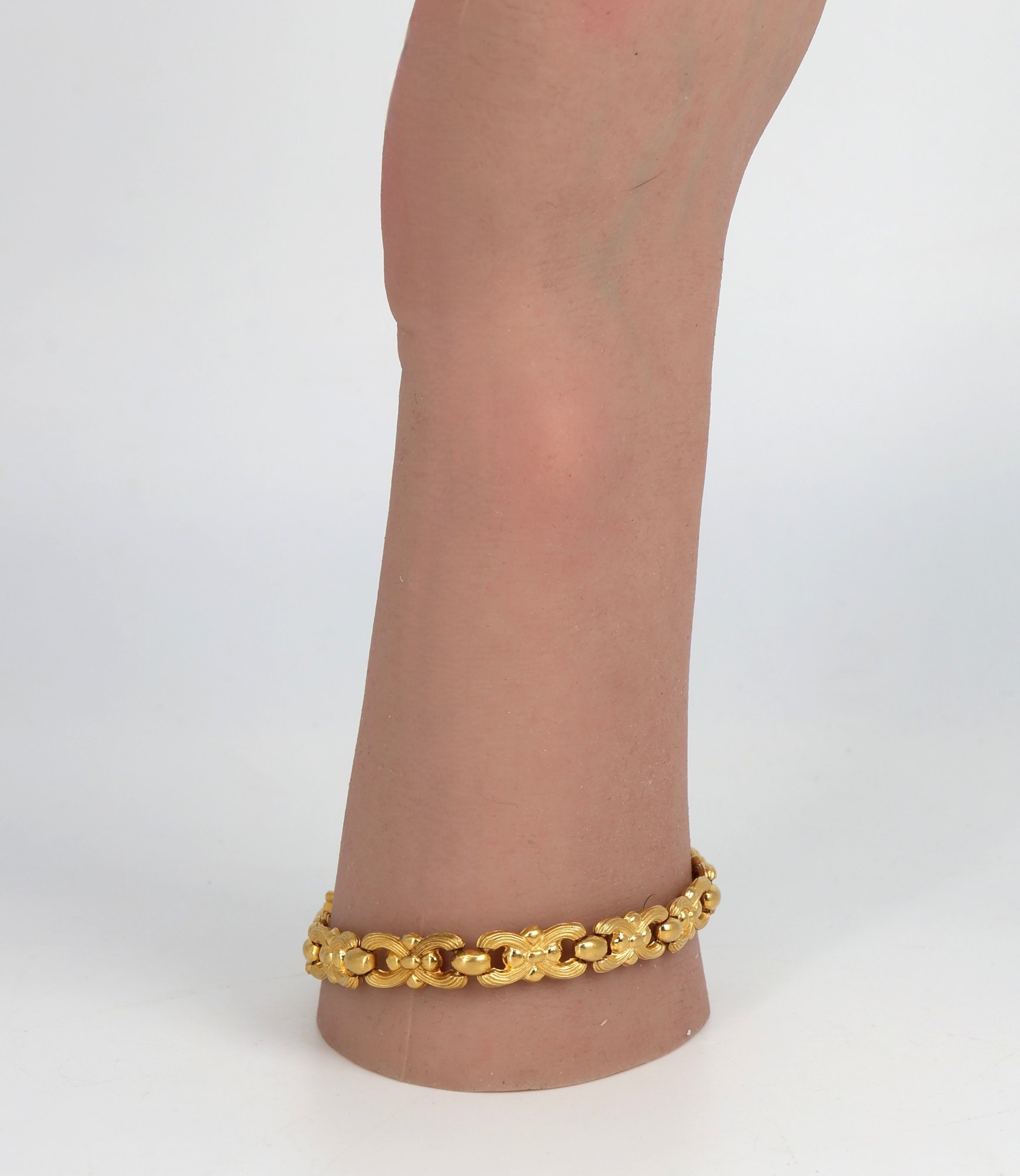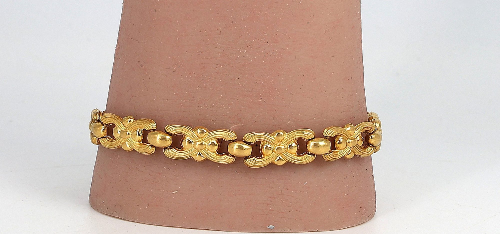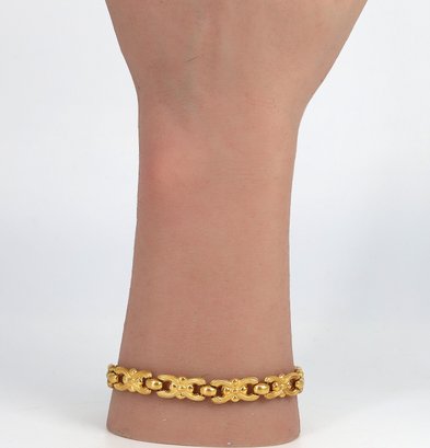 Links alternate with round, polished gold beads. Each link showcases detailed, graceful curves that resemble ribbon bows.