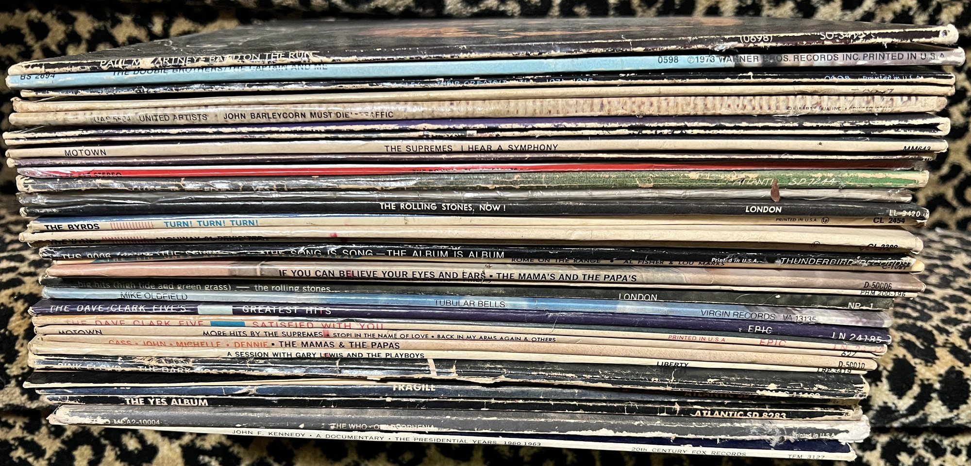 A collection of vintage vinyl records from various iconic rock and pop artists, mainly from the 1960s and 1970s.