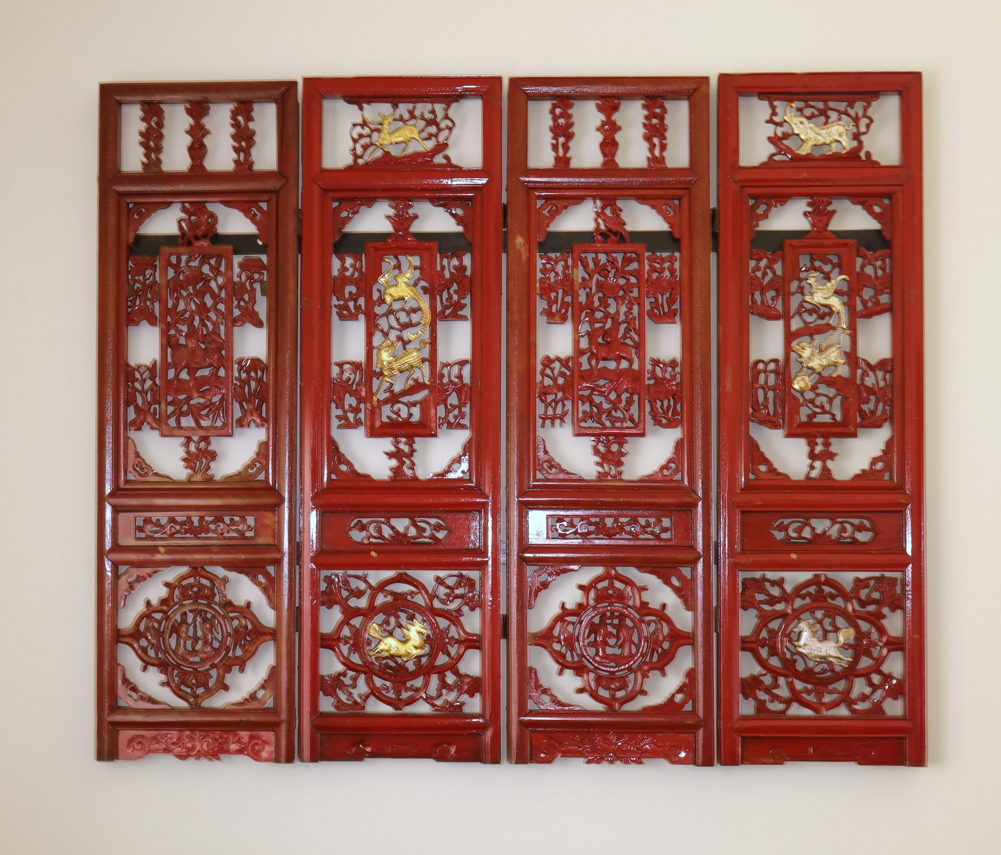 4 Wood Carved Chinese Wood Panels with red lacquer and gilding and silvering.