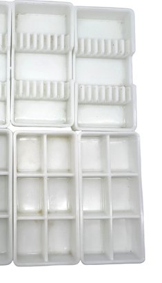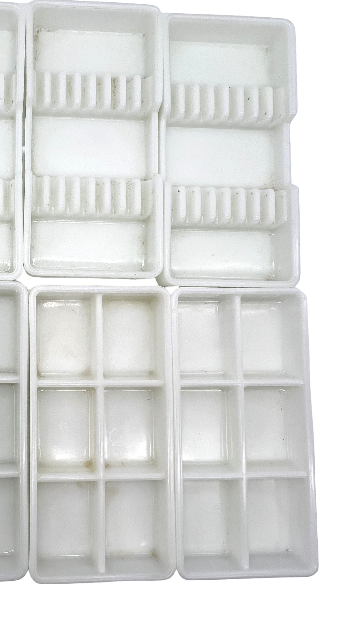 Vintage Milk glass trays were made to hold dental tools in a dentist's cabinet and could now be useful for an artist or jewelry. Good condition with minor wear - see photos