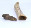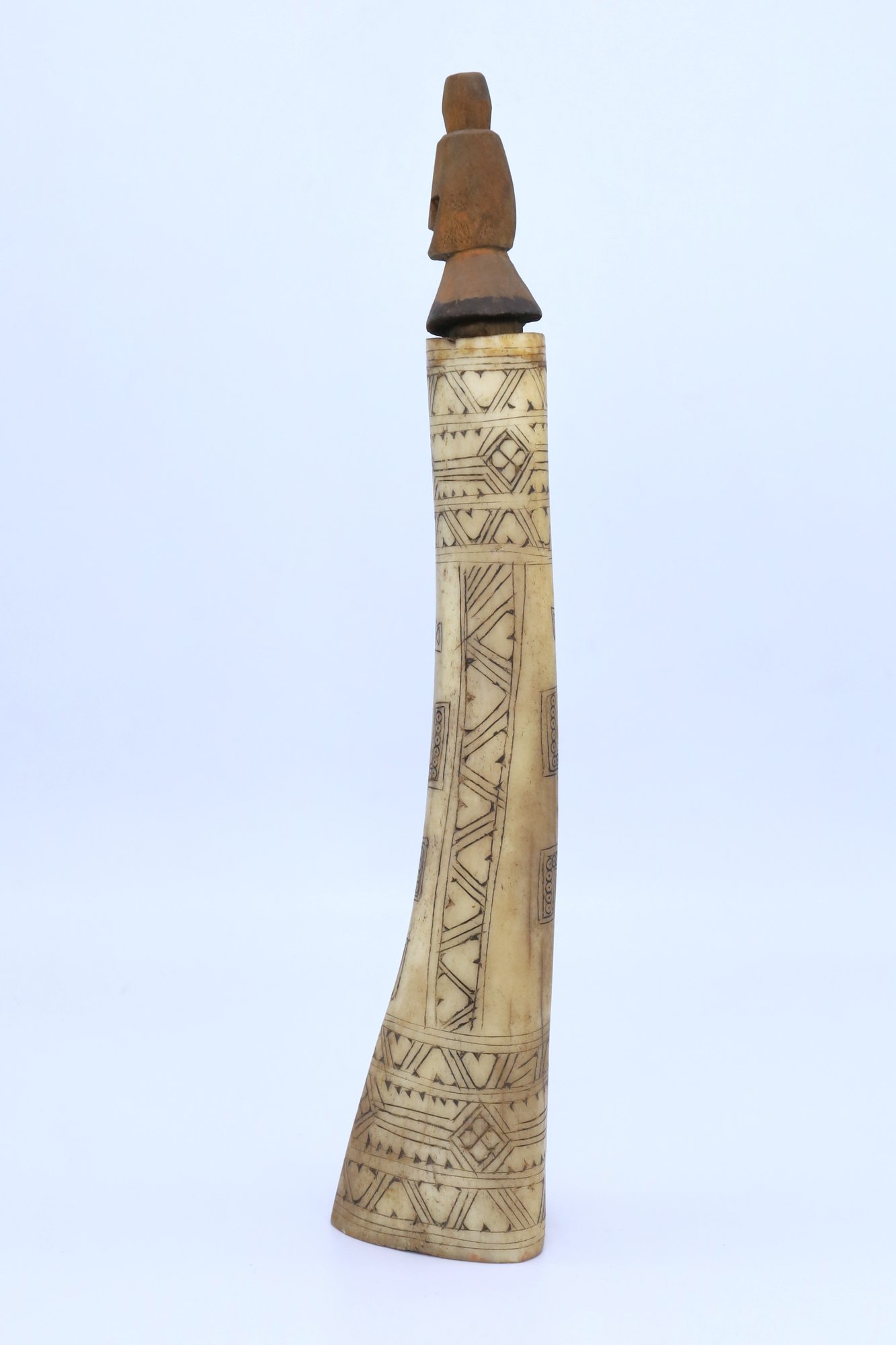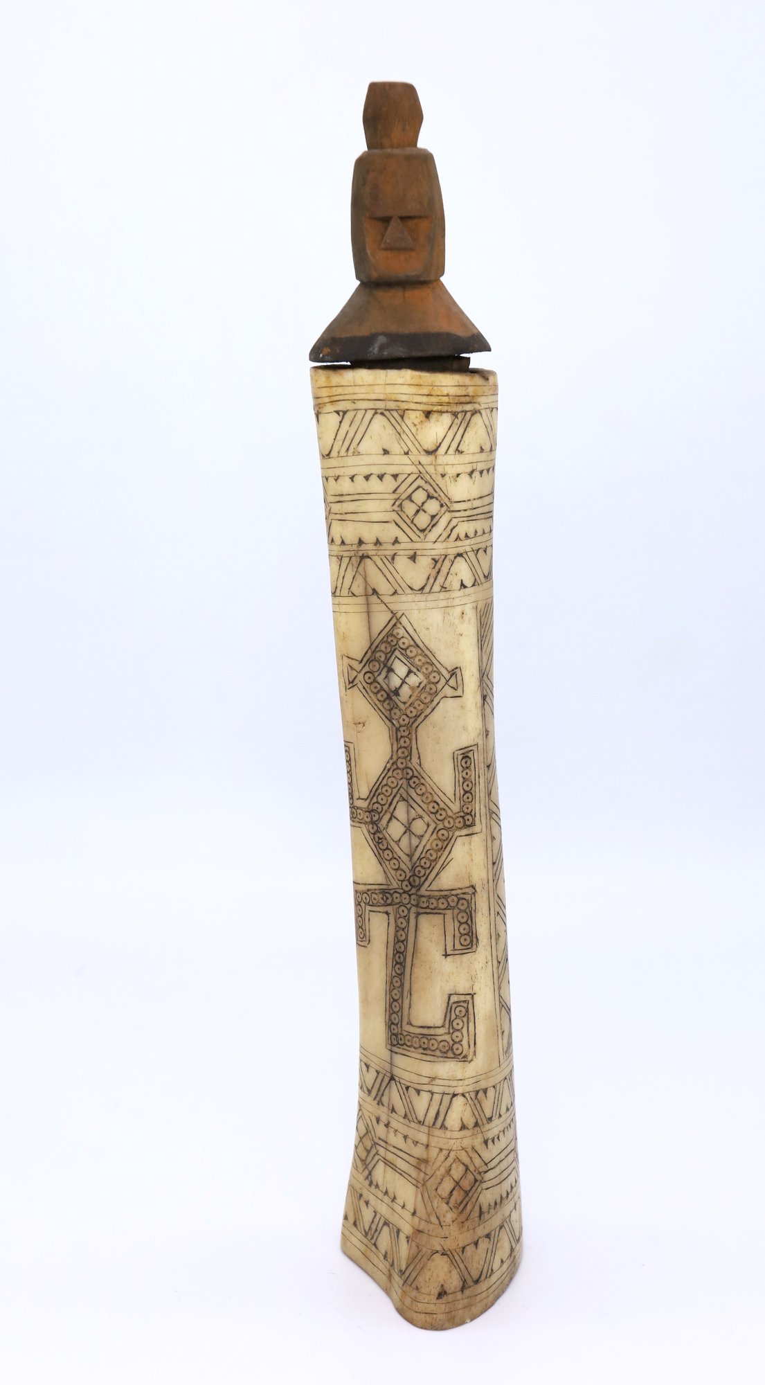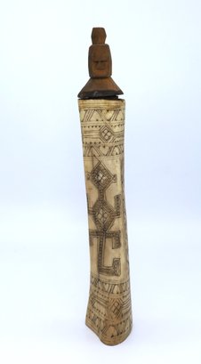 African Hand carved Scrimshaw lizard motif with wooden figure on top.