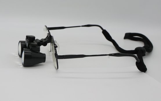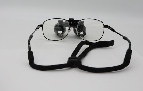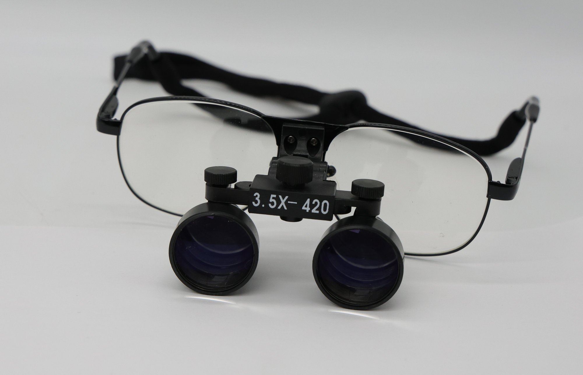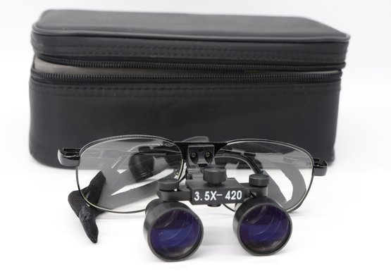 These are binocular magnifying glasses used by medical professionals. They feature a magnification of 3.5x, the highest available in Galilean-style loupes. The working distance is 420 mm (about 16.5 inches), as indicated by the "420" on the loupes. Case included