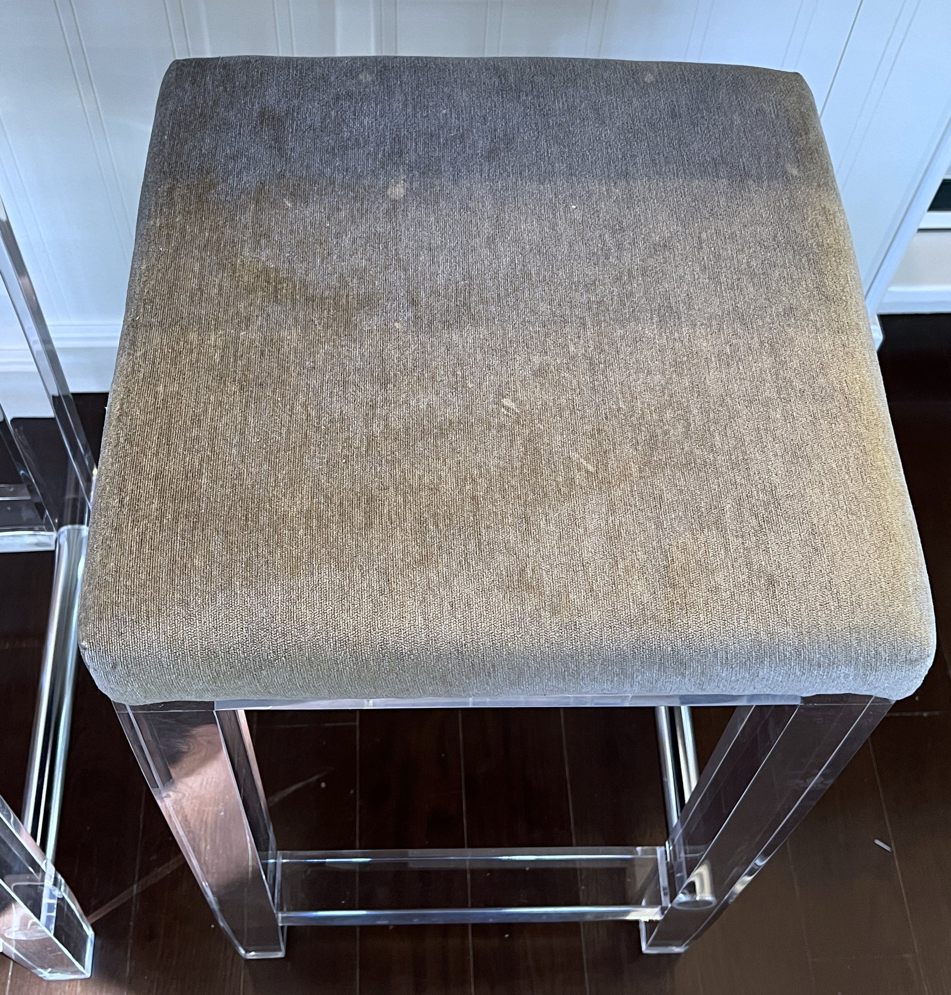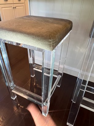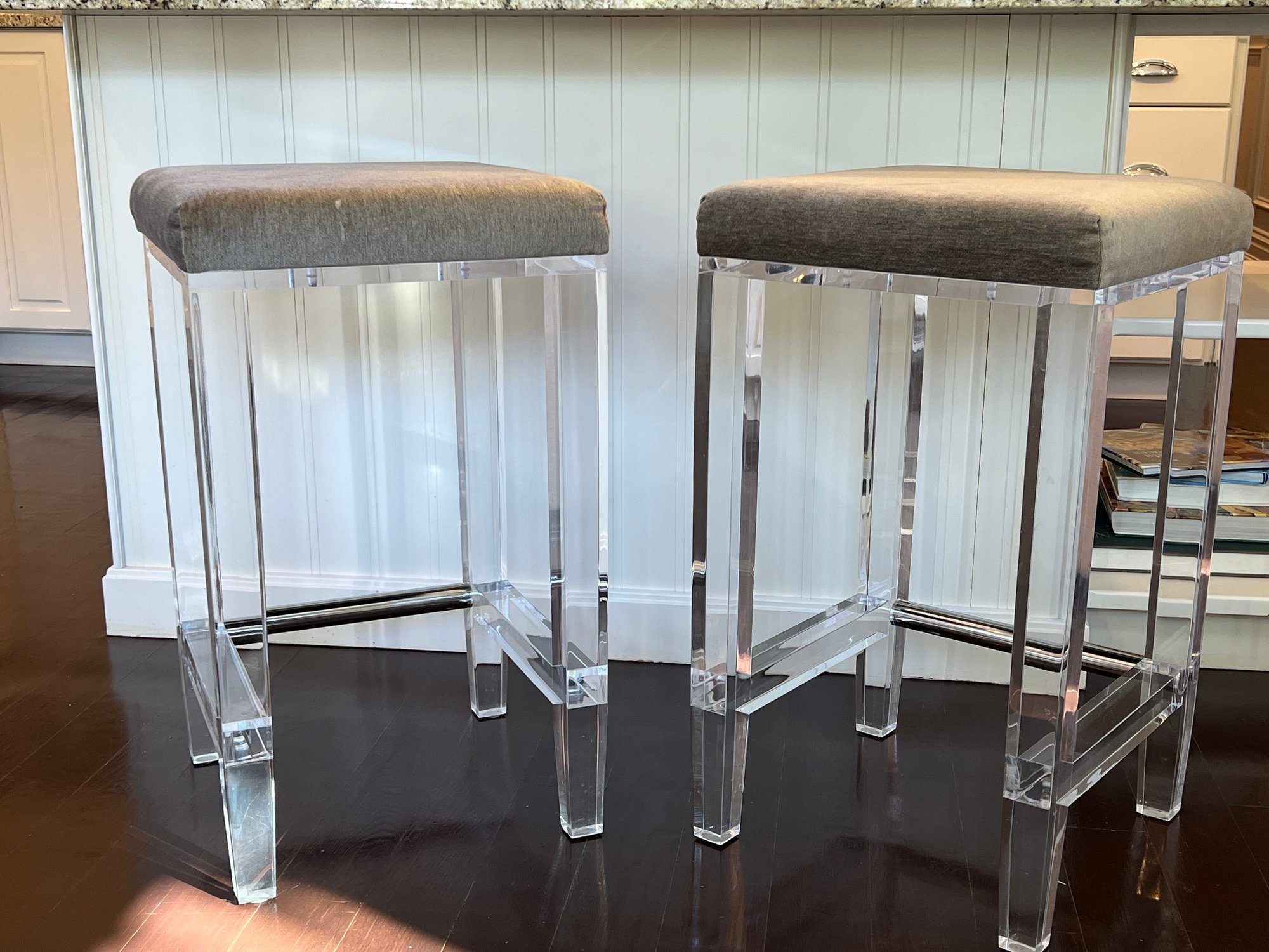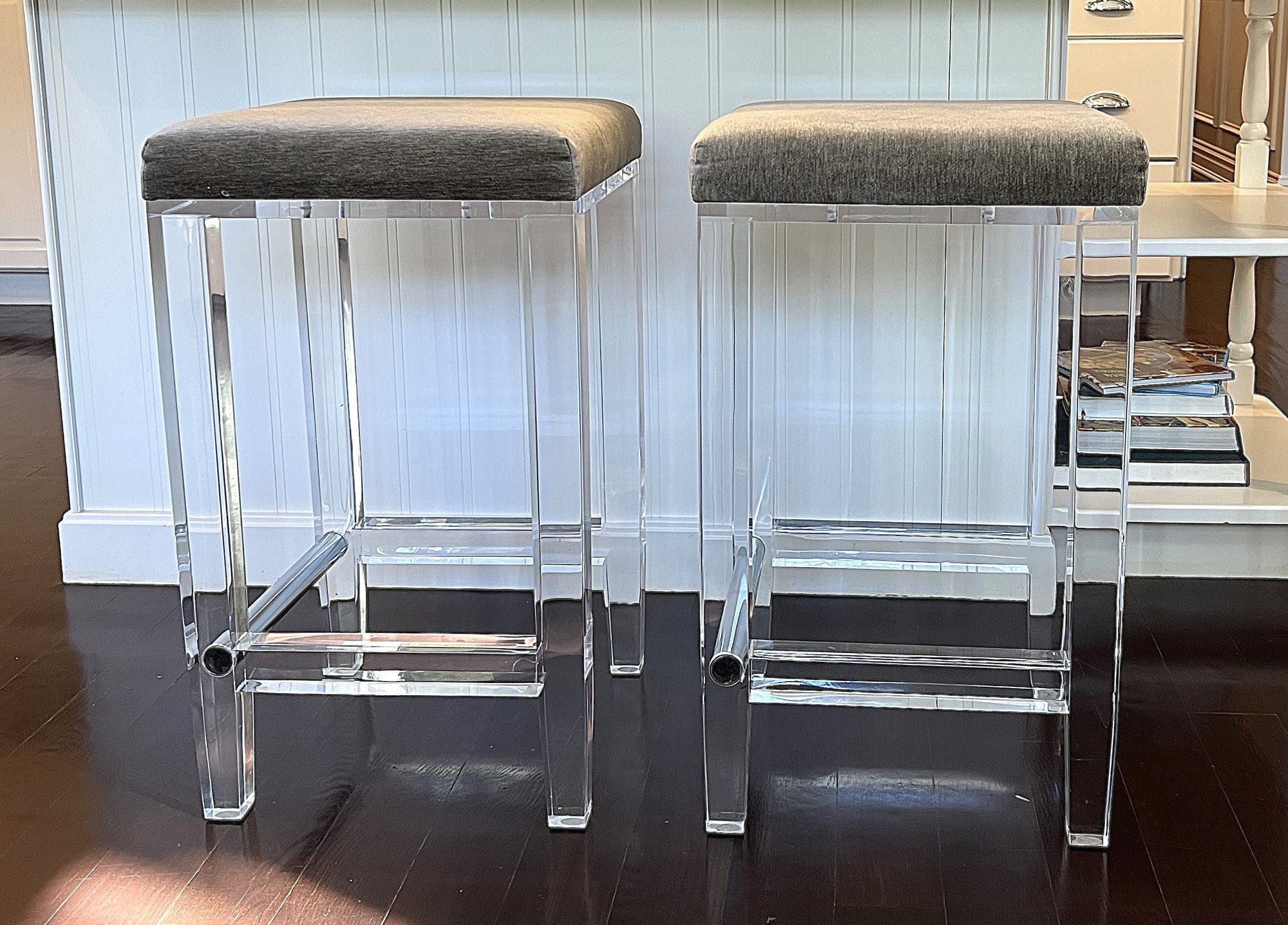 Pair of acrylic counter stools with gray fabric and deep cushions for comfort.