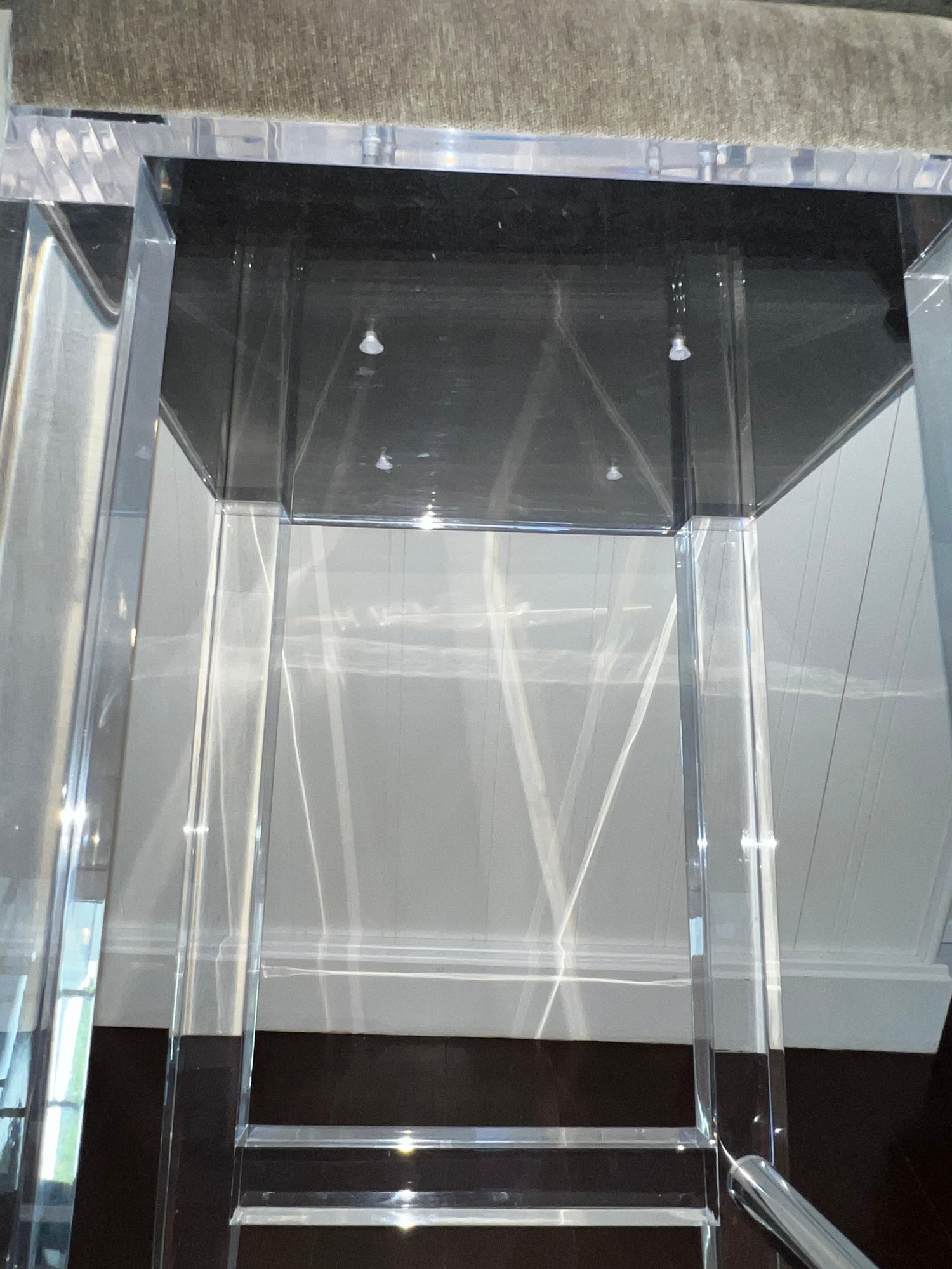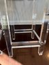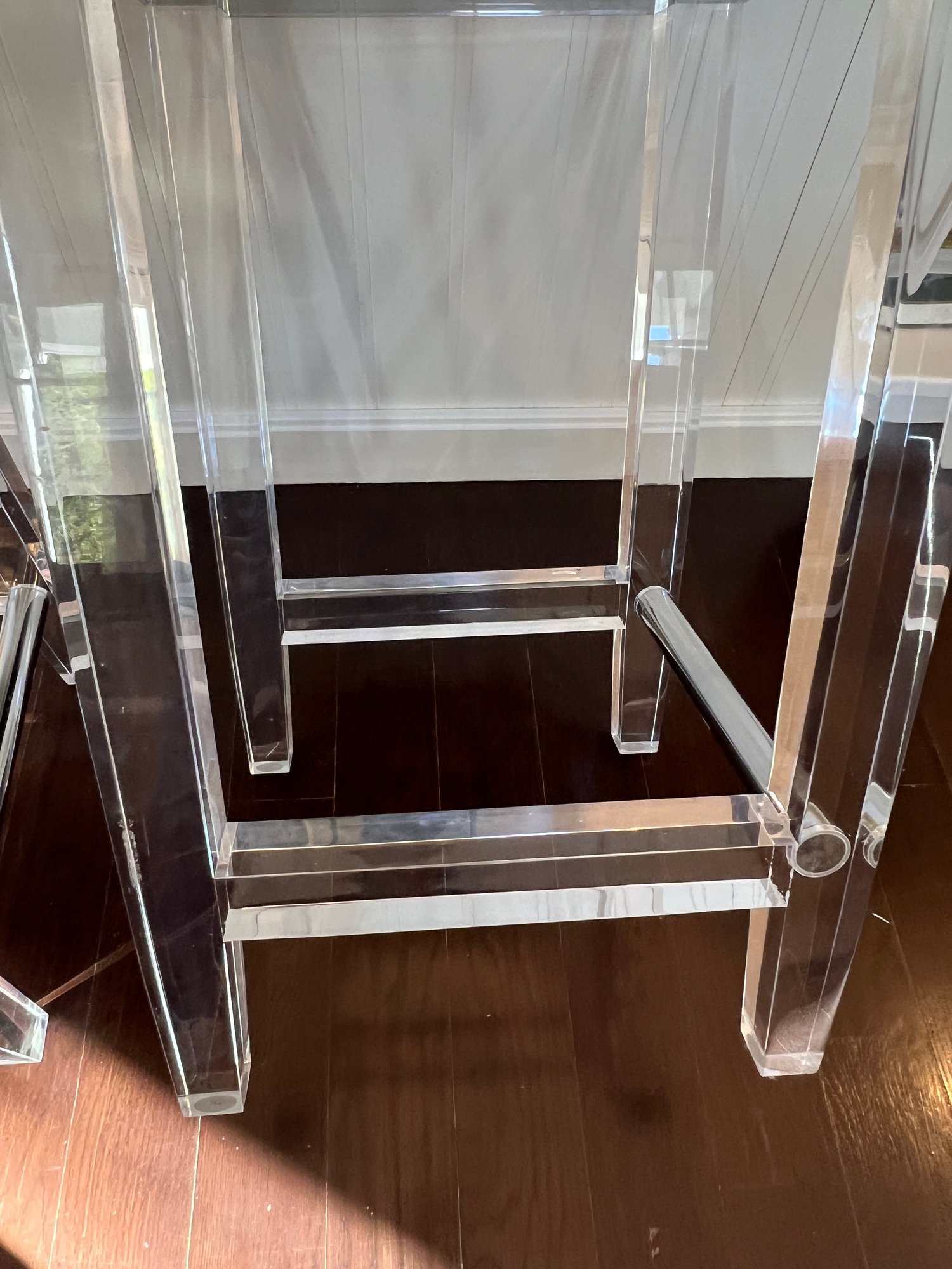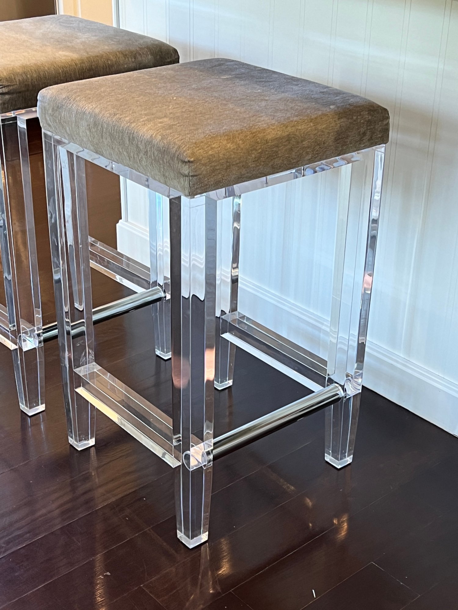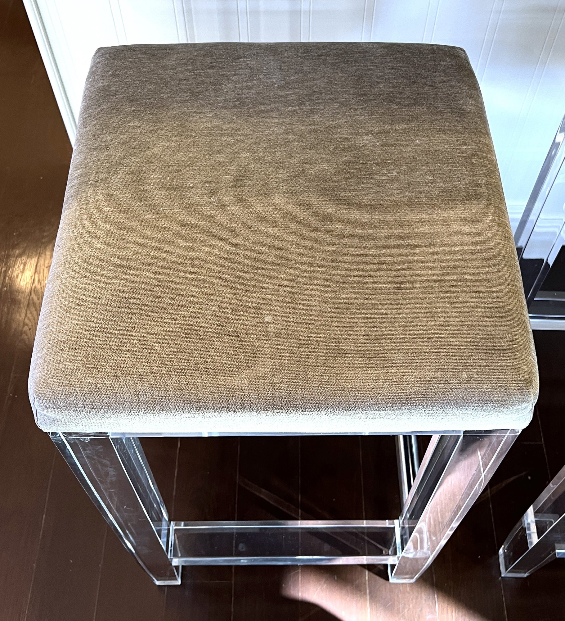 Pair of acrylic counter stools with gray fabric and deep cushions for comfort.