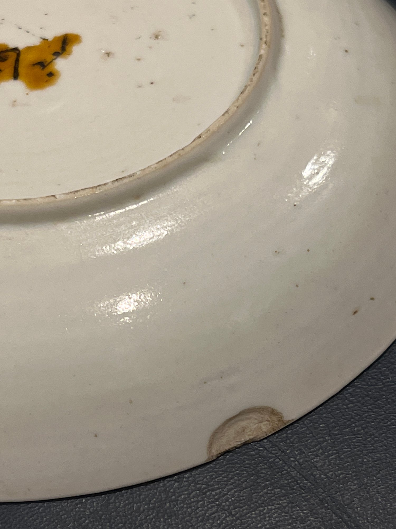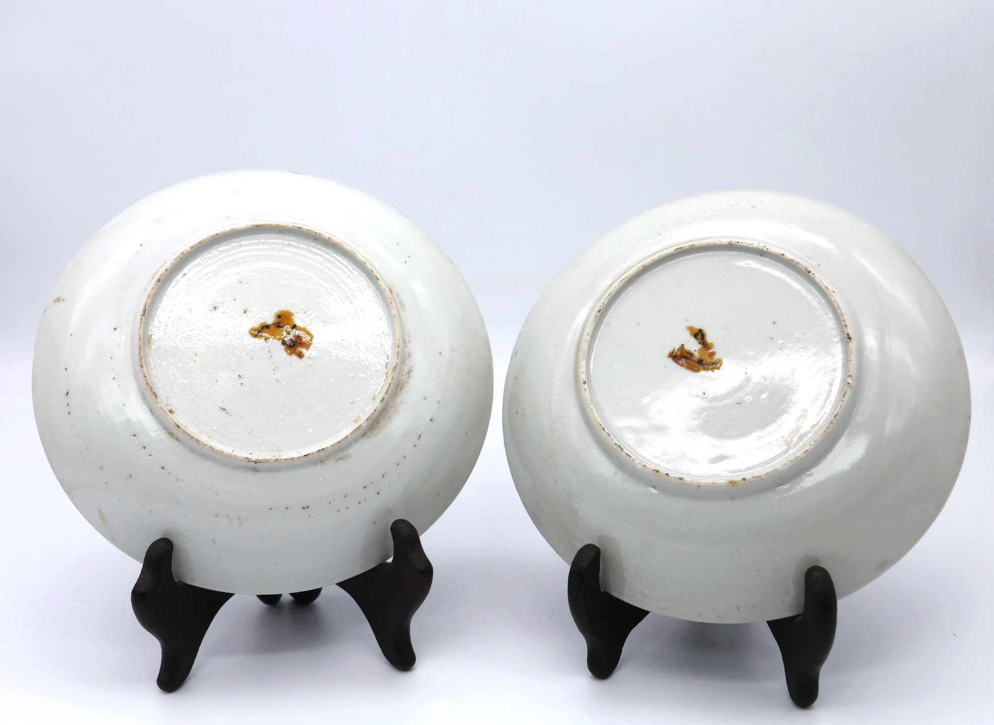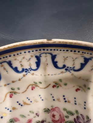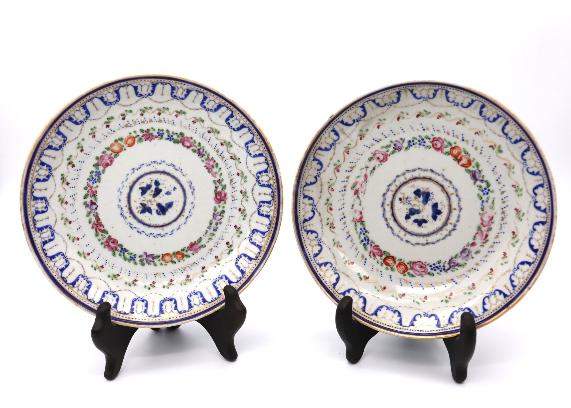 Pair of antique Chinese export dishes hand painted, cobalt blue, pink,green,orange,red and gold(worn)