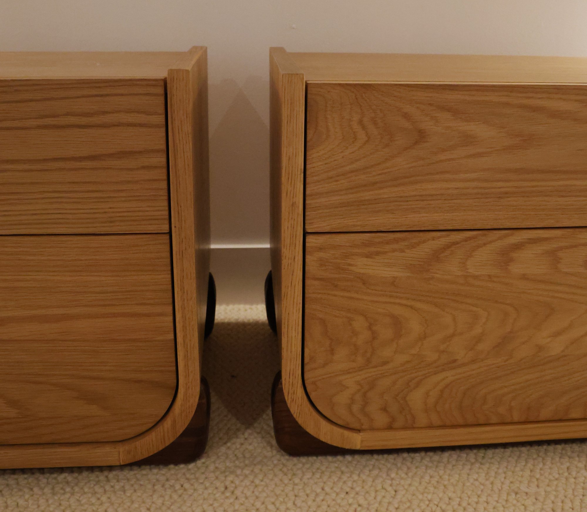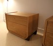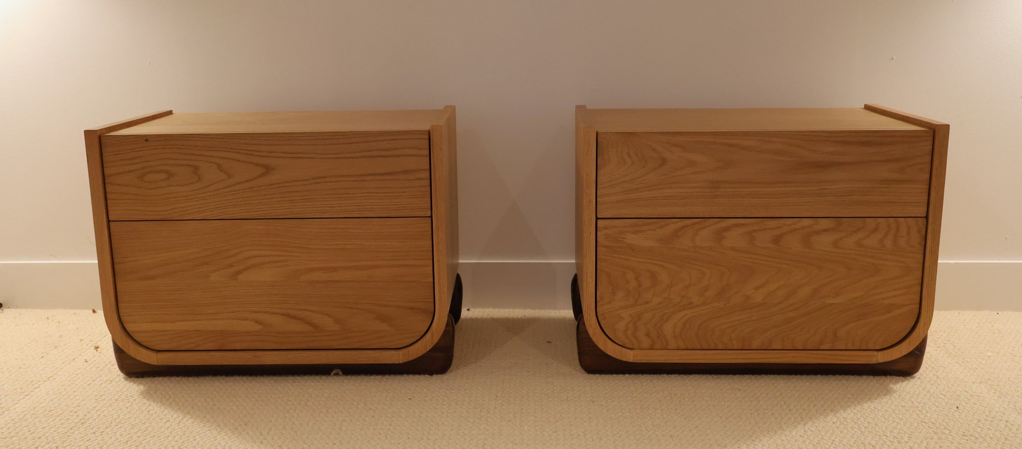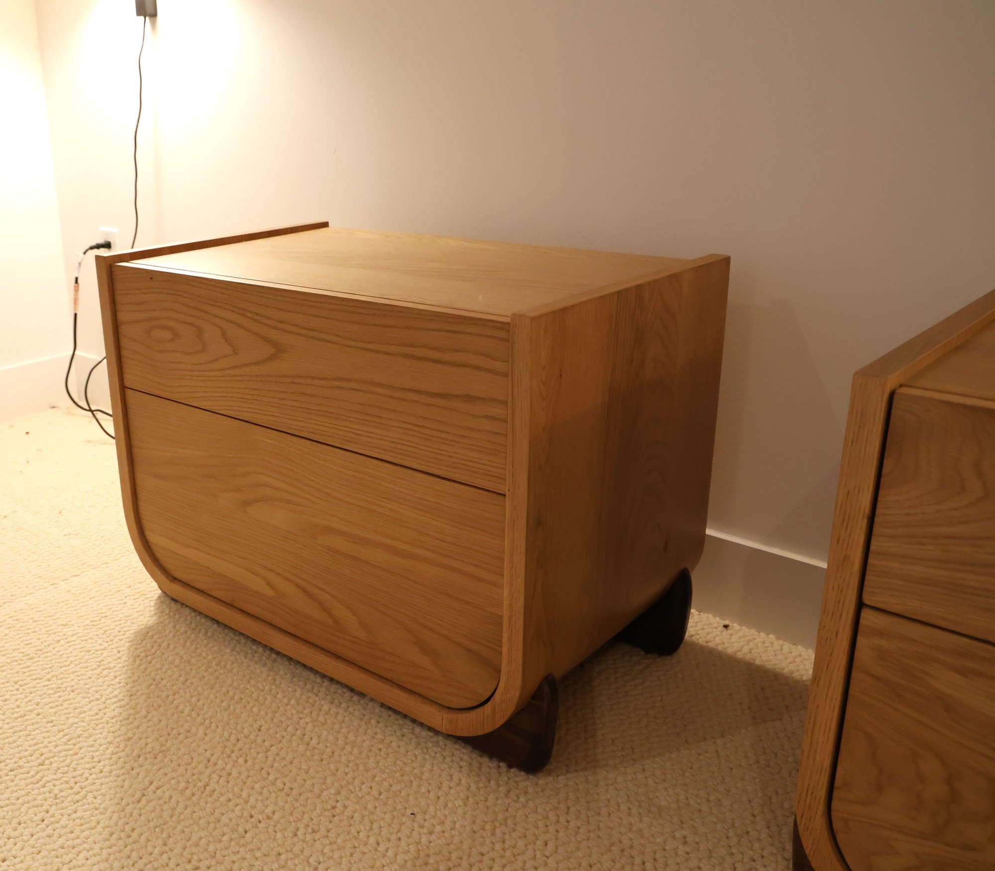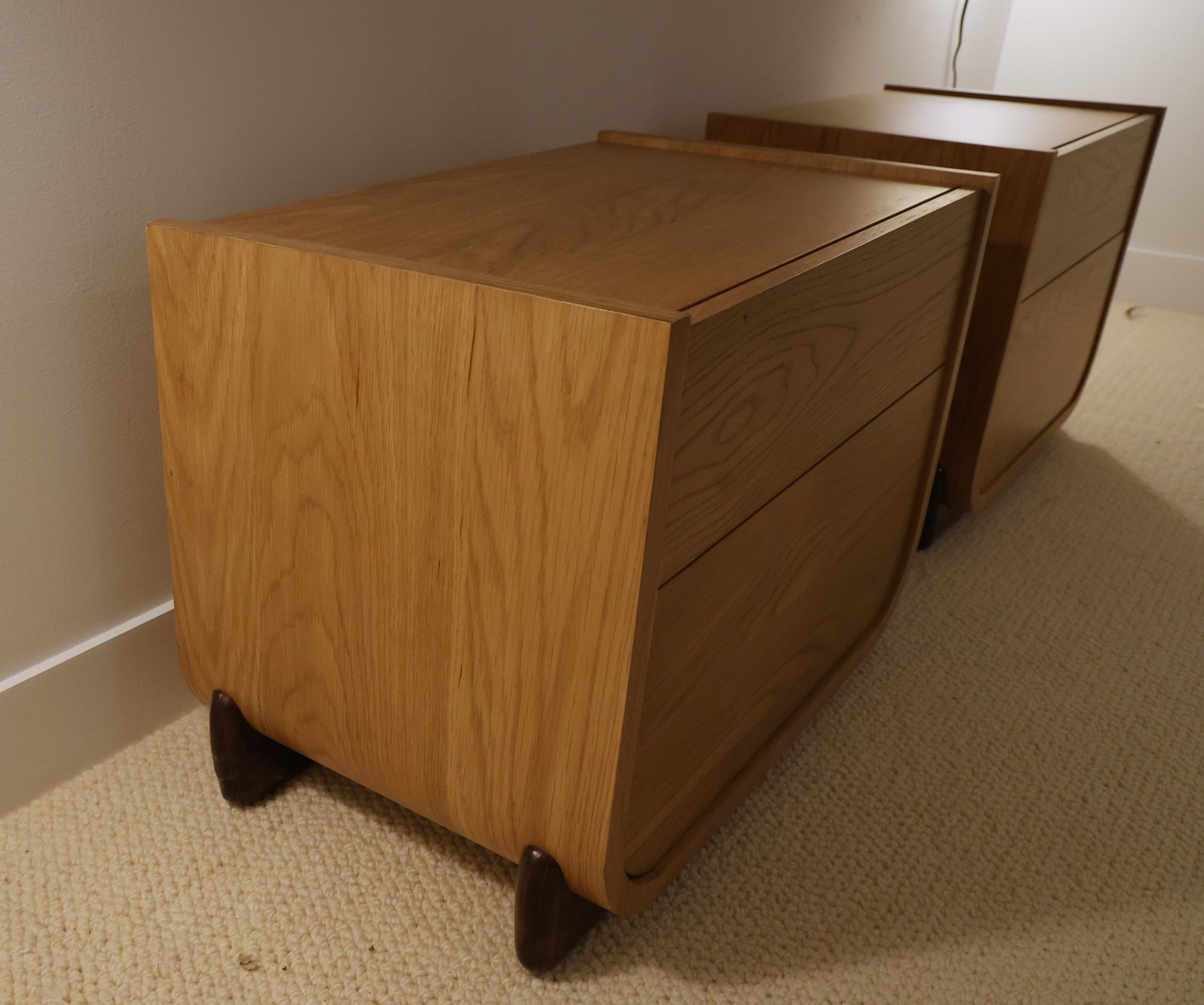 End/night stands designed by Jannie Ellenberg in two types of wood. Natural oak veneer frame is set off by high gloss walnut legs at it's curved base. Two spacious push to open drawers. Crate and barrel did a great job with these very sturdy stands.